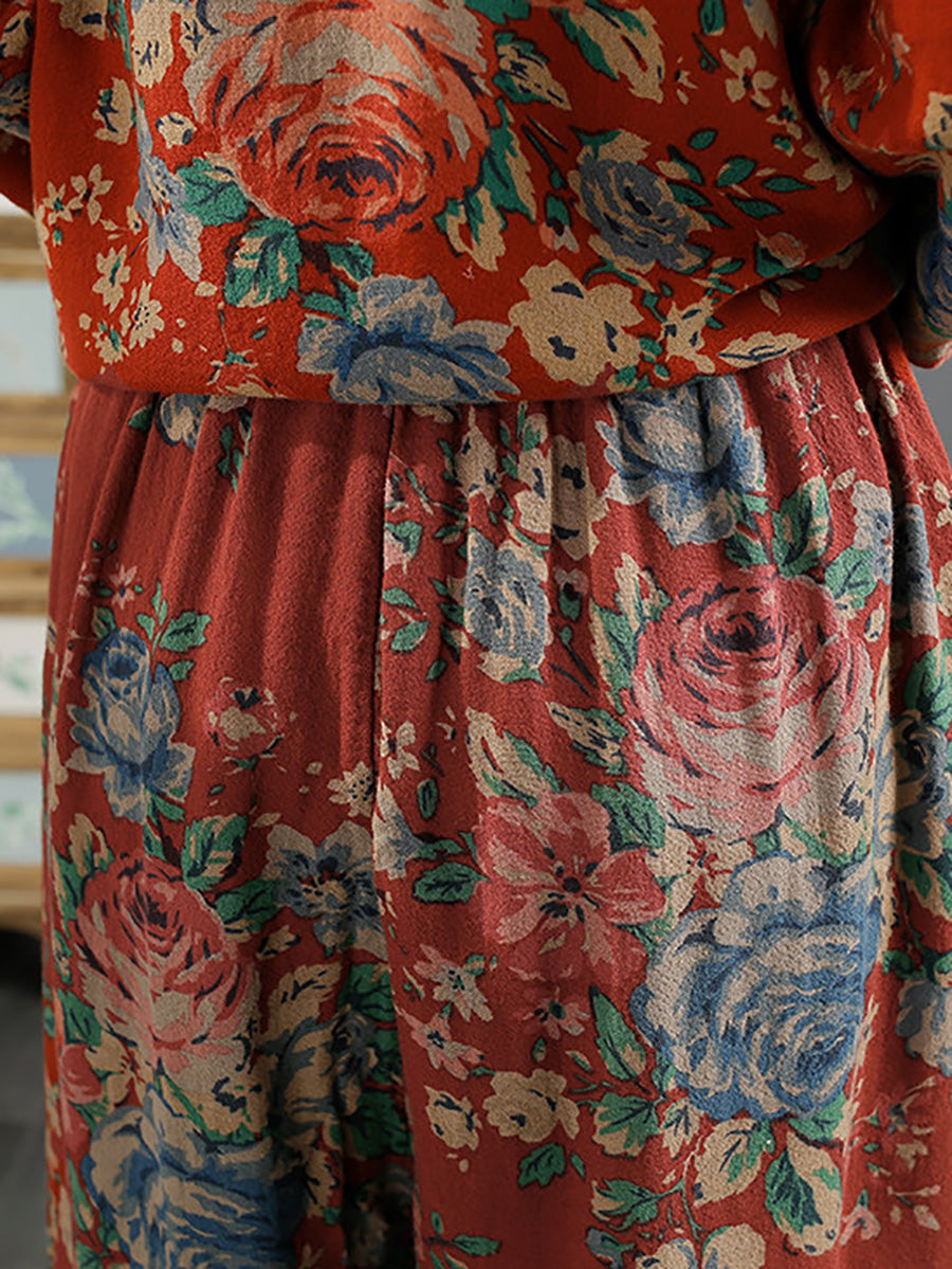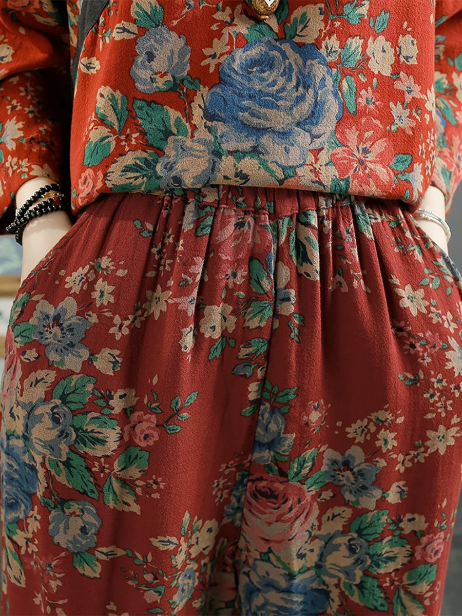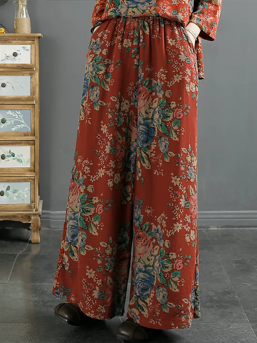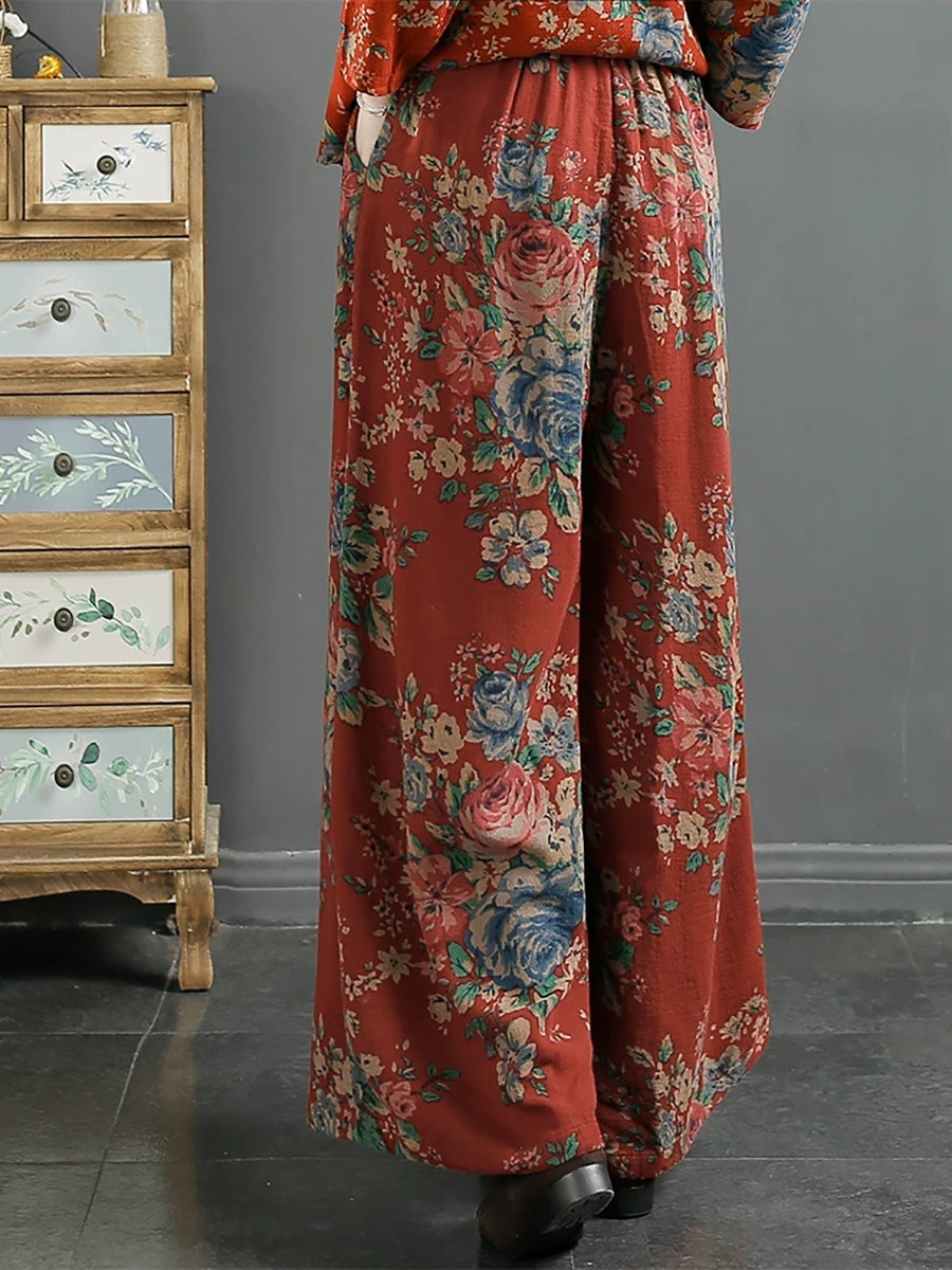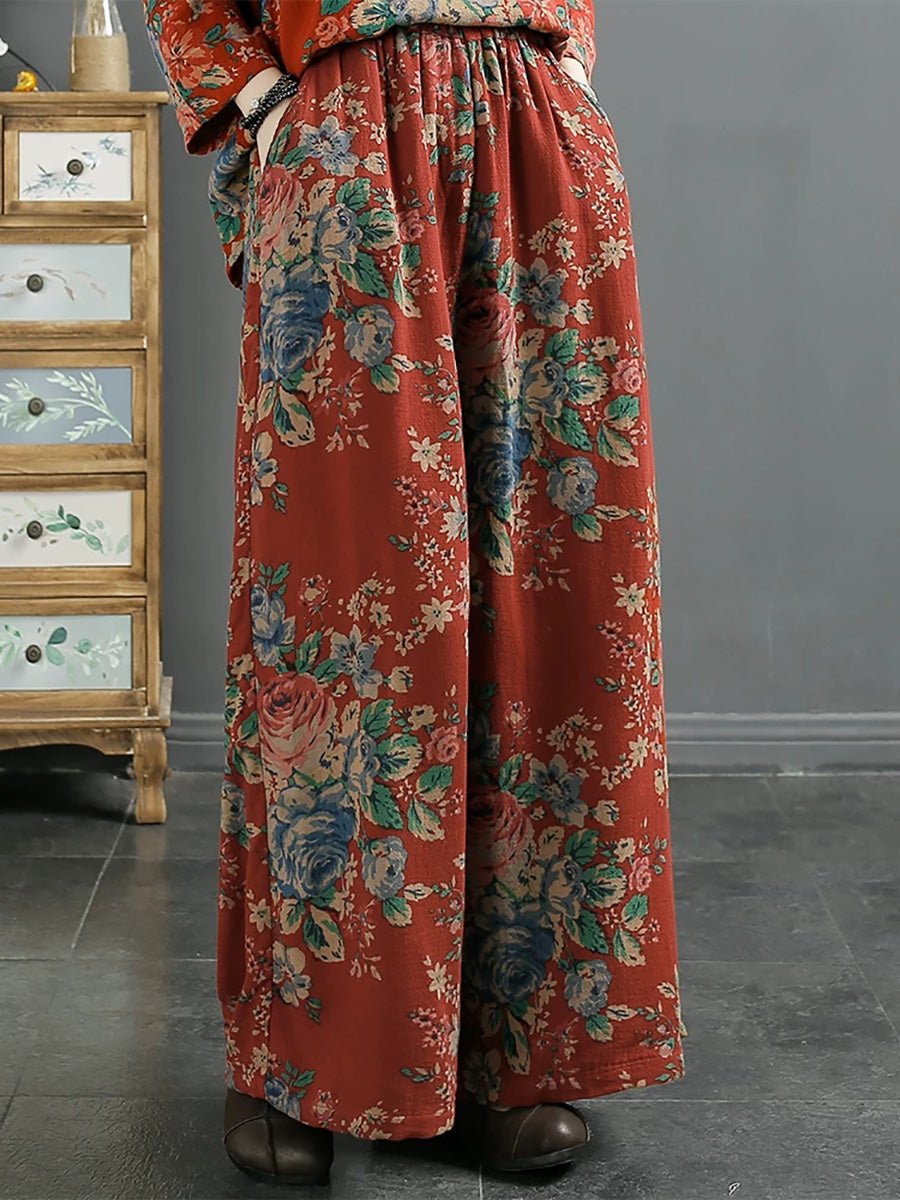 Women Spring Vintage Flower Cotton Wide-leg Pants