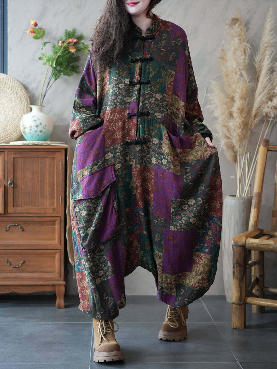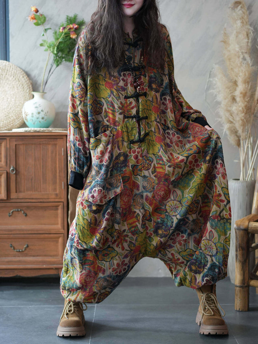 Women Spring Vintage Flower Patch Low Crotch Jumpsuits