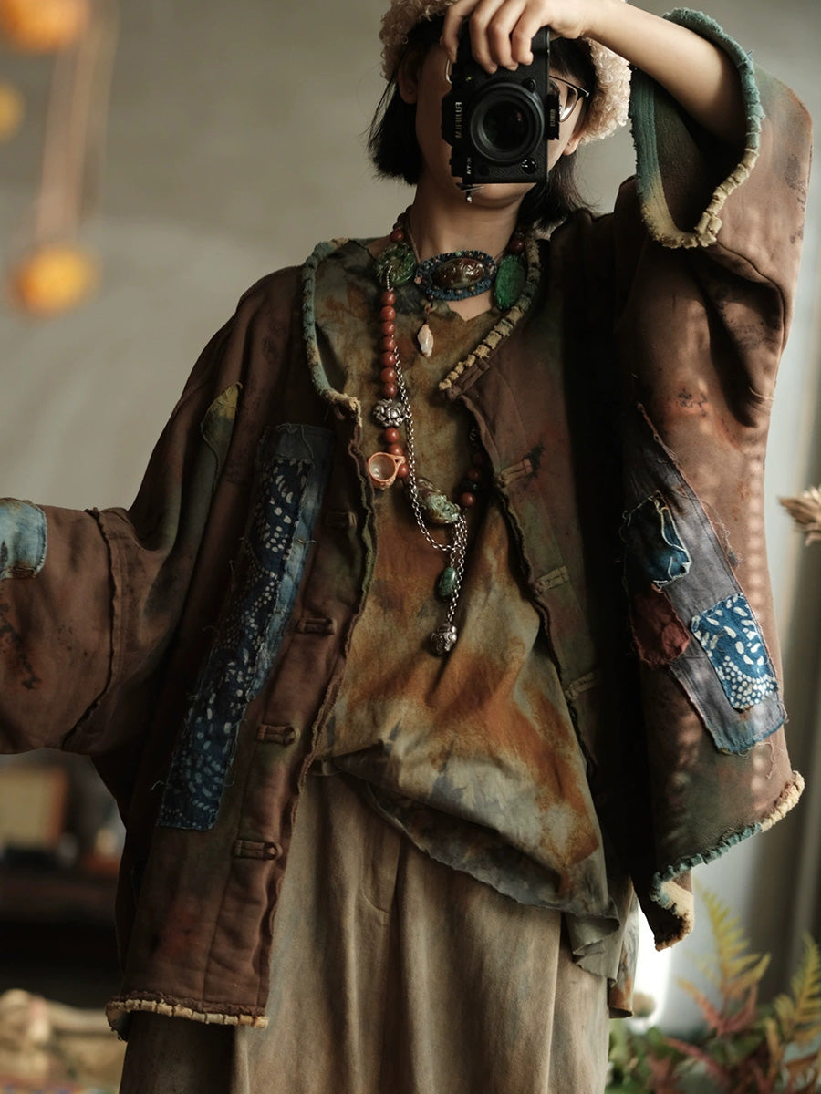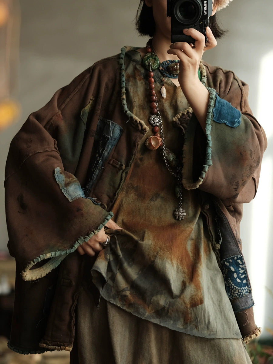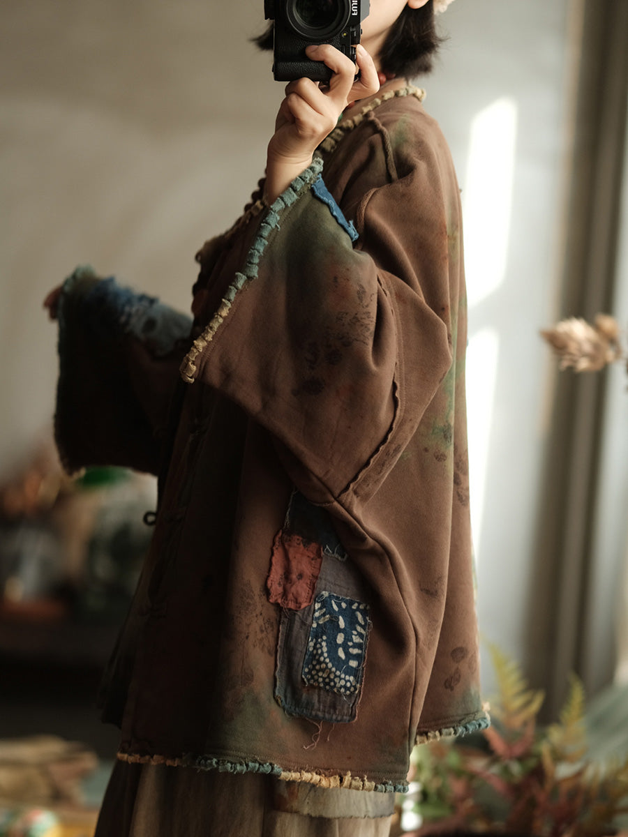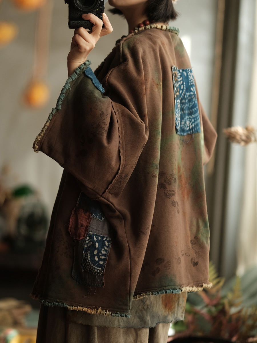 Women Spring Vintage Patchwork O-Neck Shirt Coat