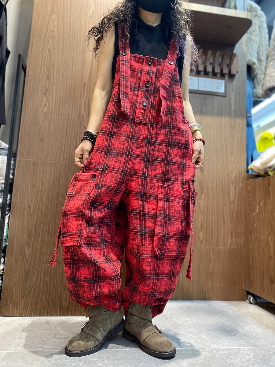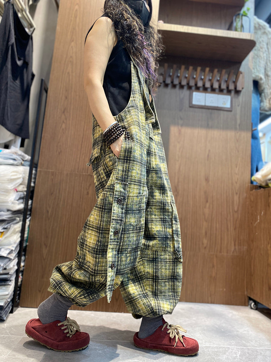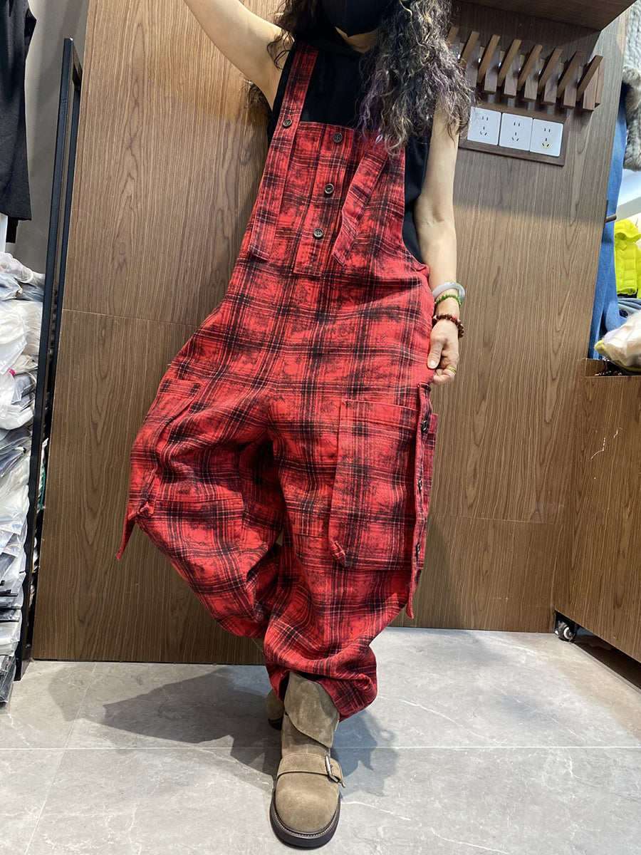Women Spring Vintage Plaid Loose Jumpsuits