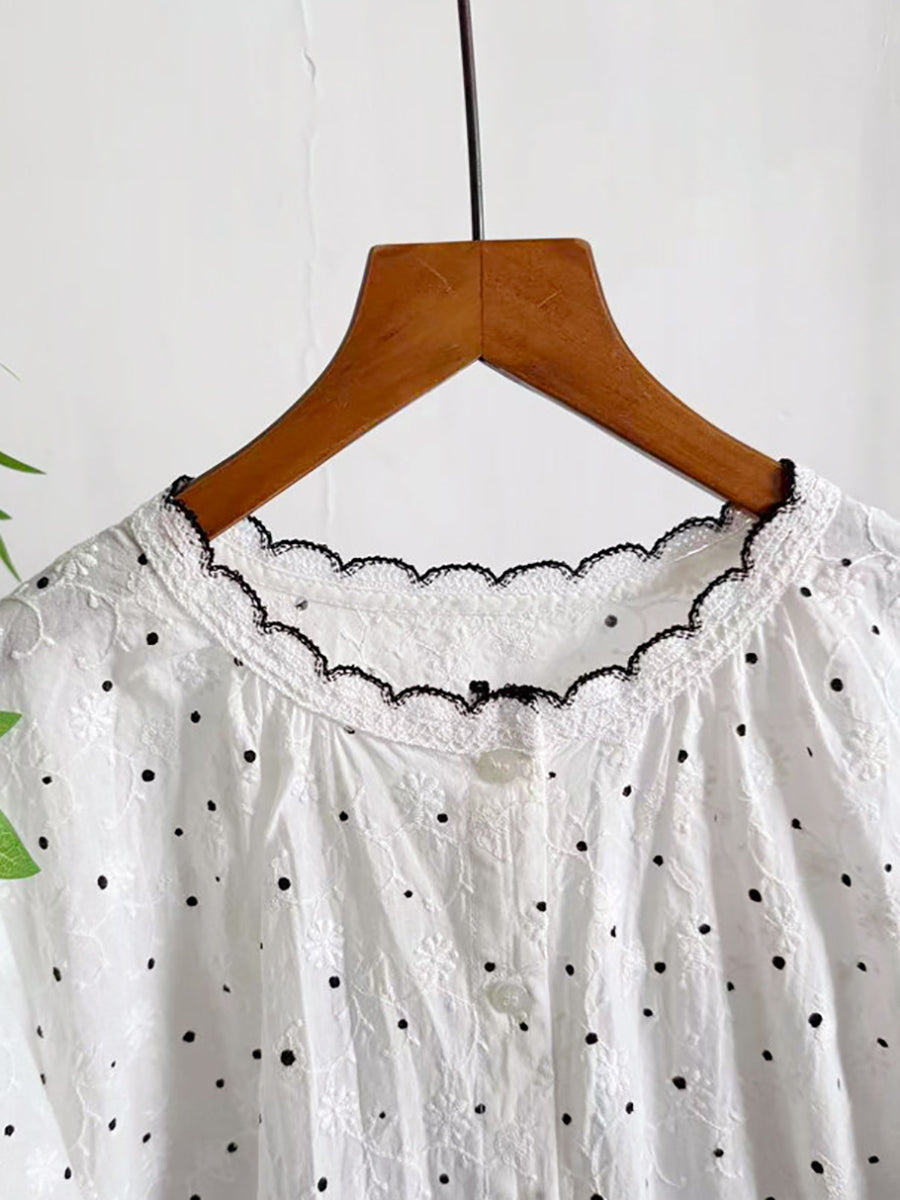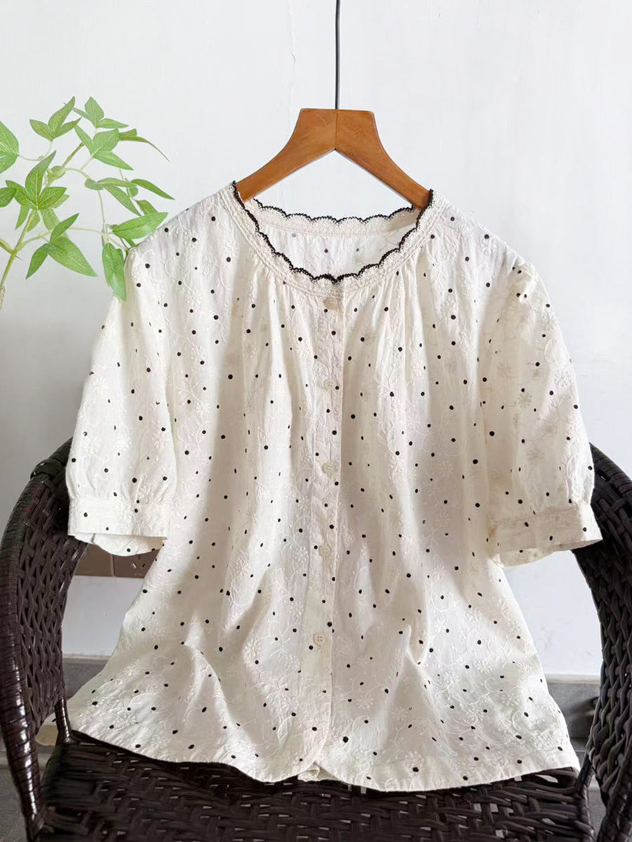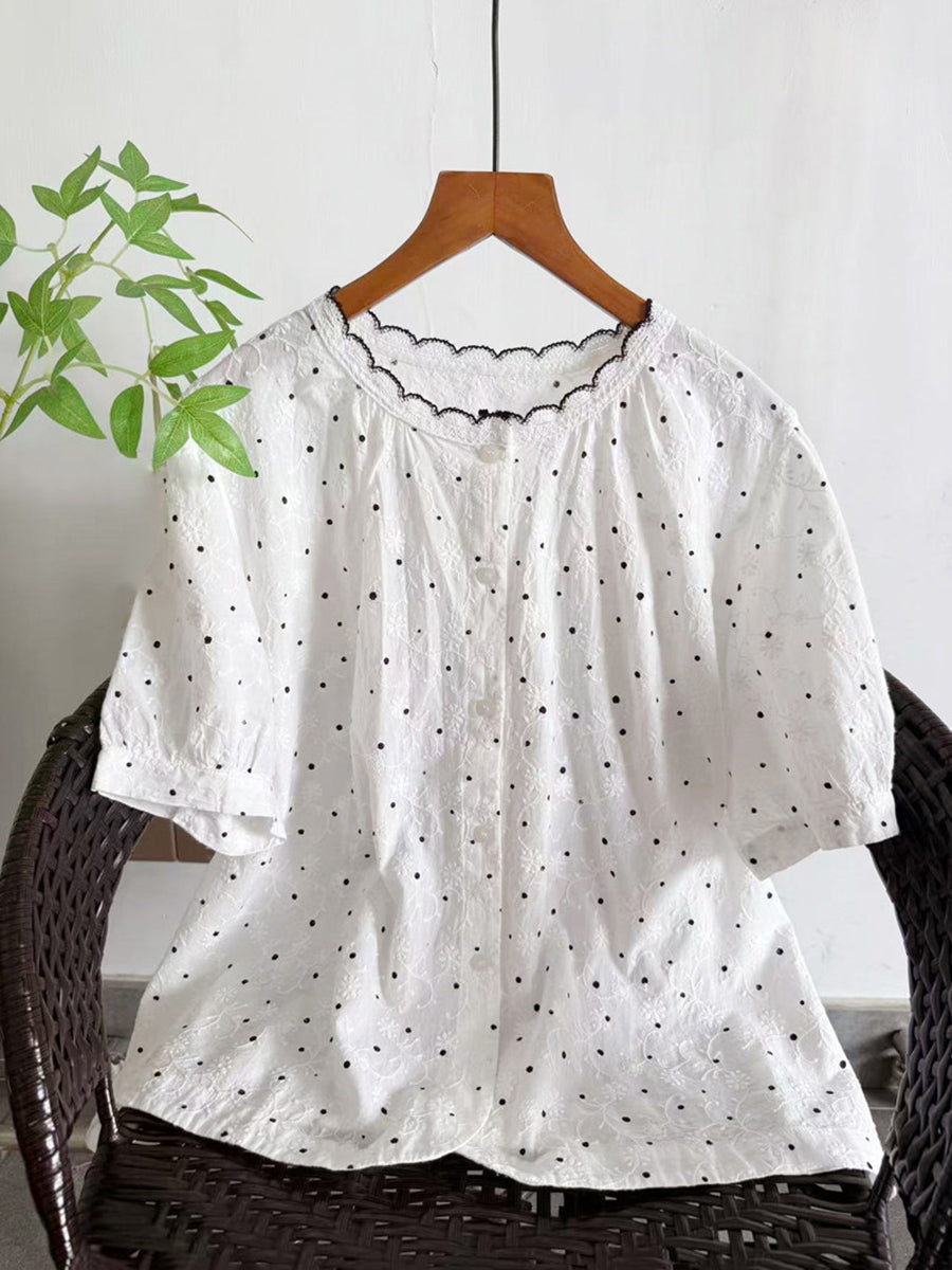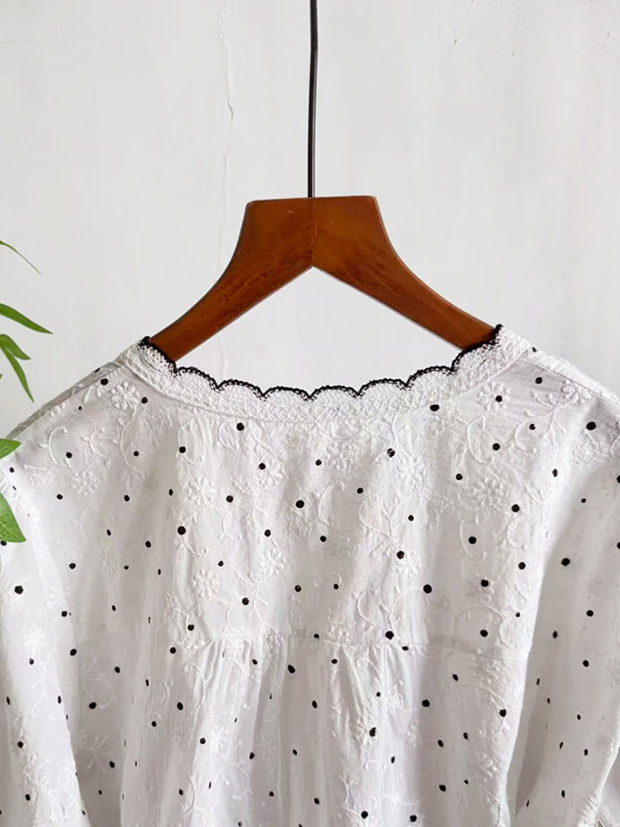 Women Summer Artsy Dot Embroidery 100%Cotton Blouse