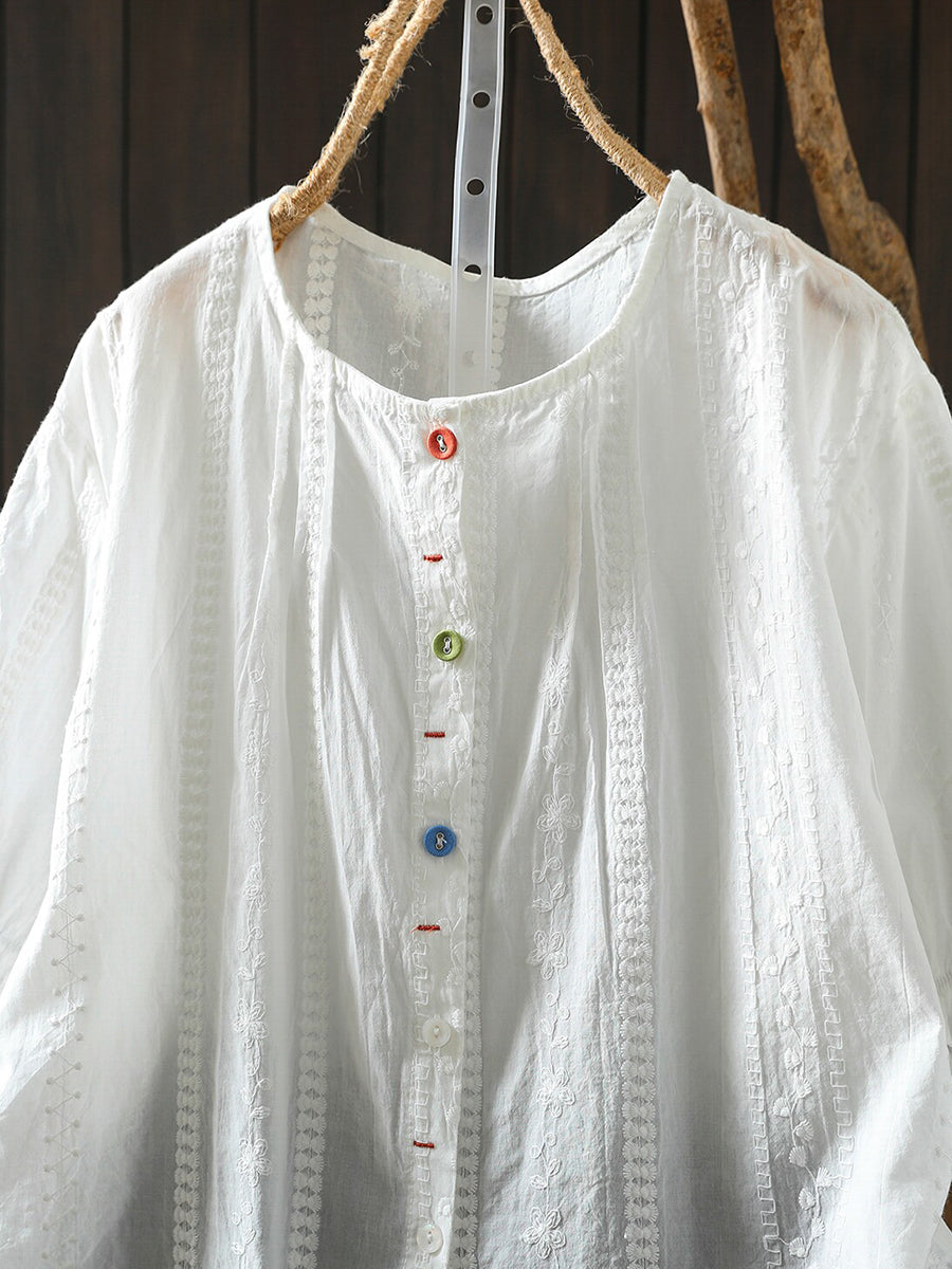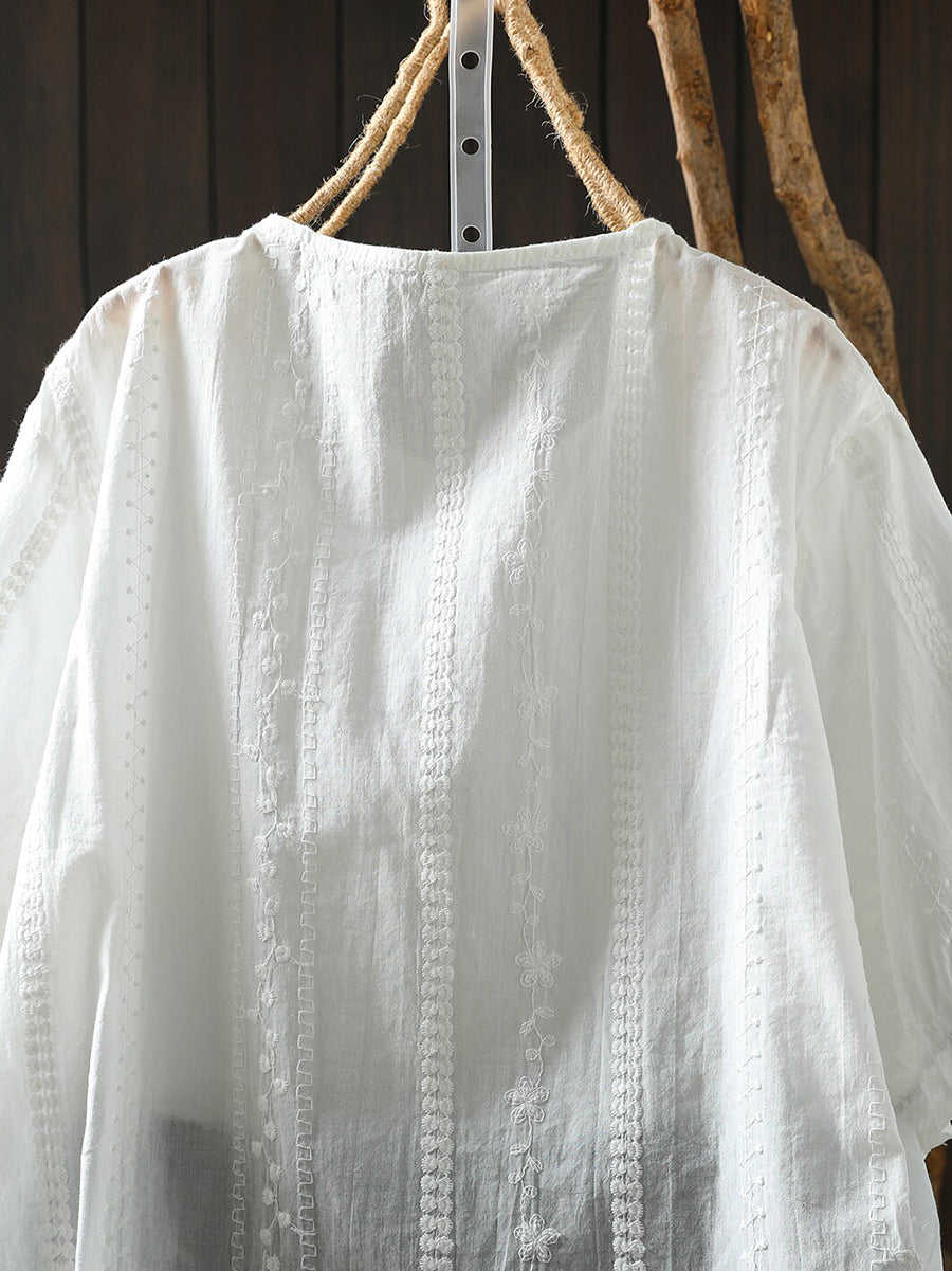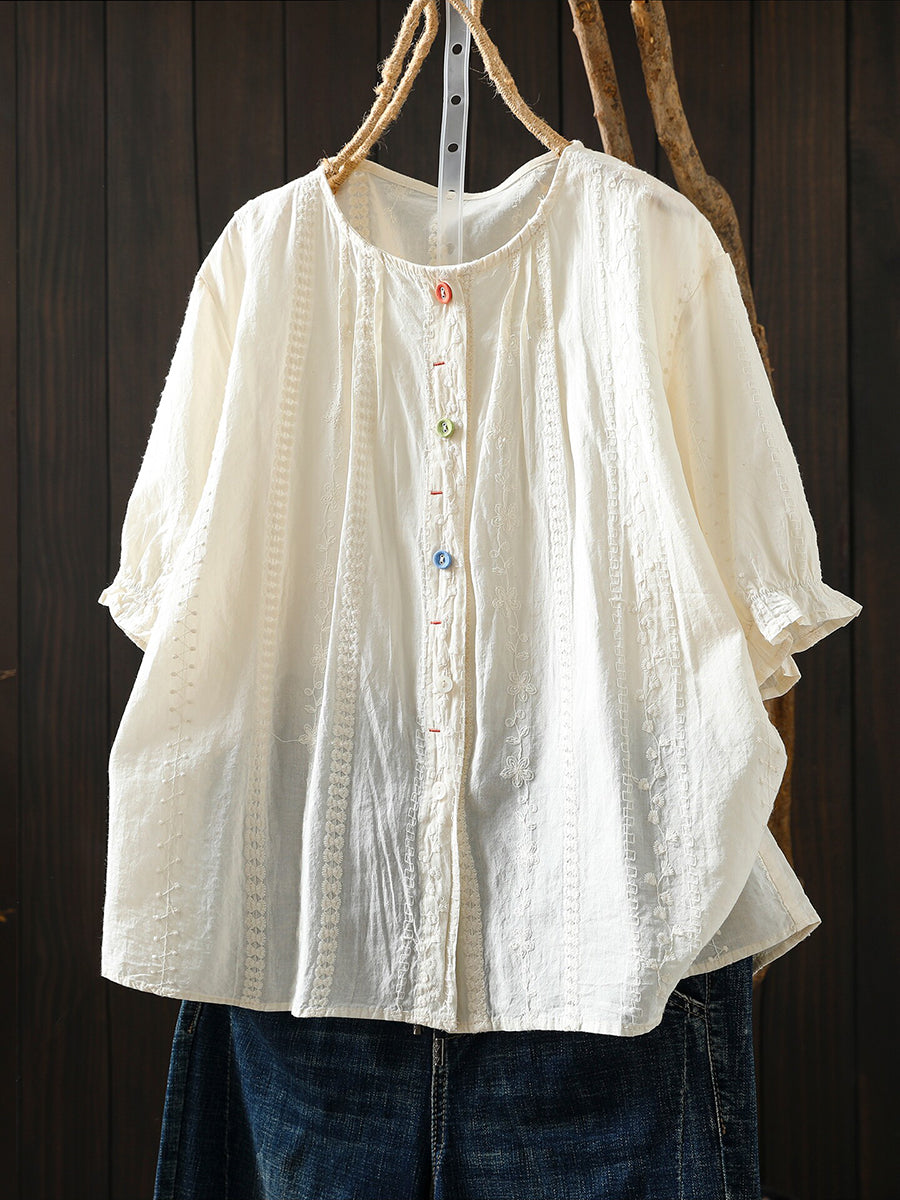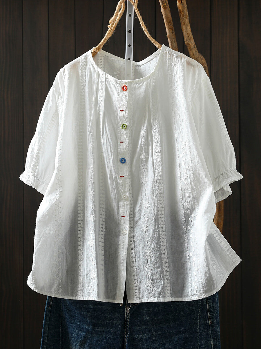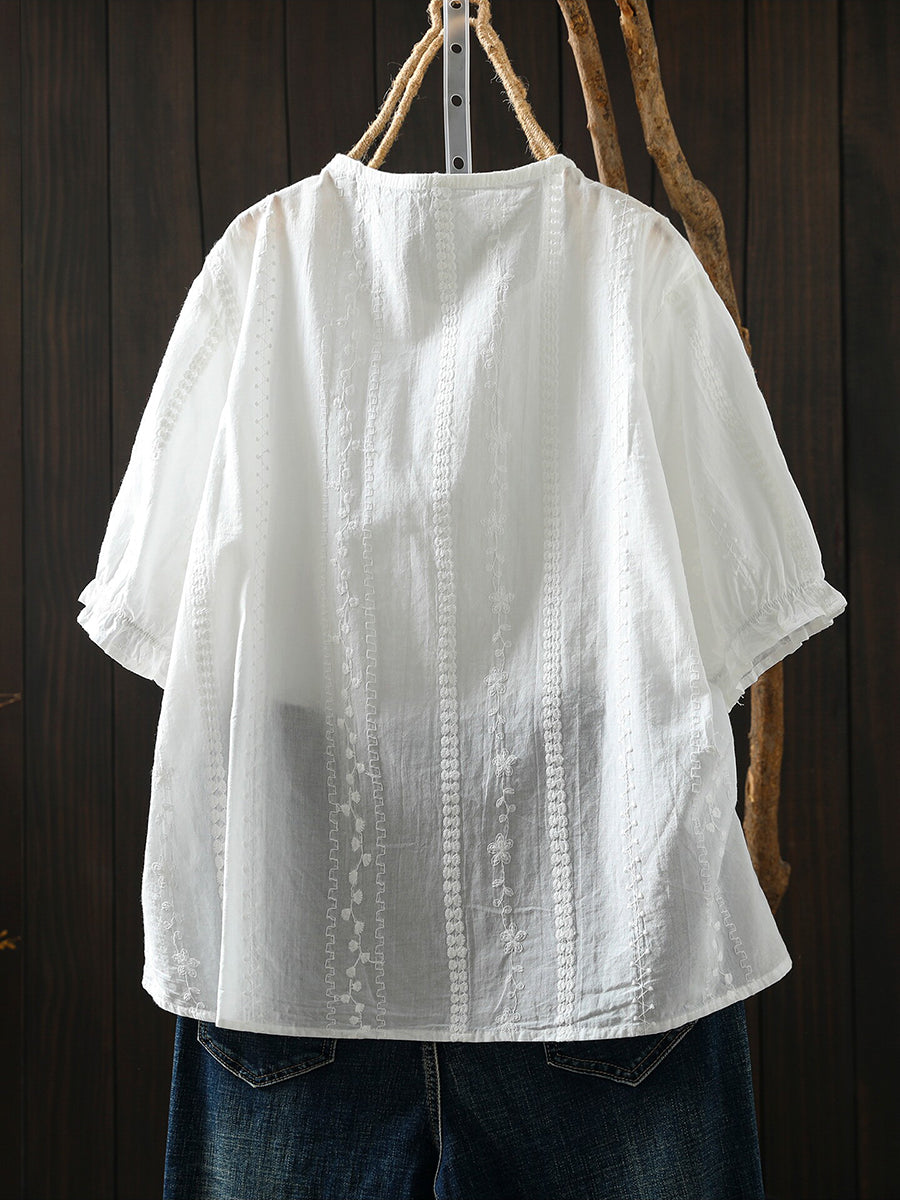 Women Summer Artsy Embroidery Cotton O-Neck T-Shirt