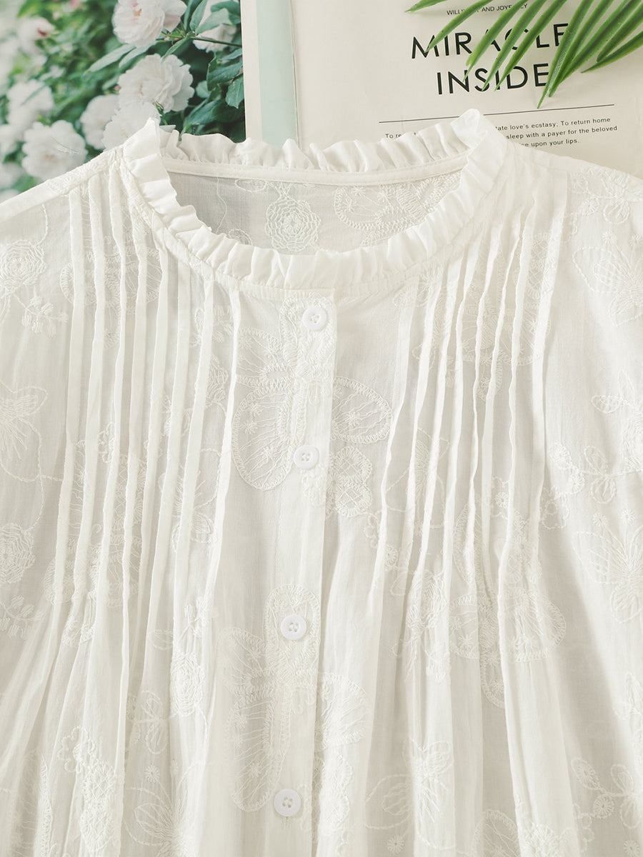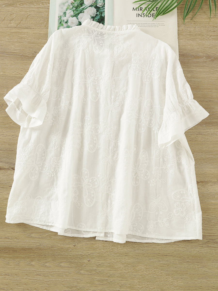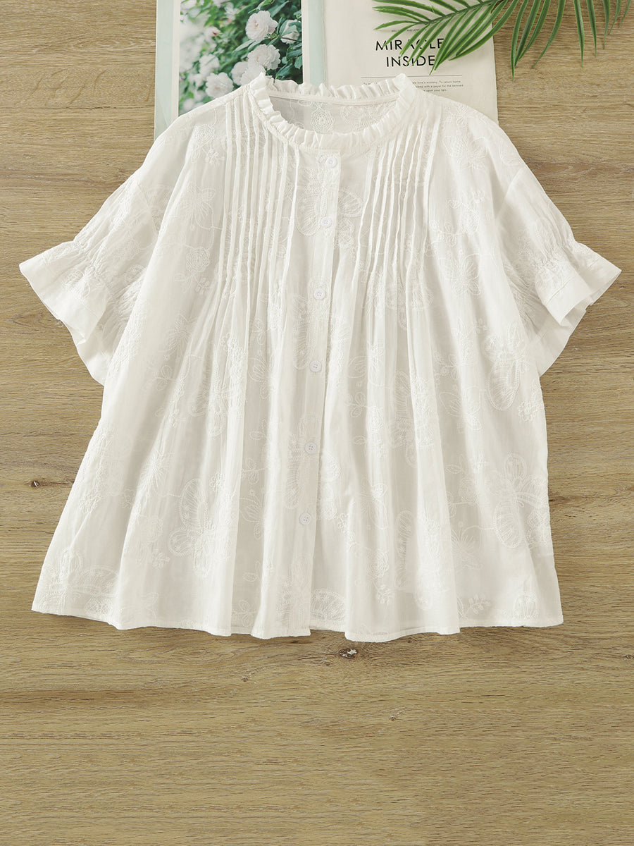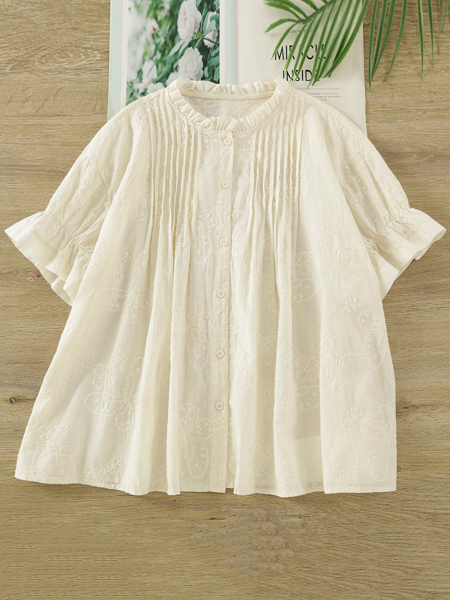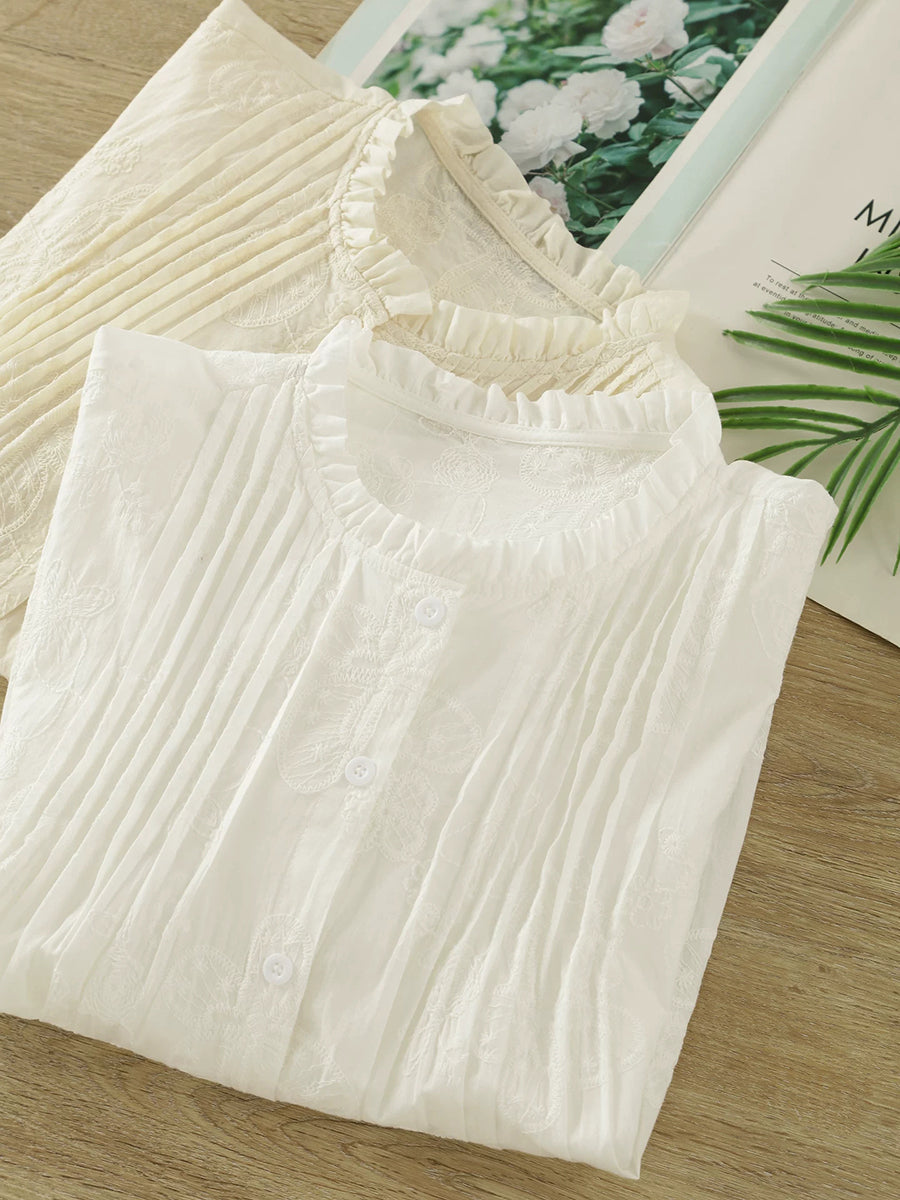 Women Summer Artsy Embroidery Shirred 100%Cotton Blouse