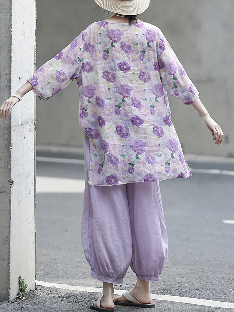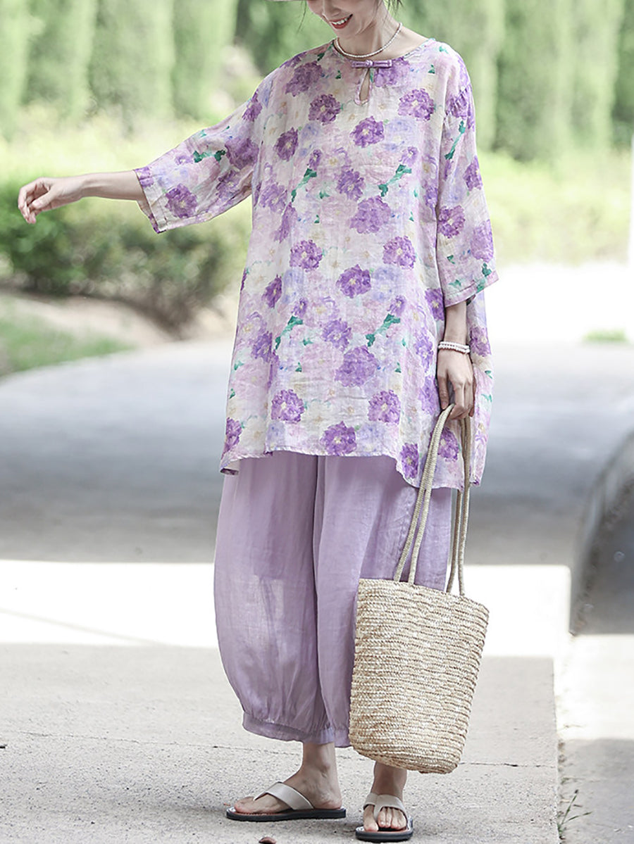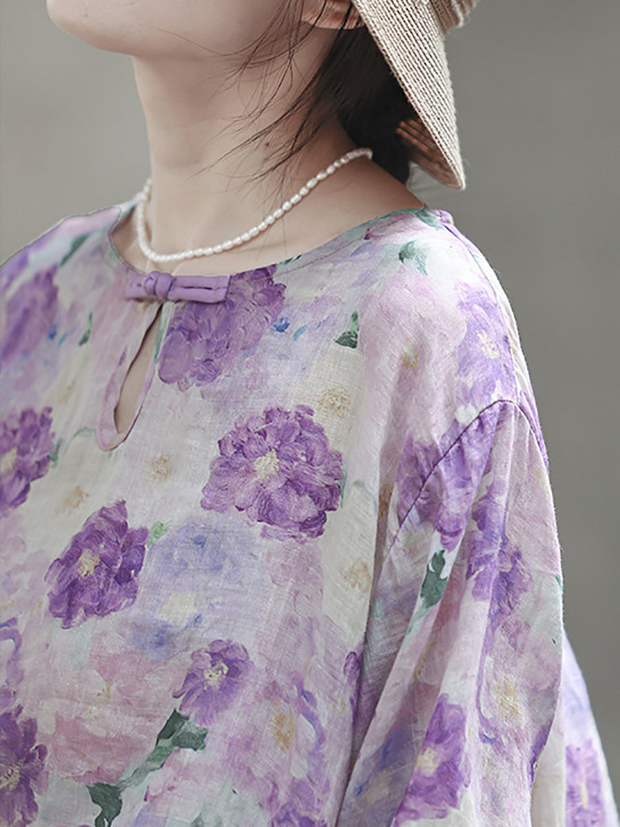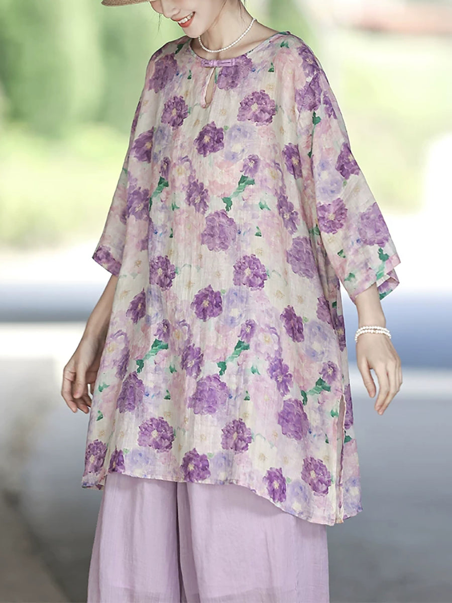 Women Summer Artsy Flower 100%Ramie Shirt