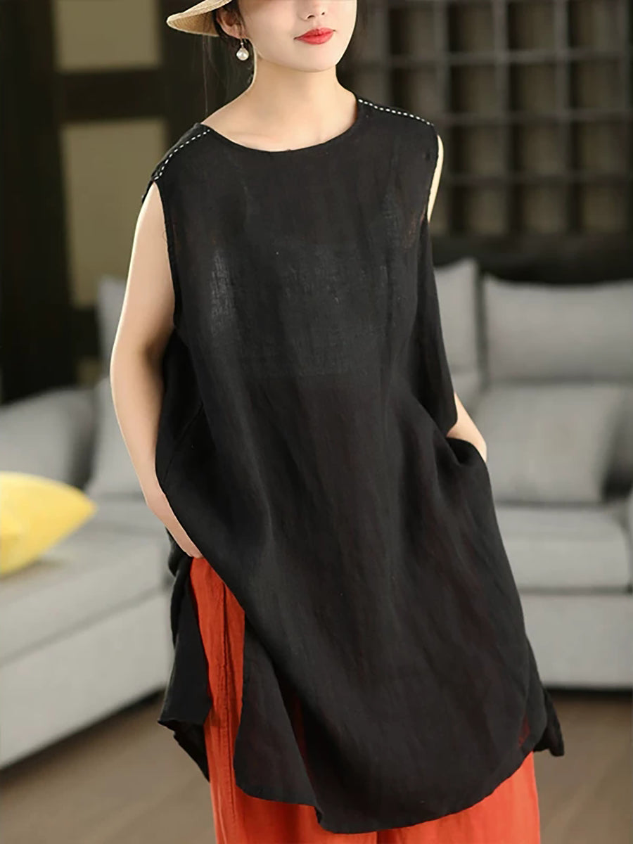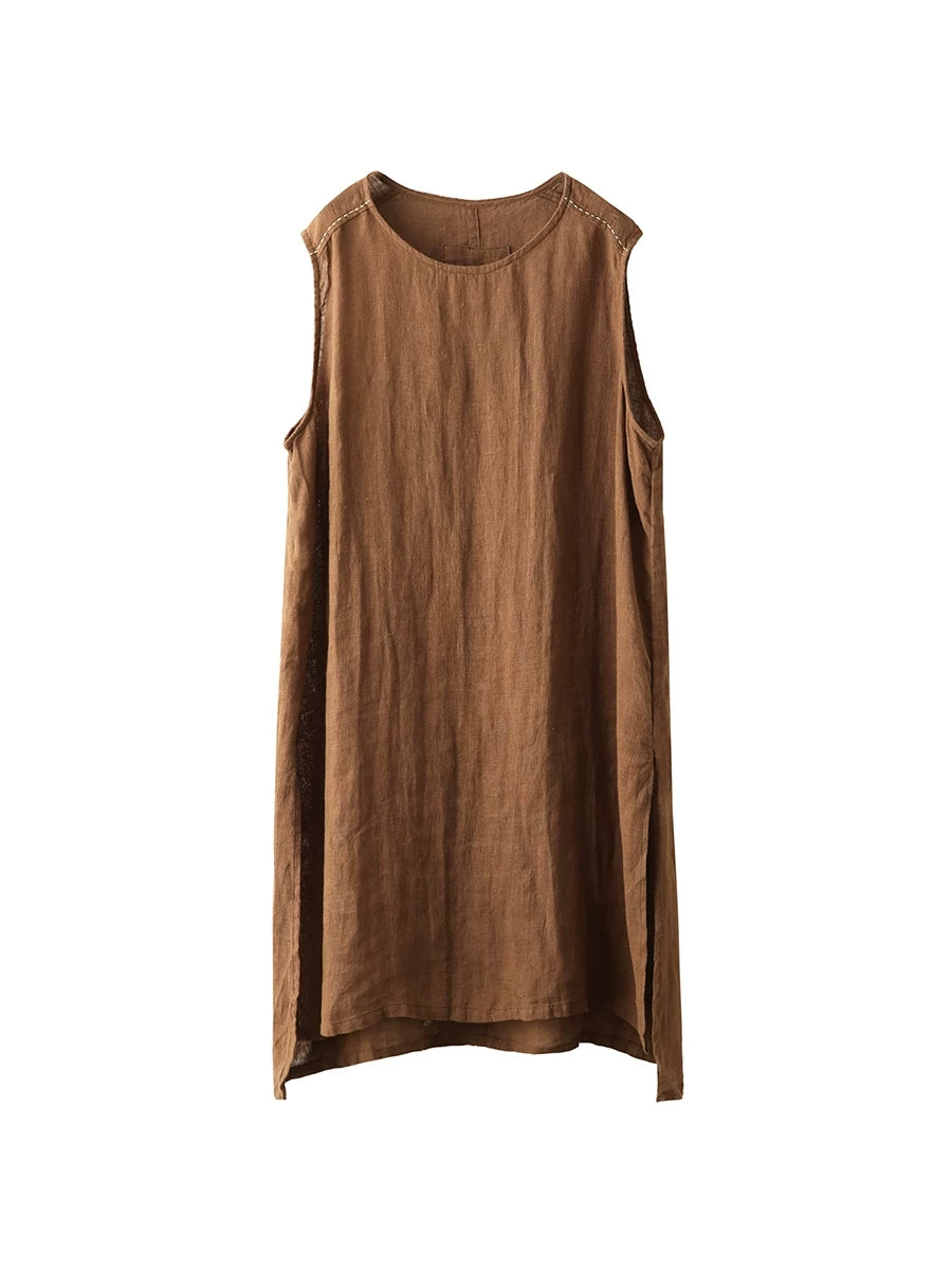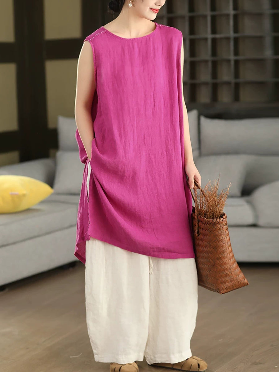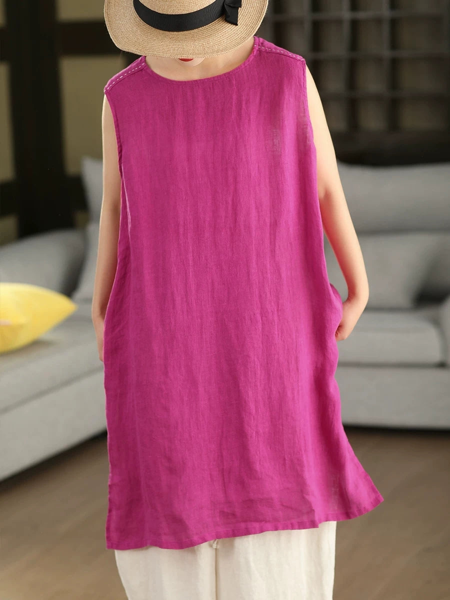 Women Summer Artsy Pure Color 100%Linen Long Tank