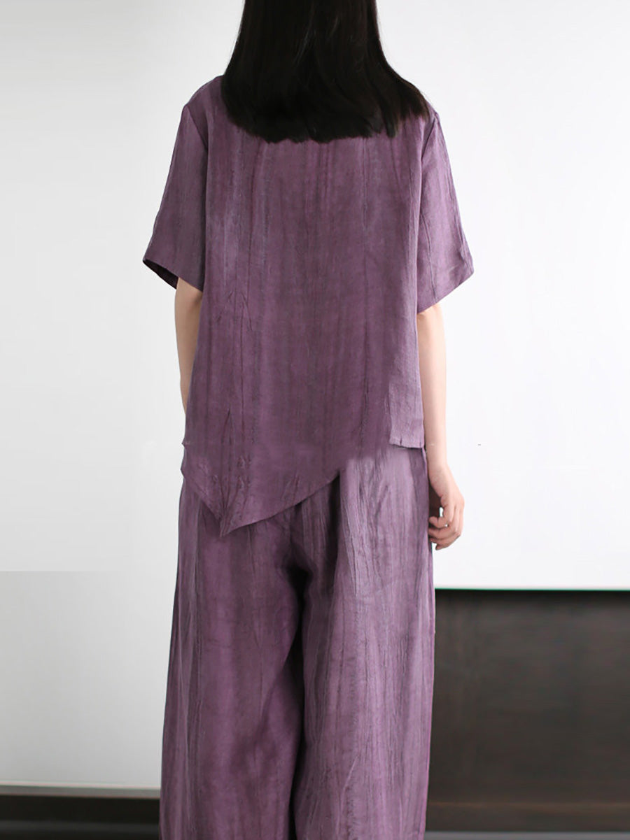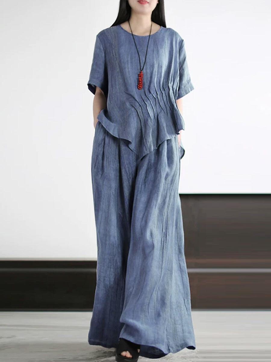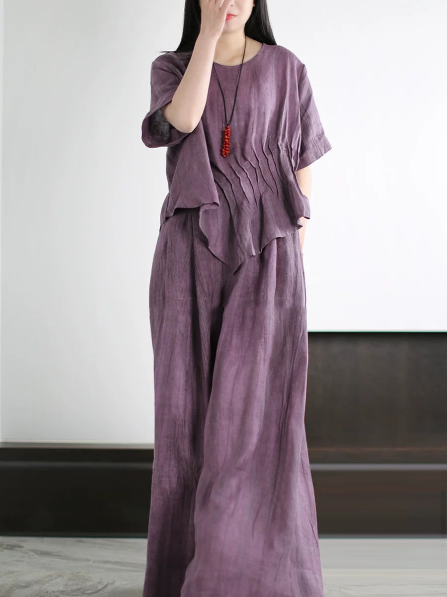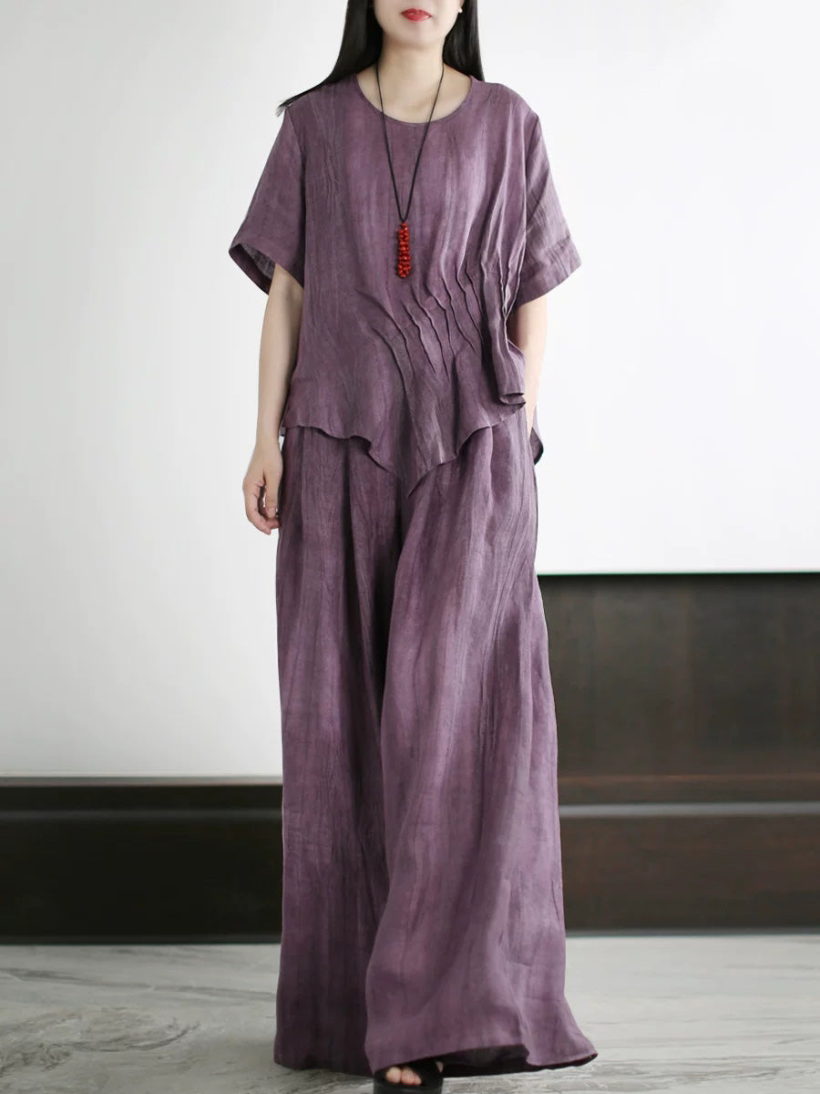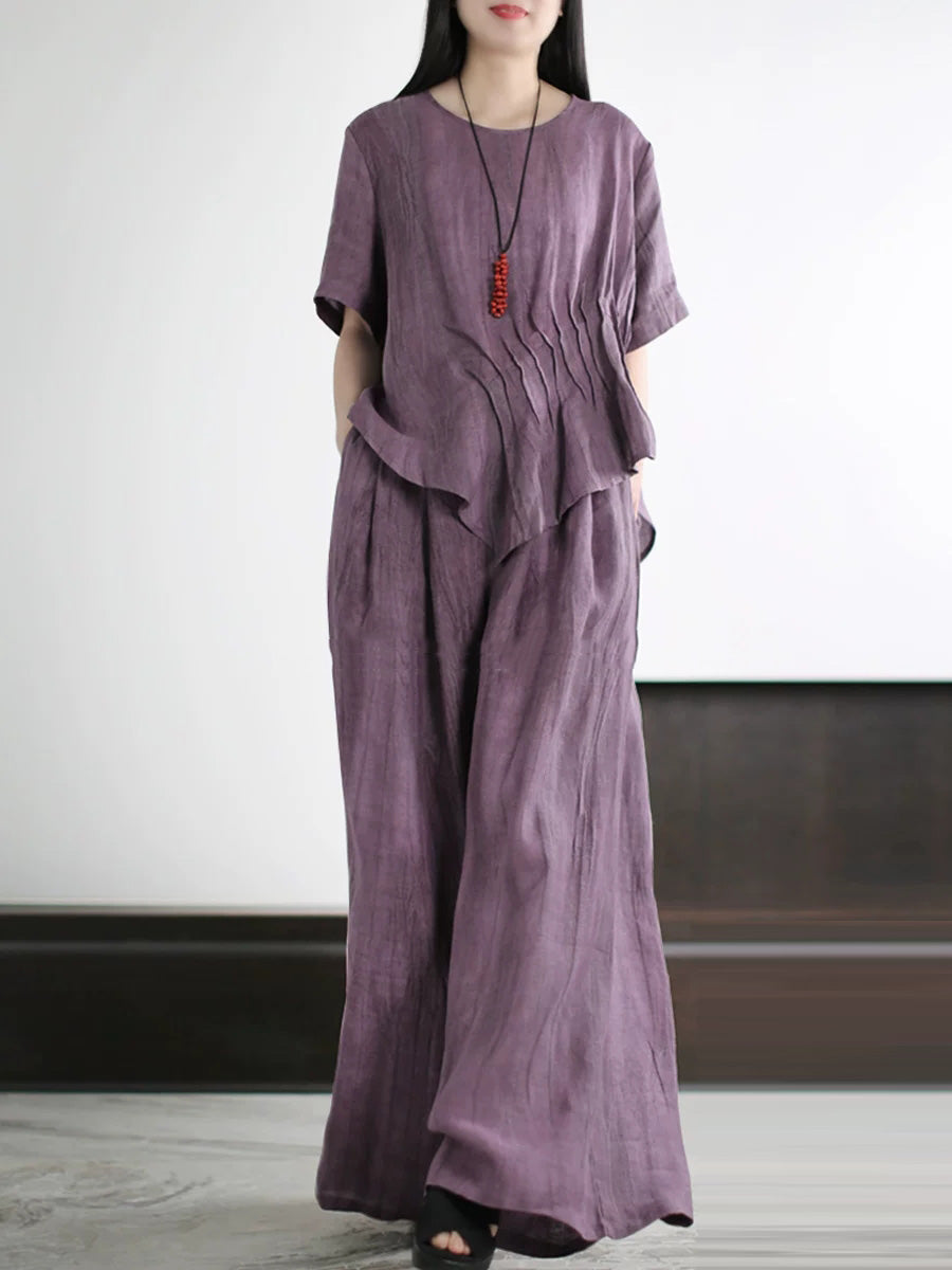 Women Summer Artsy Pure Color Linen O-Neck Suits