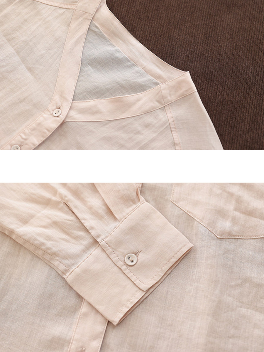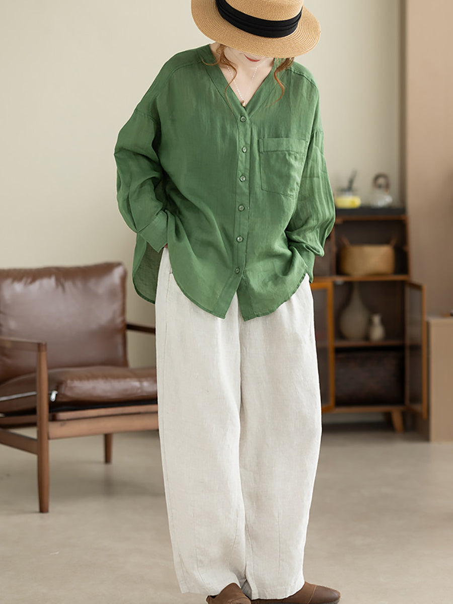 Women Summer Artsy Pure Color V-Neck 100%Ramie Shirt
