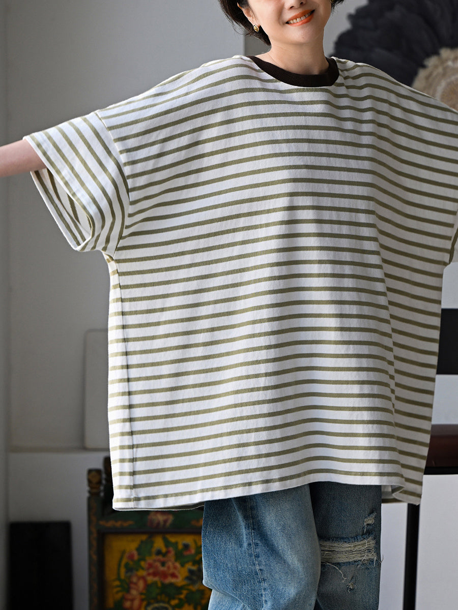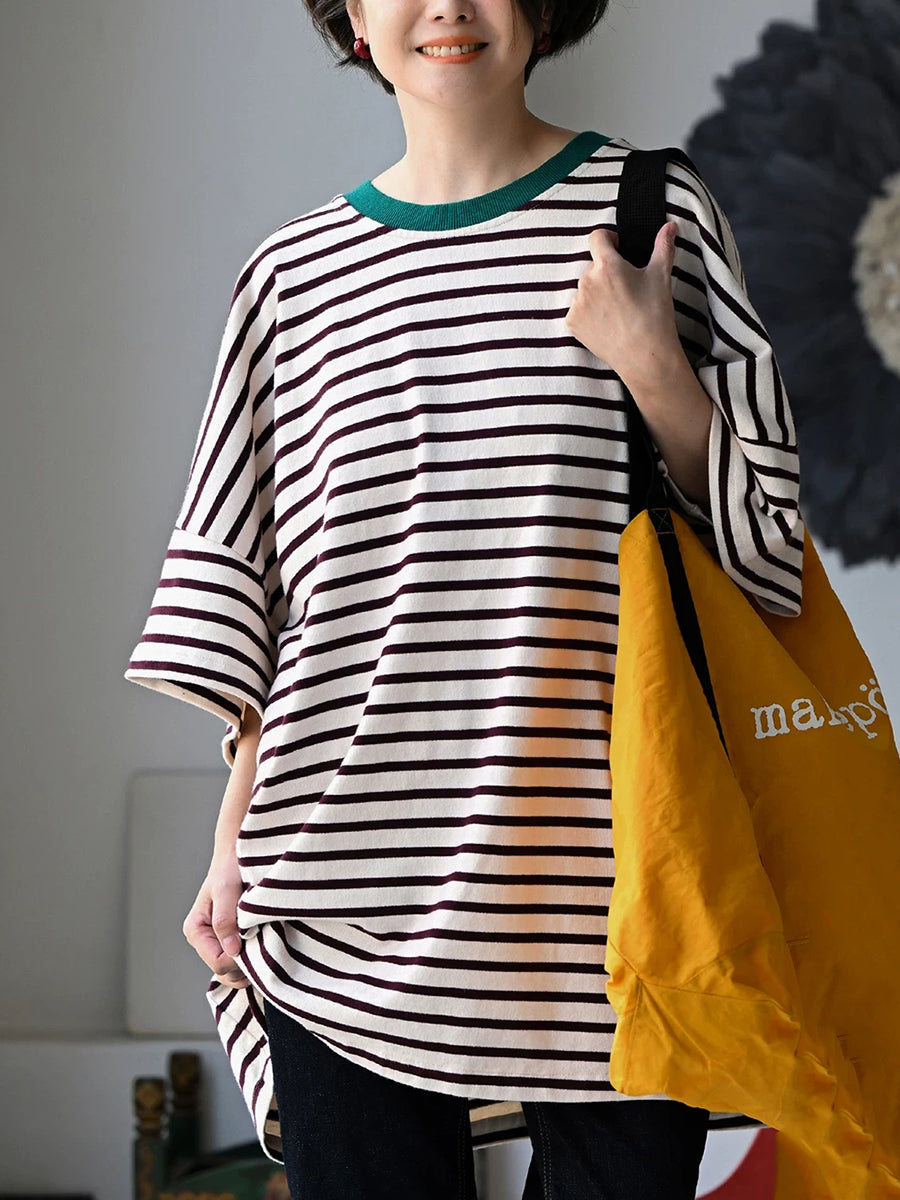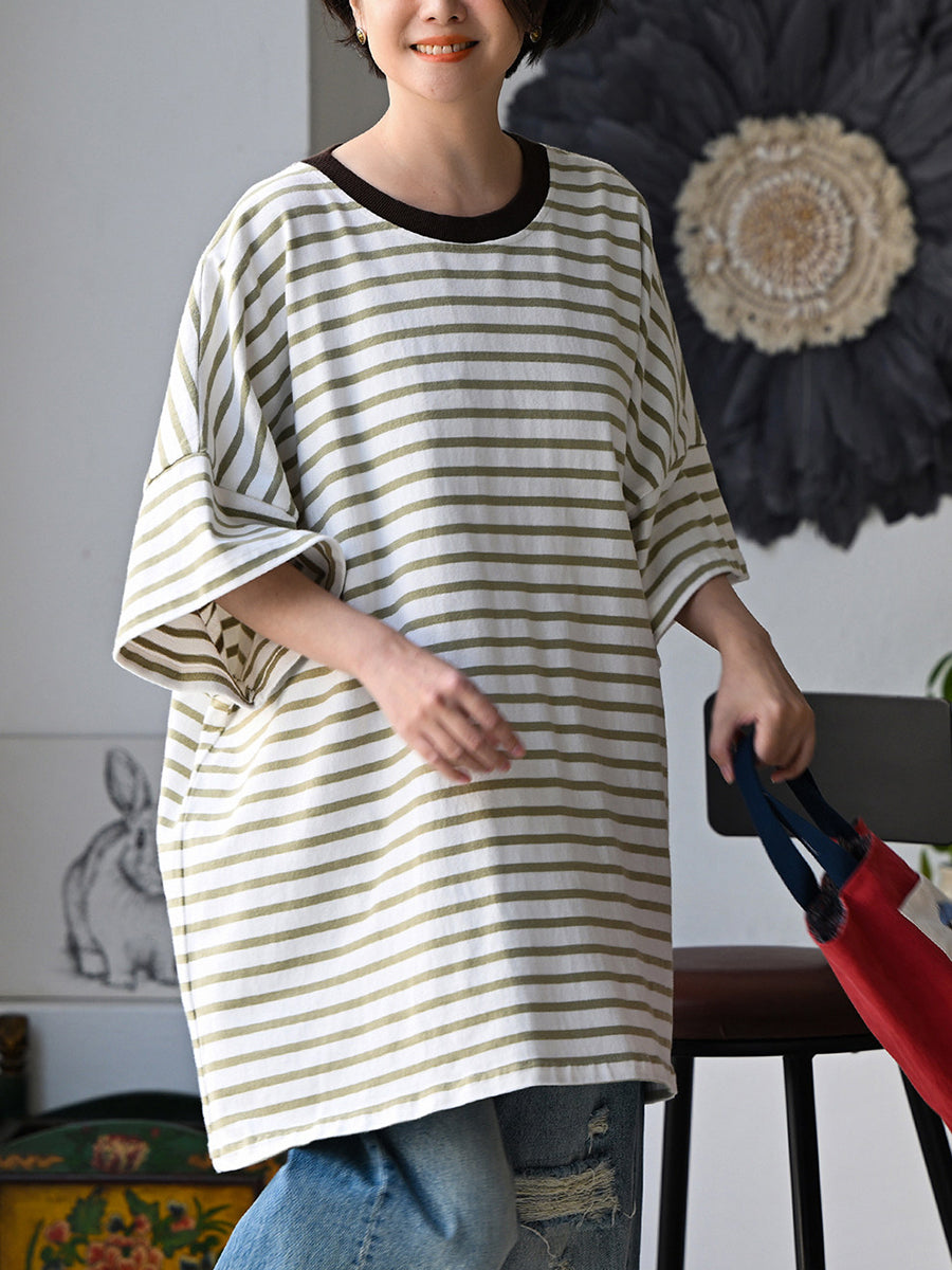 Women Summer Artsy Stripe O-Neck 100%Cotton T-Shirt
