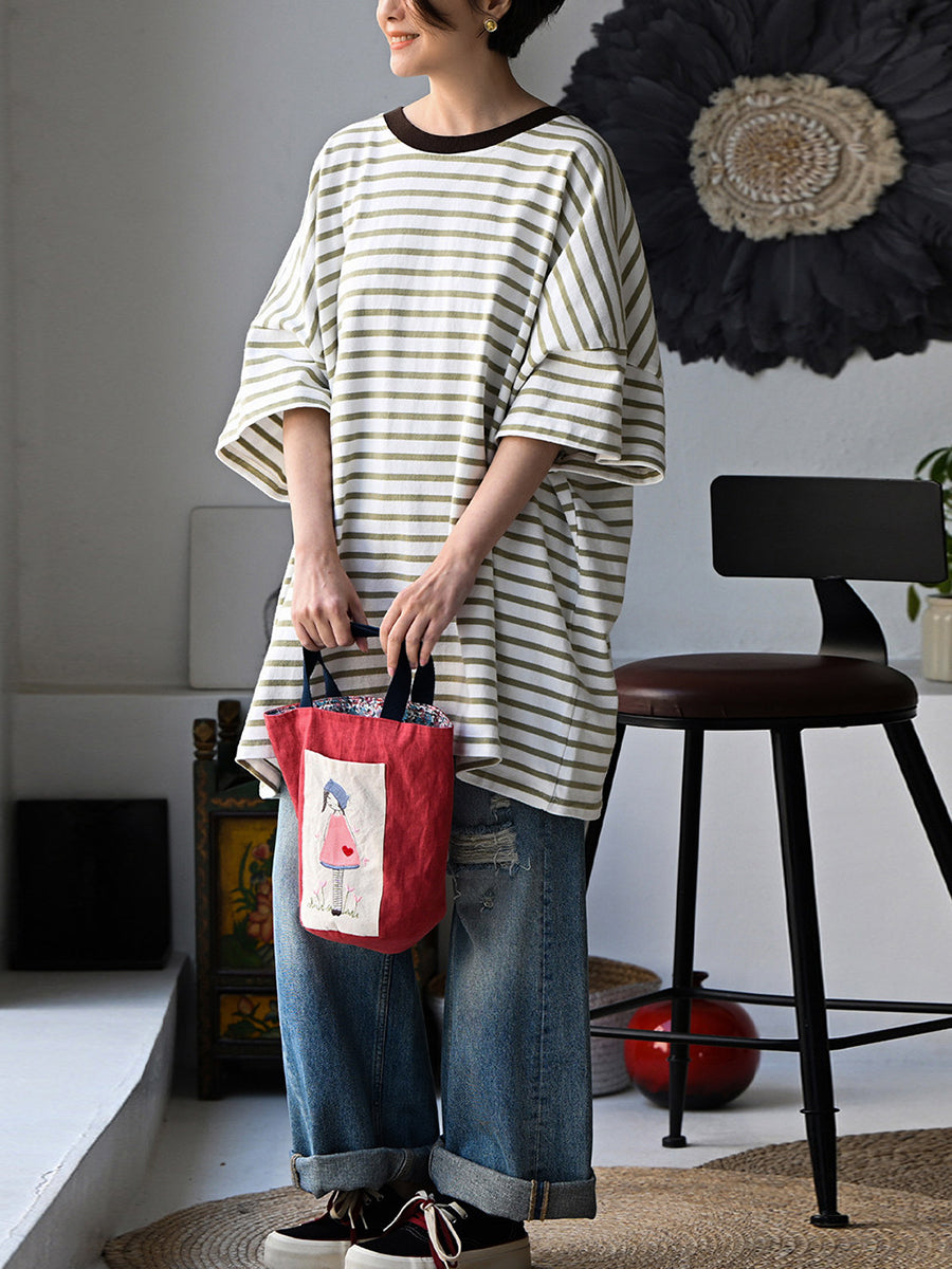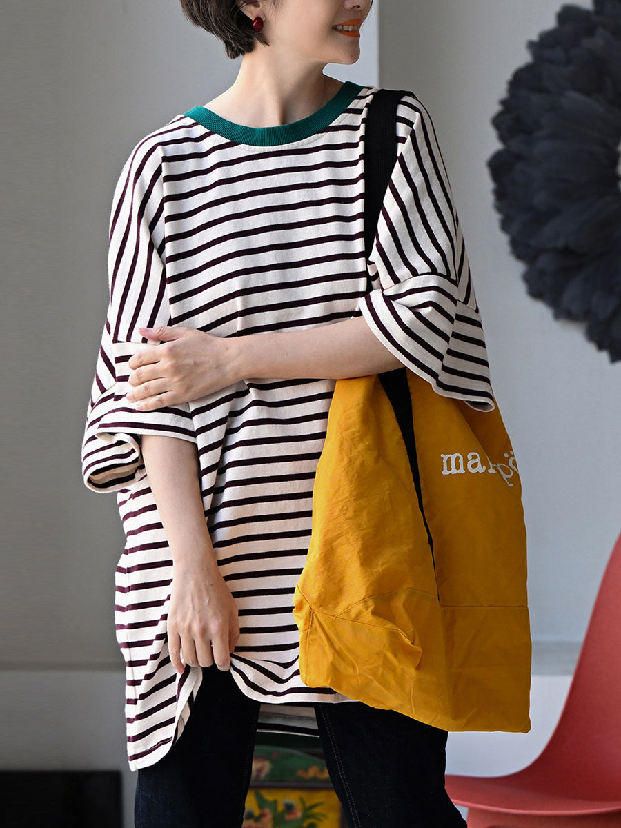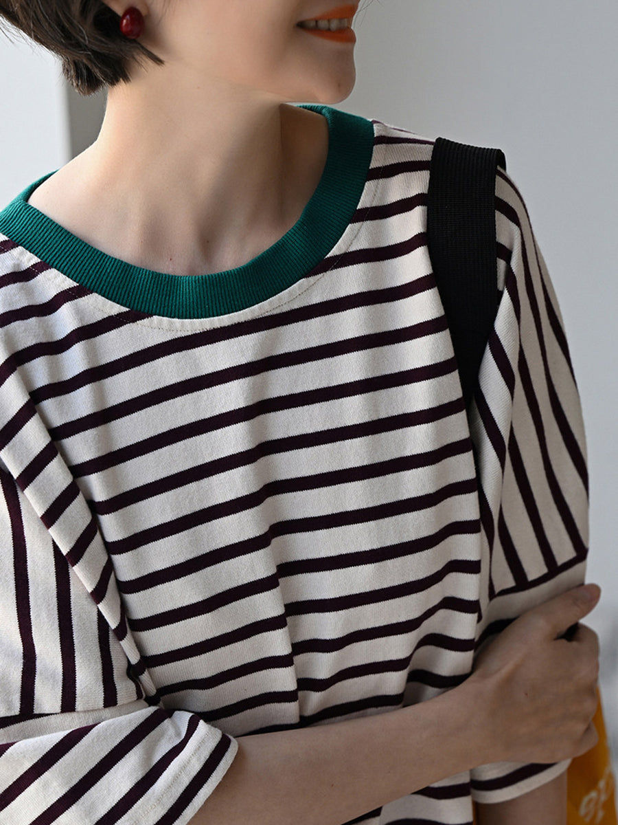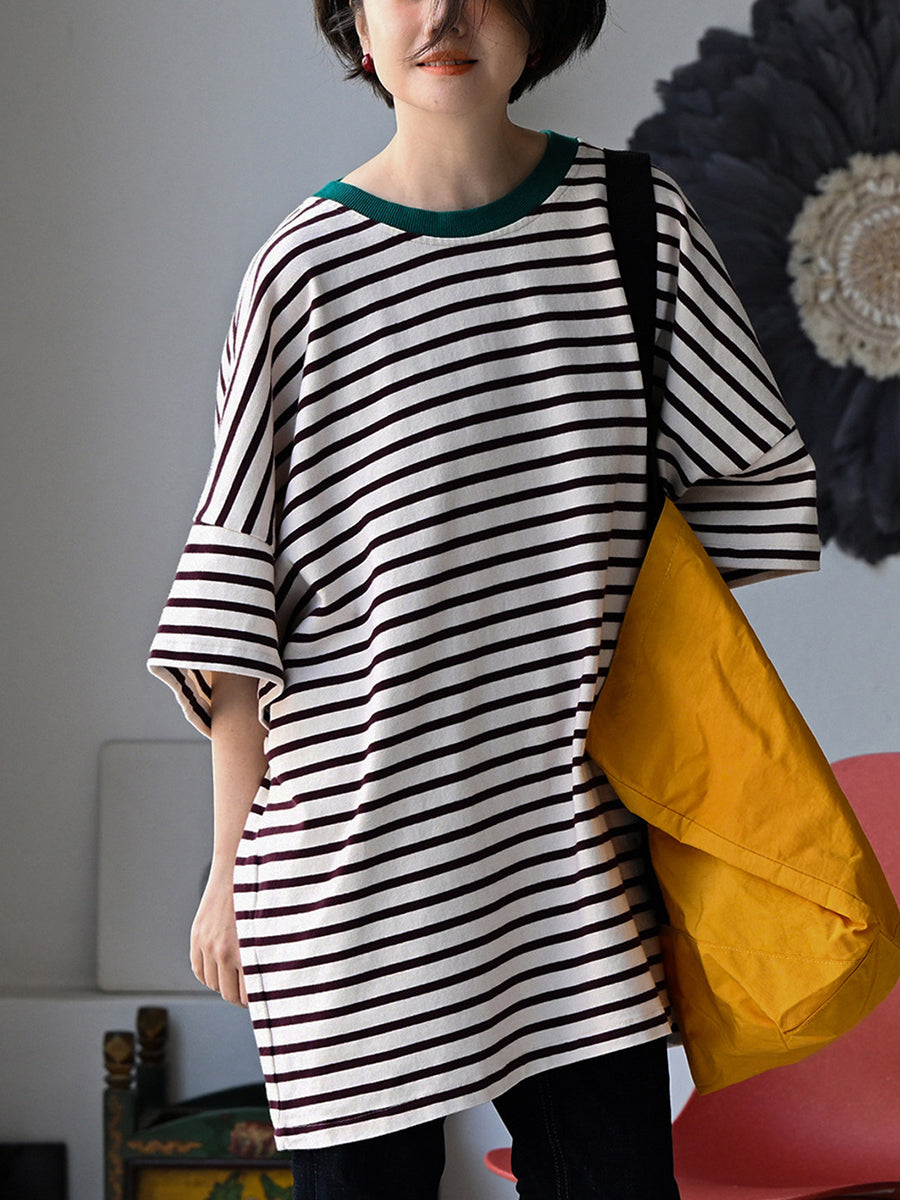 Women Summer Artsy Stripe O-Neck 100%Cotton T-Shirt
