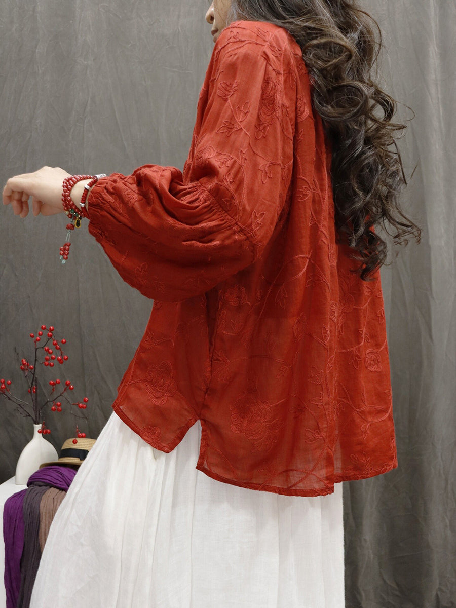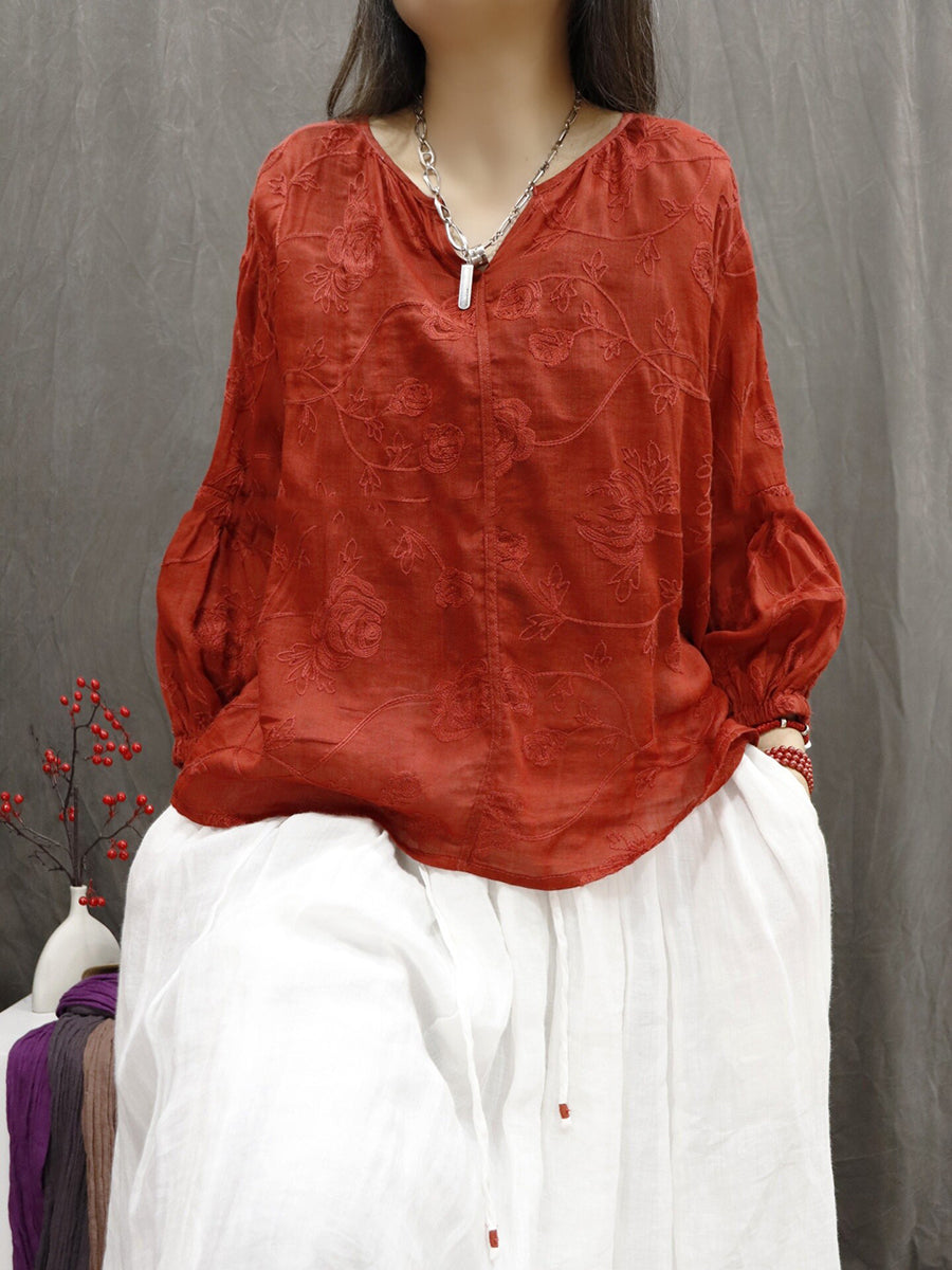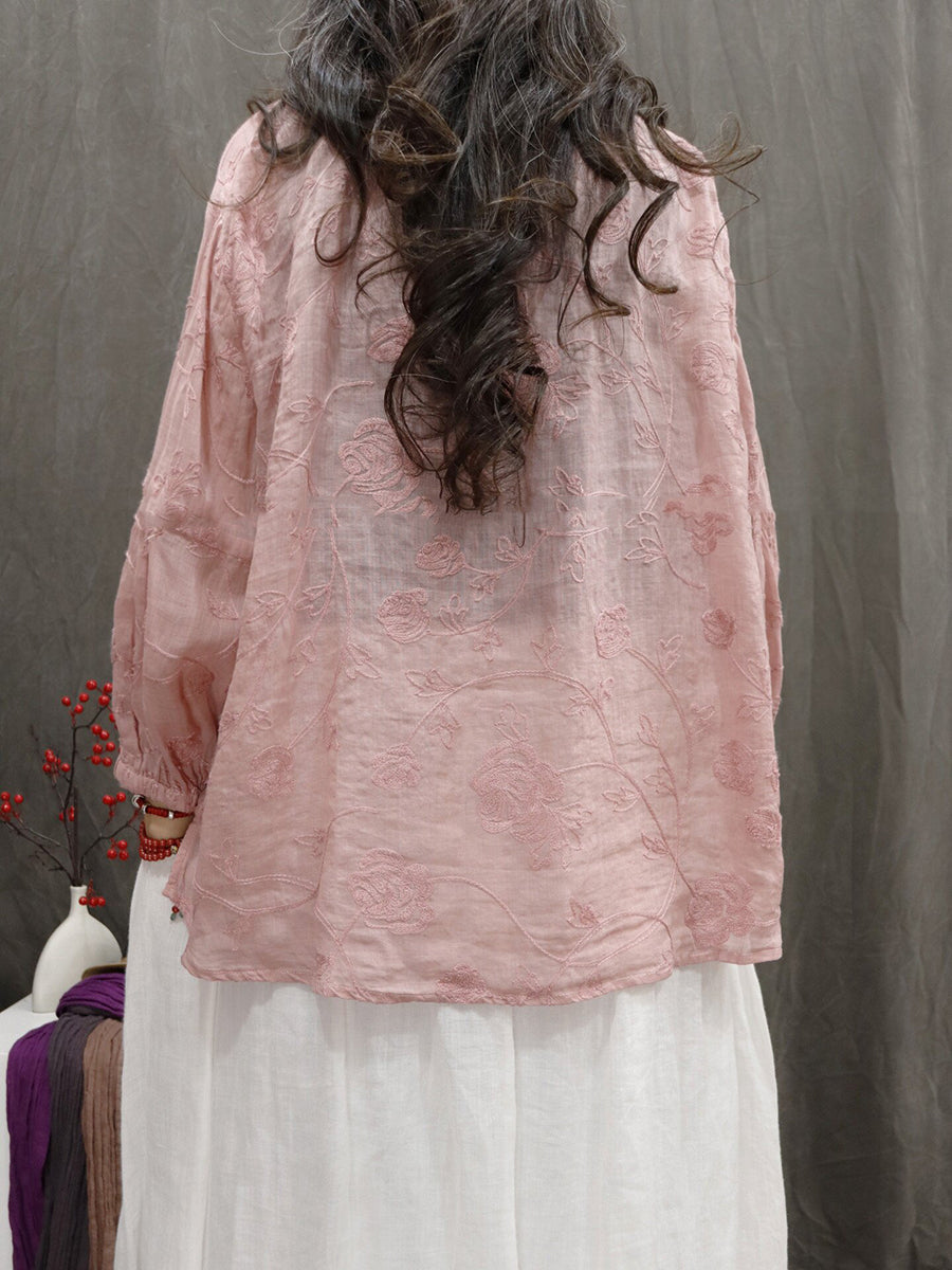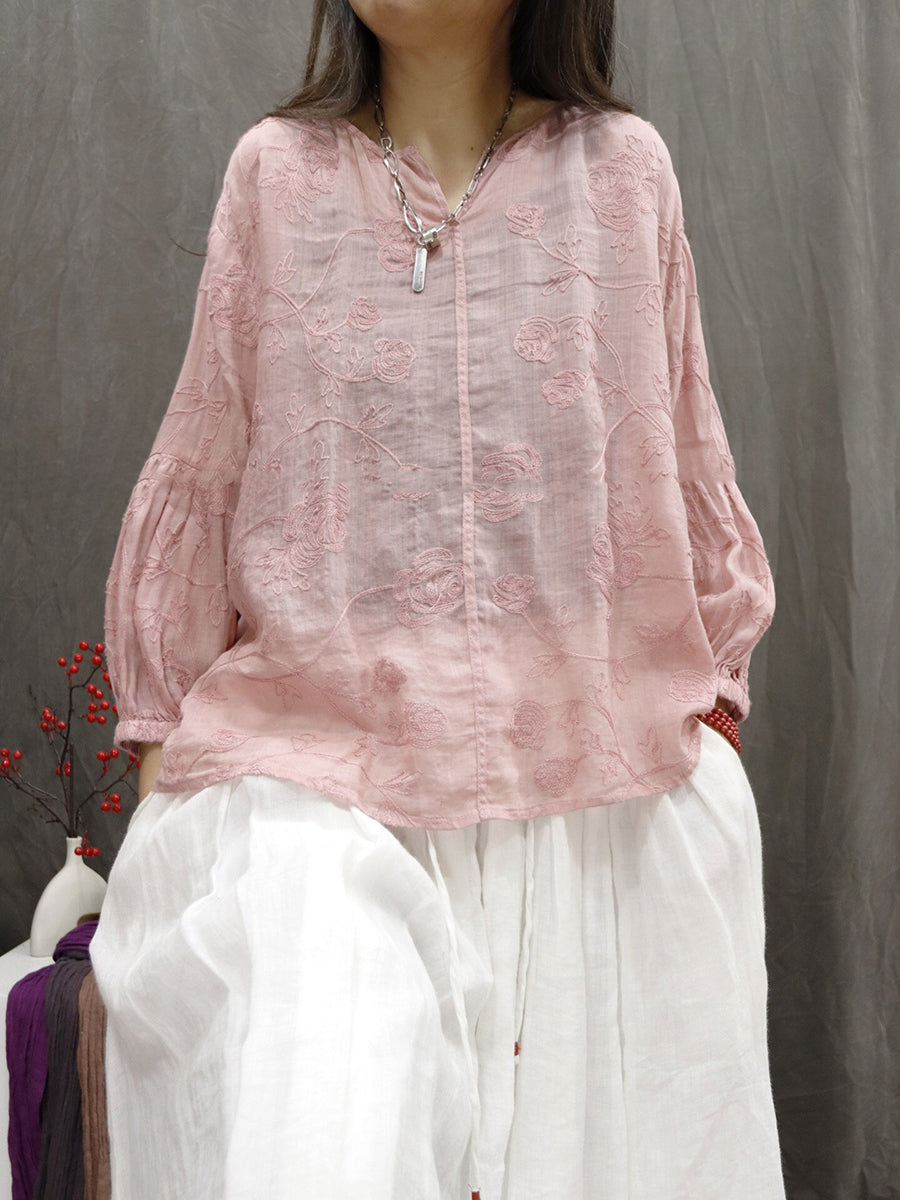 Women Summer Artsy V-Neck Embroidery 100%Ramie Blouse