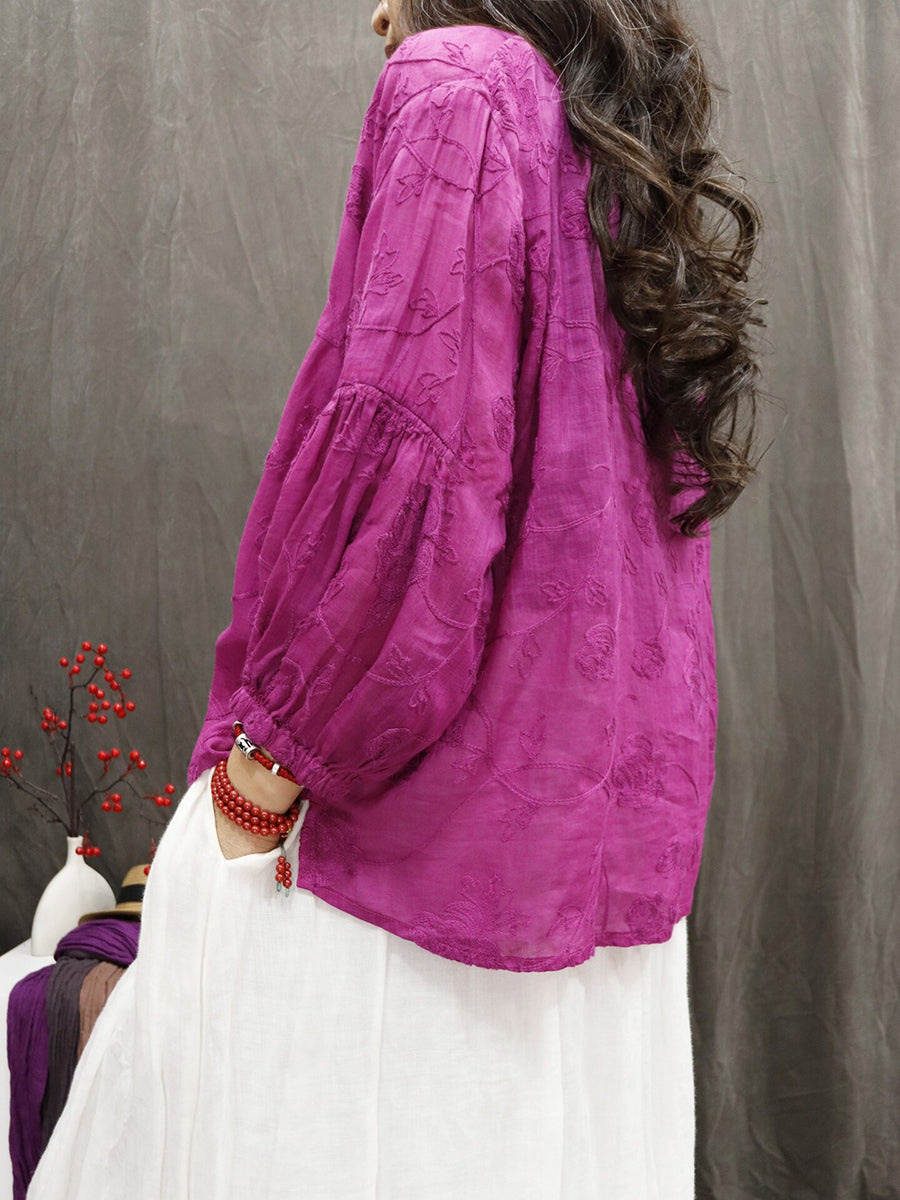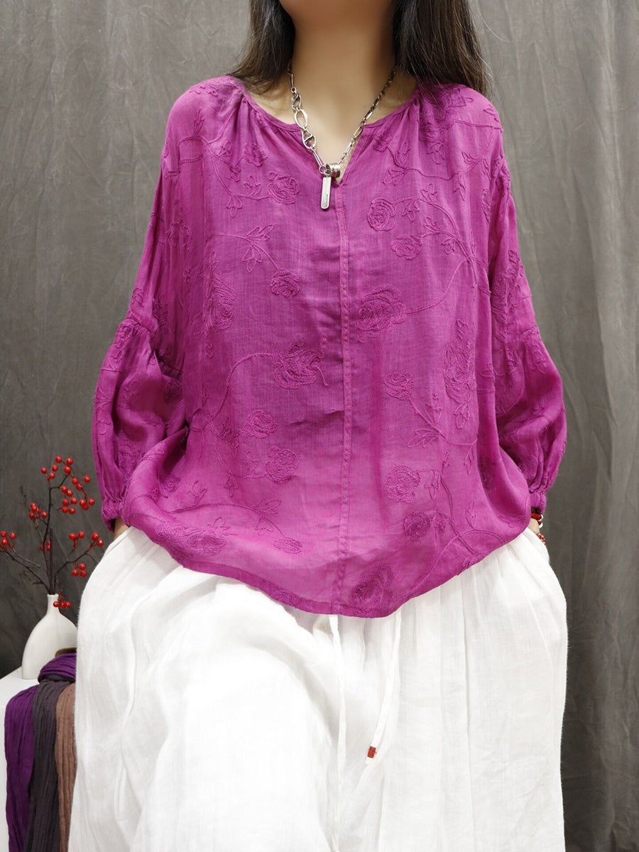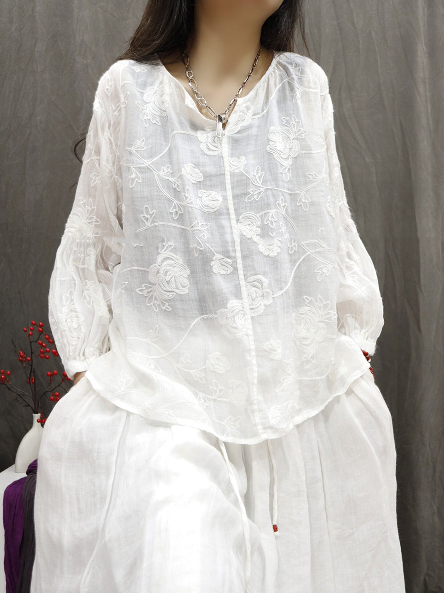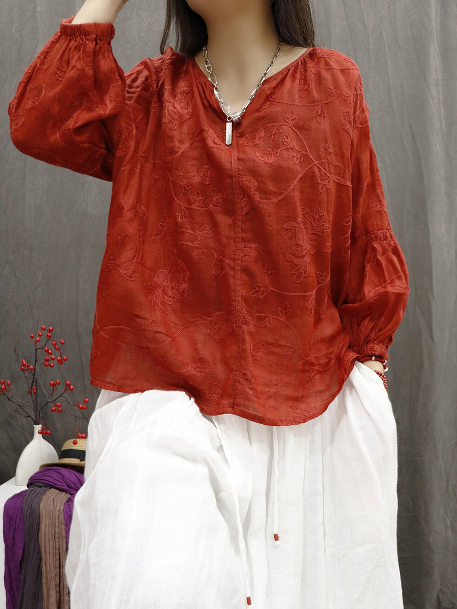 Women Summer Artsy V-Neck Embroidery 100%Ramie Blouse