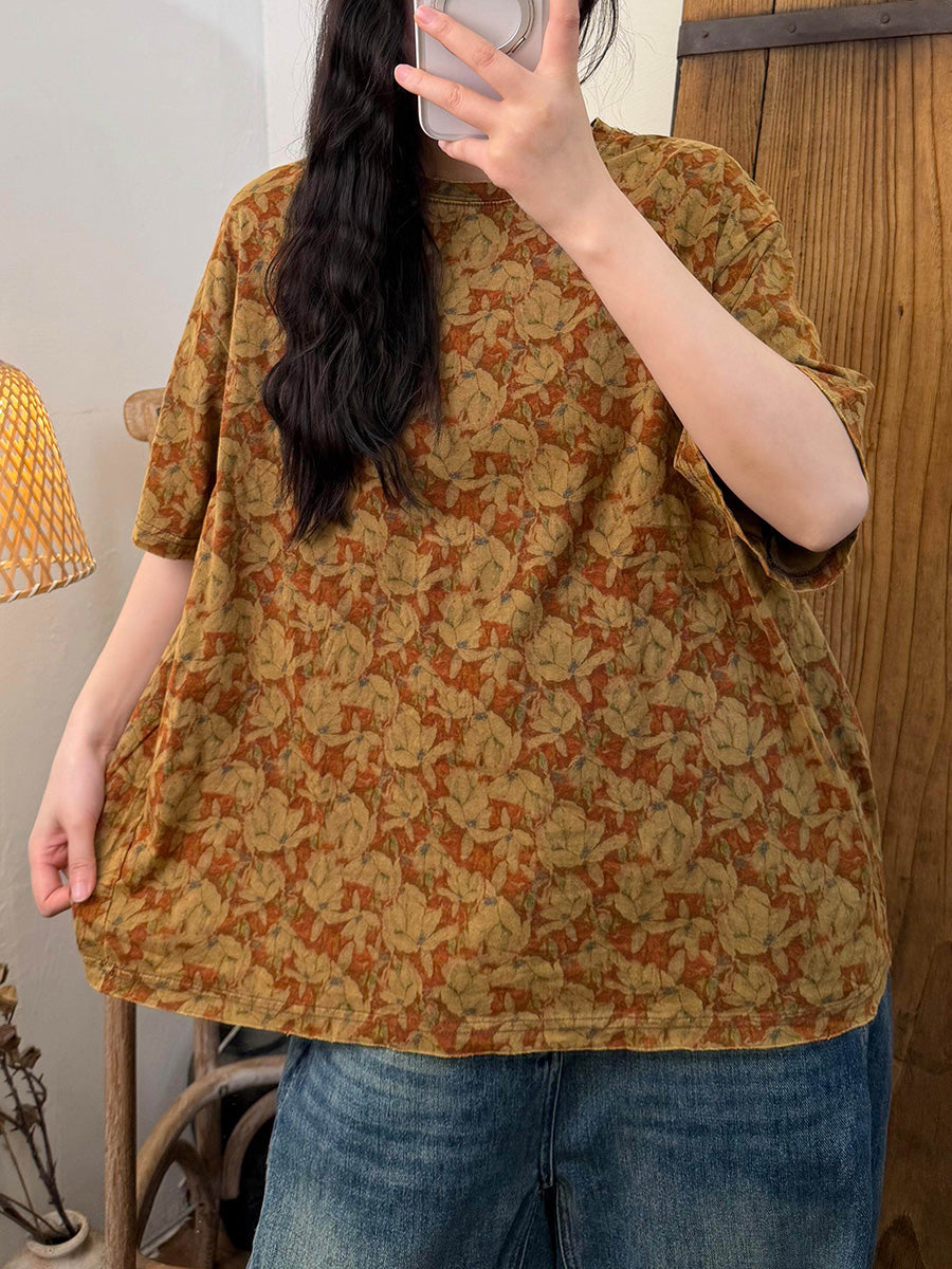 Women Summer Casual Flower O-Neck T-Shirt
