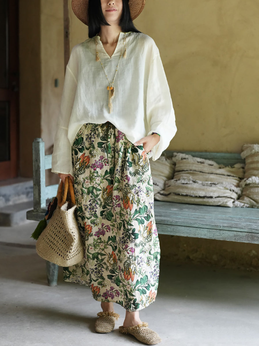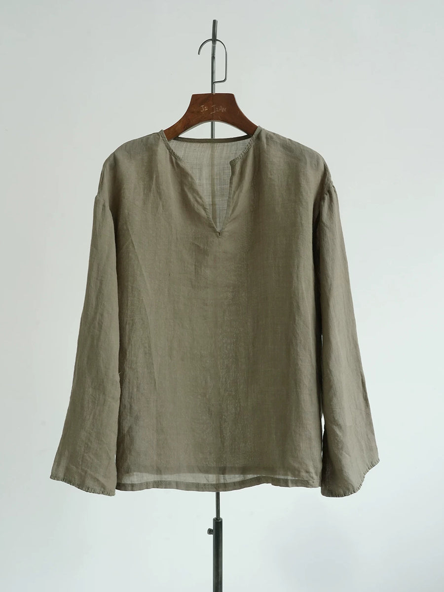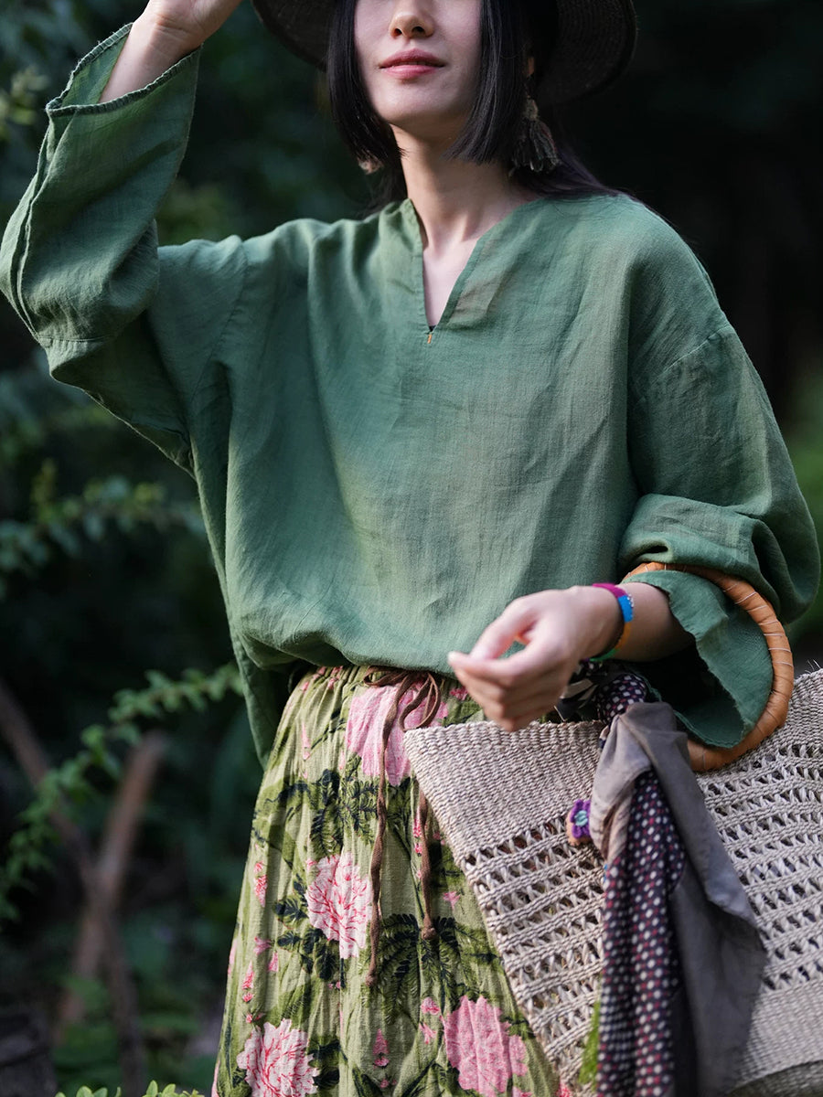 Women Summer Casual Pure Color 100%Ramie V-Neck Blouse