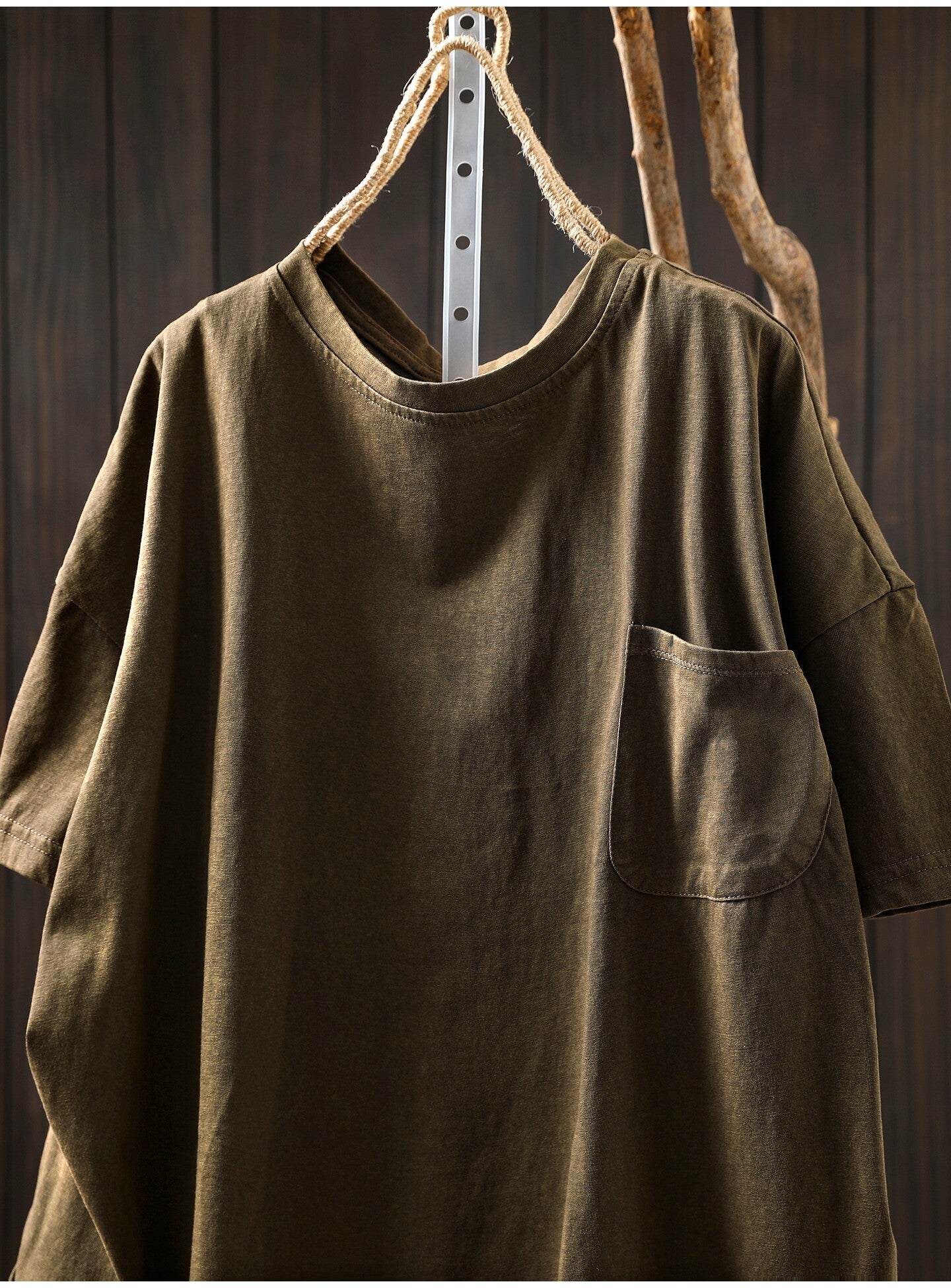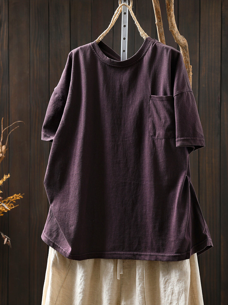 Women Summer Casual Pure Color O-Neck 100%Cotton Shirt