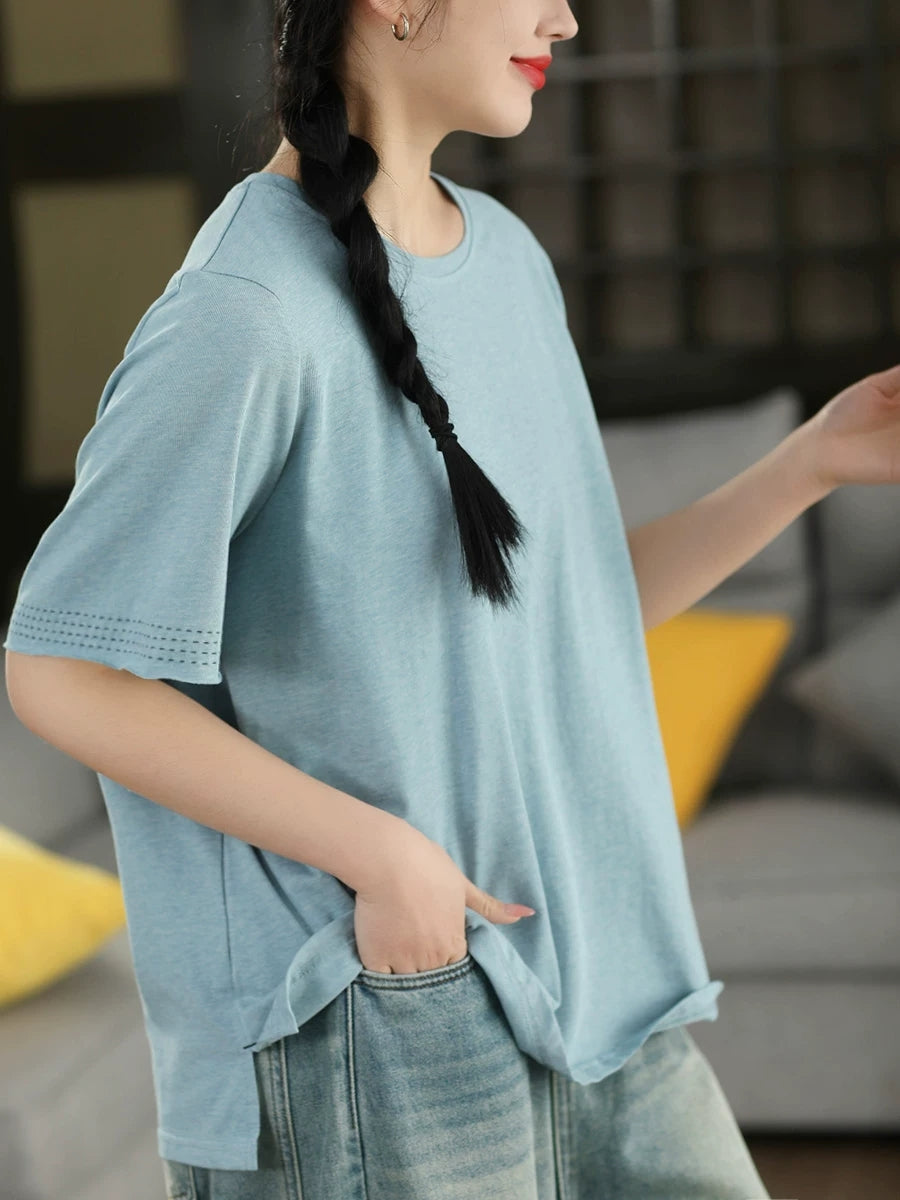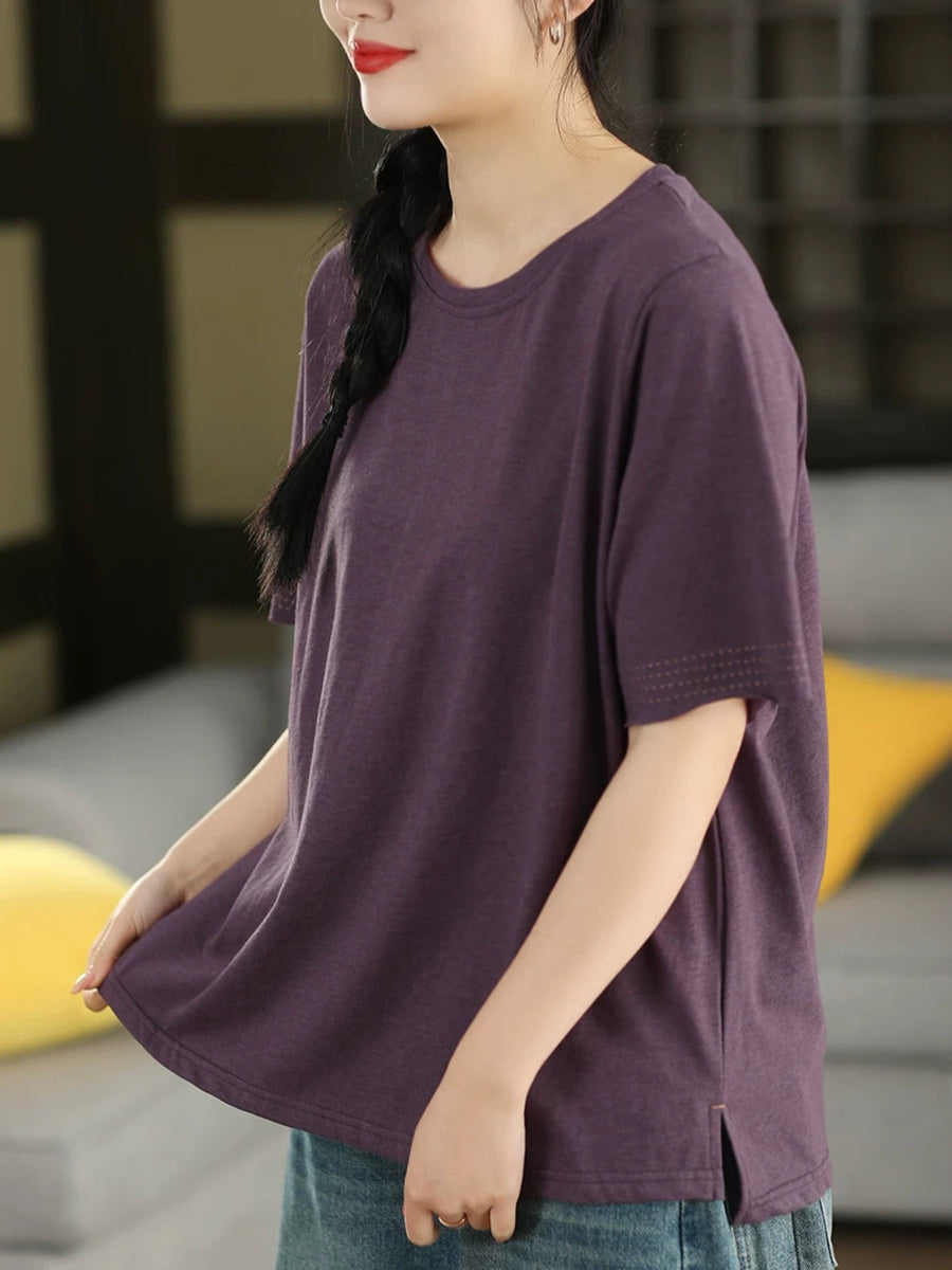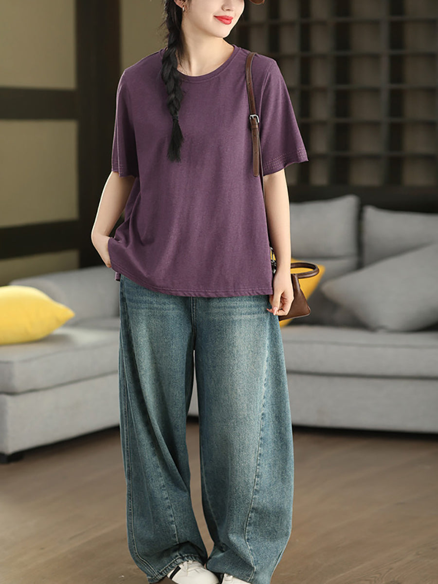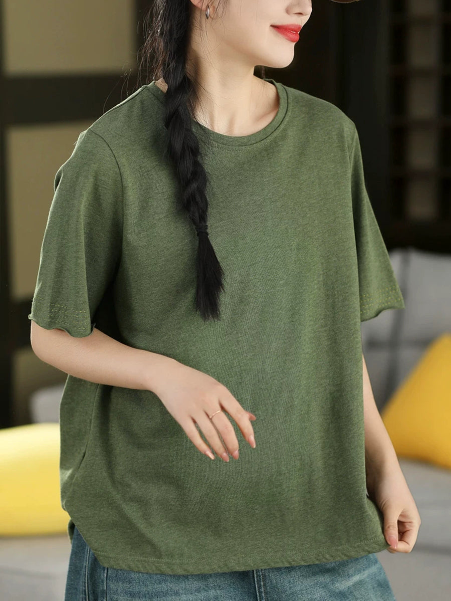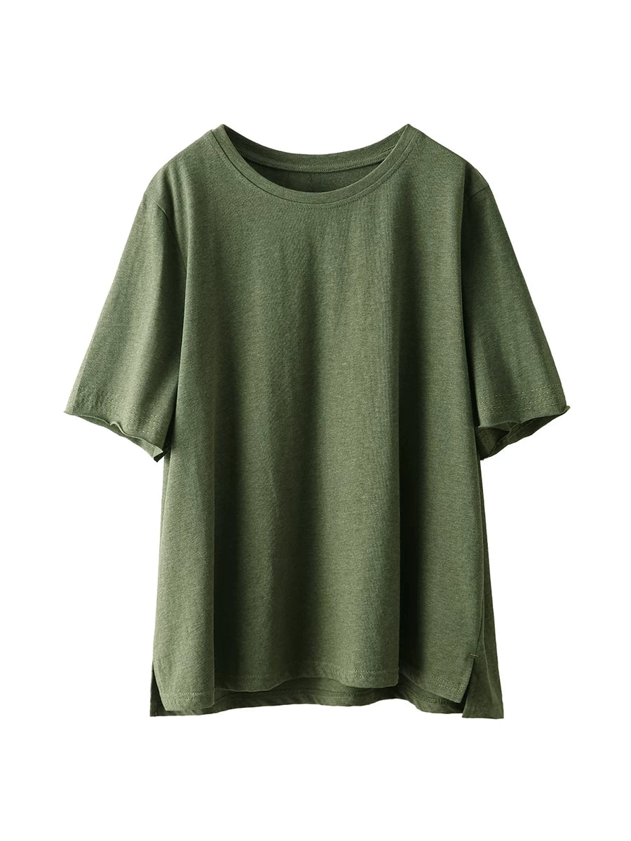 Women Summer Casual Pure Color O-Neck 100%Cotton T-Shirt