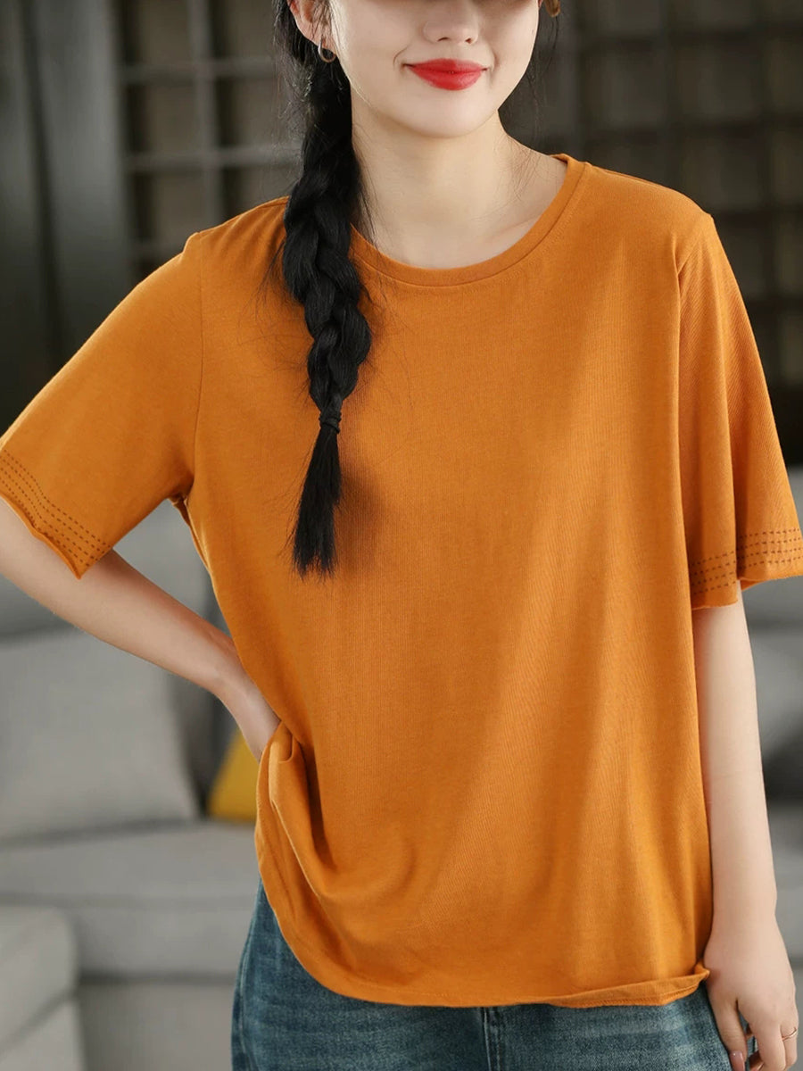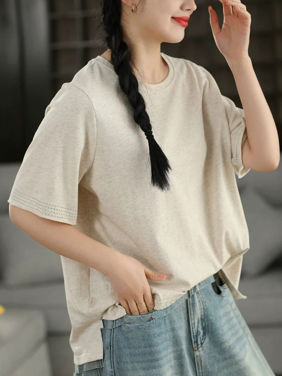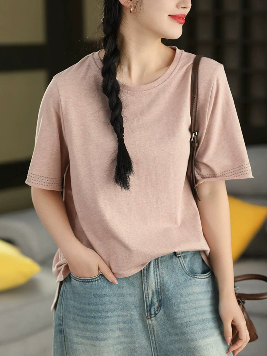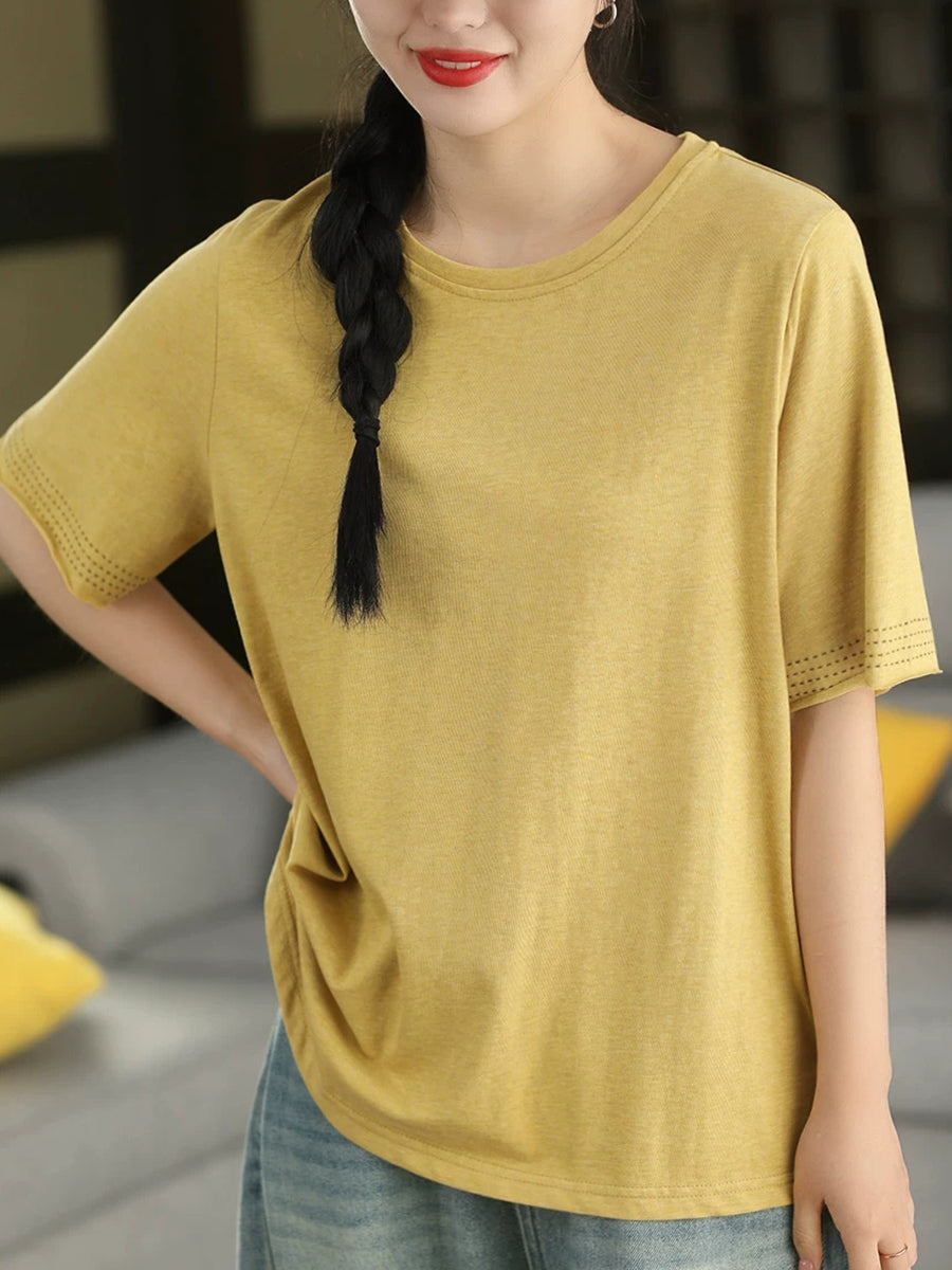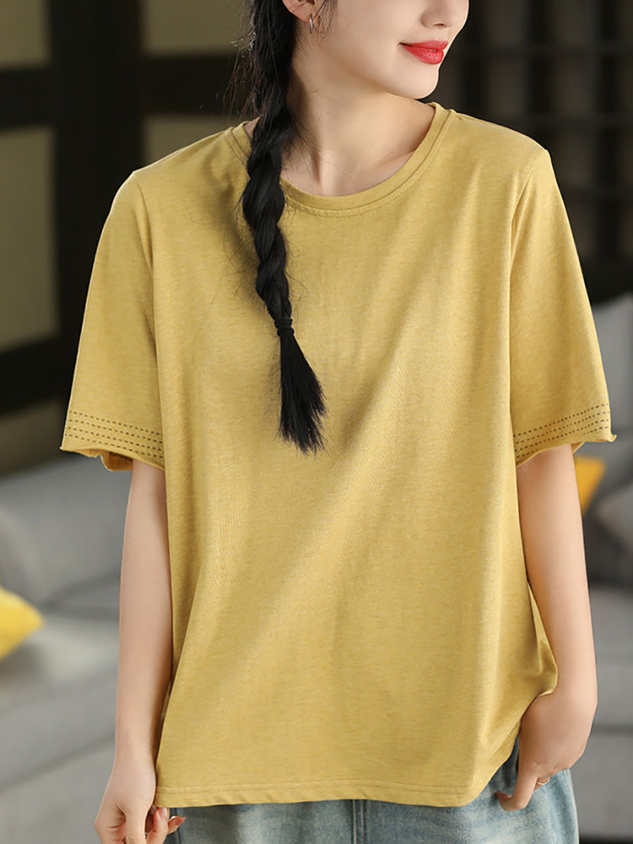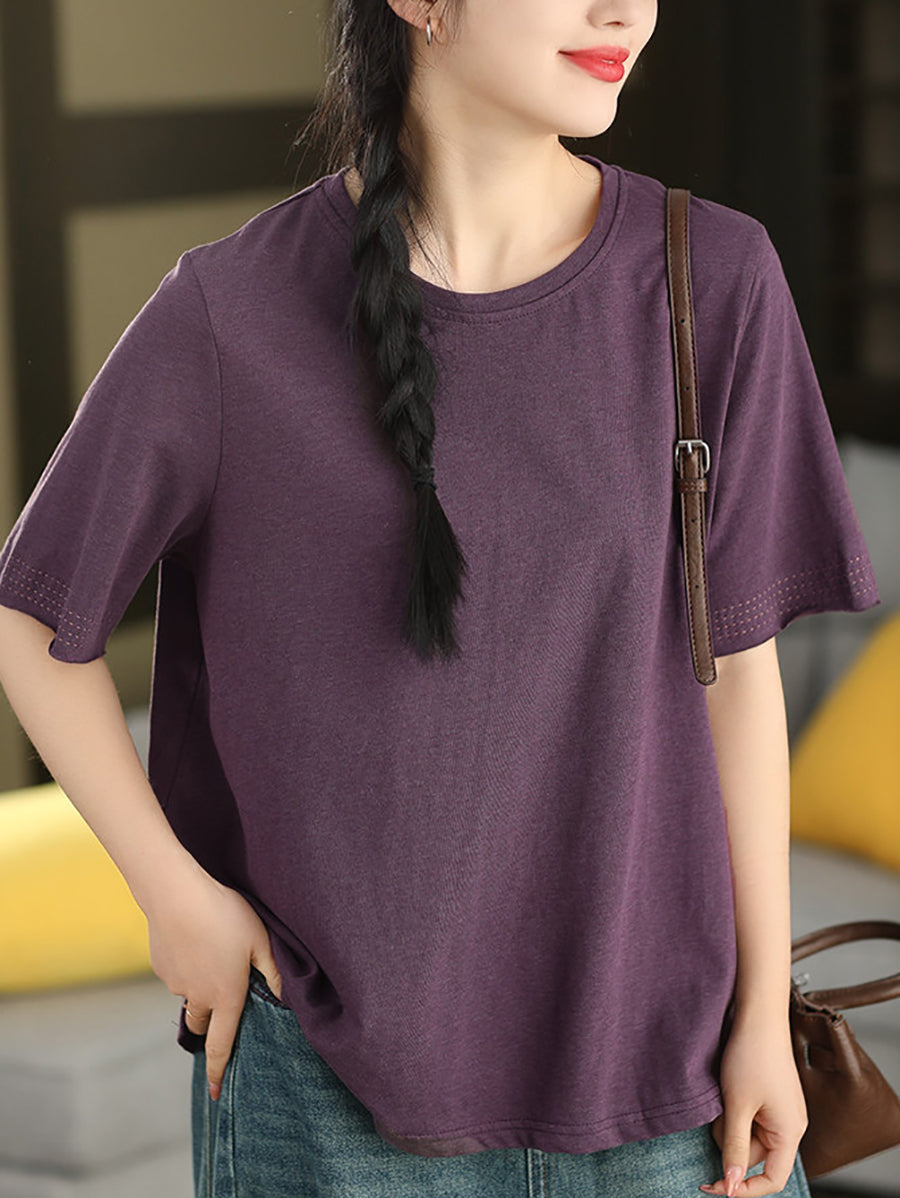Women Summer Casual Pure Color O-Neck 100%Cotton T-Shirt