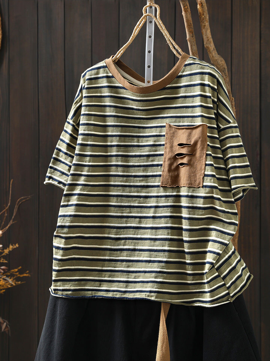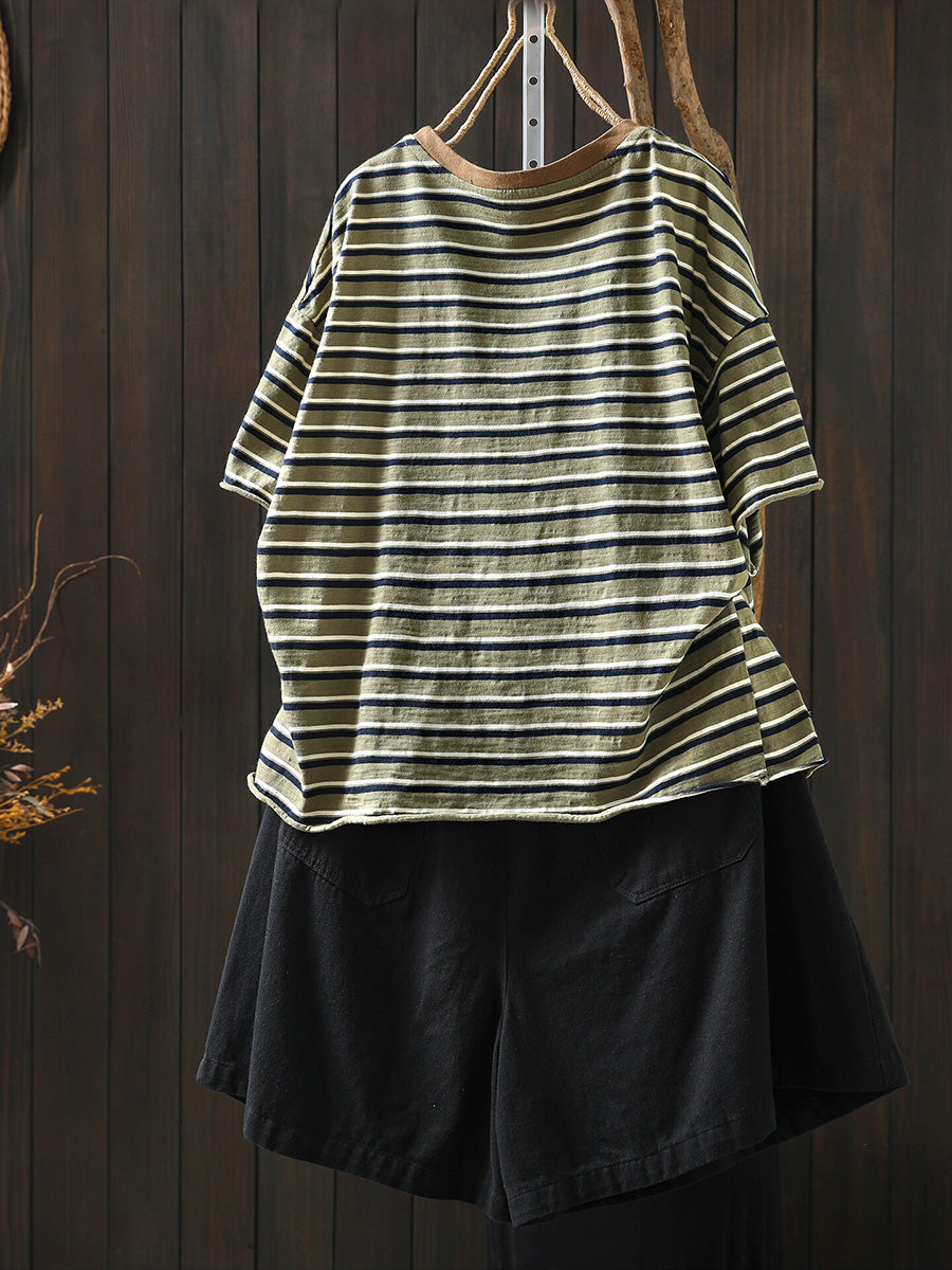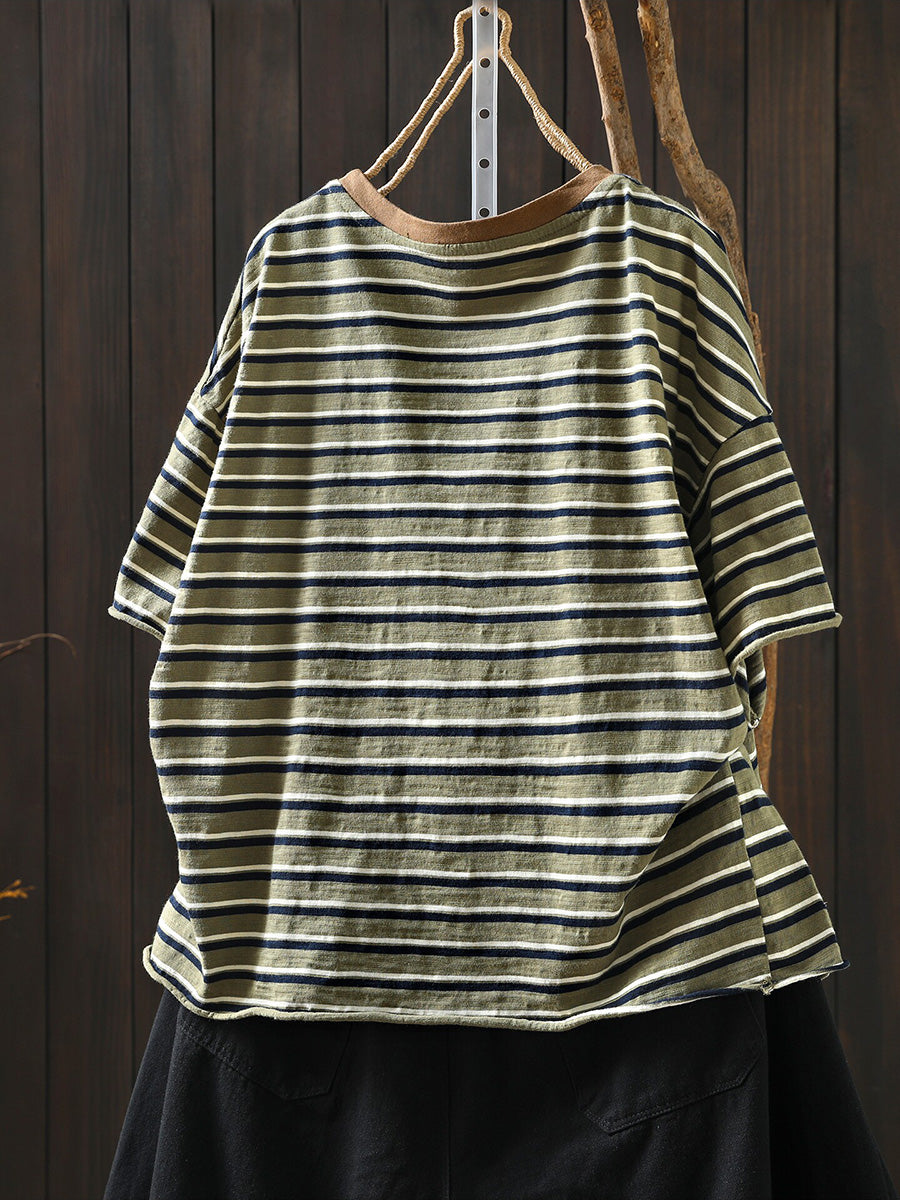 Women Summer Casual Stripe Cotton O-Neck Shirt