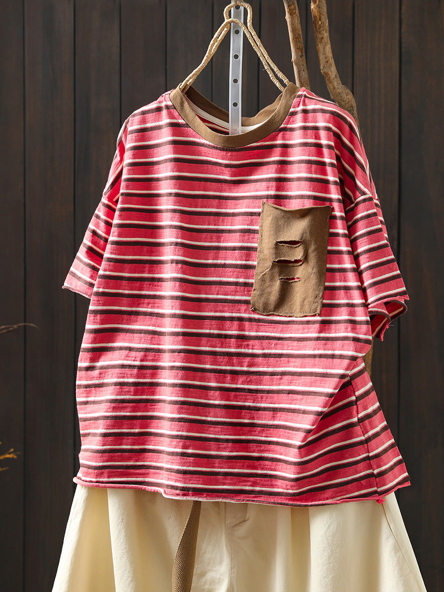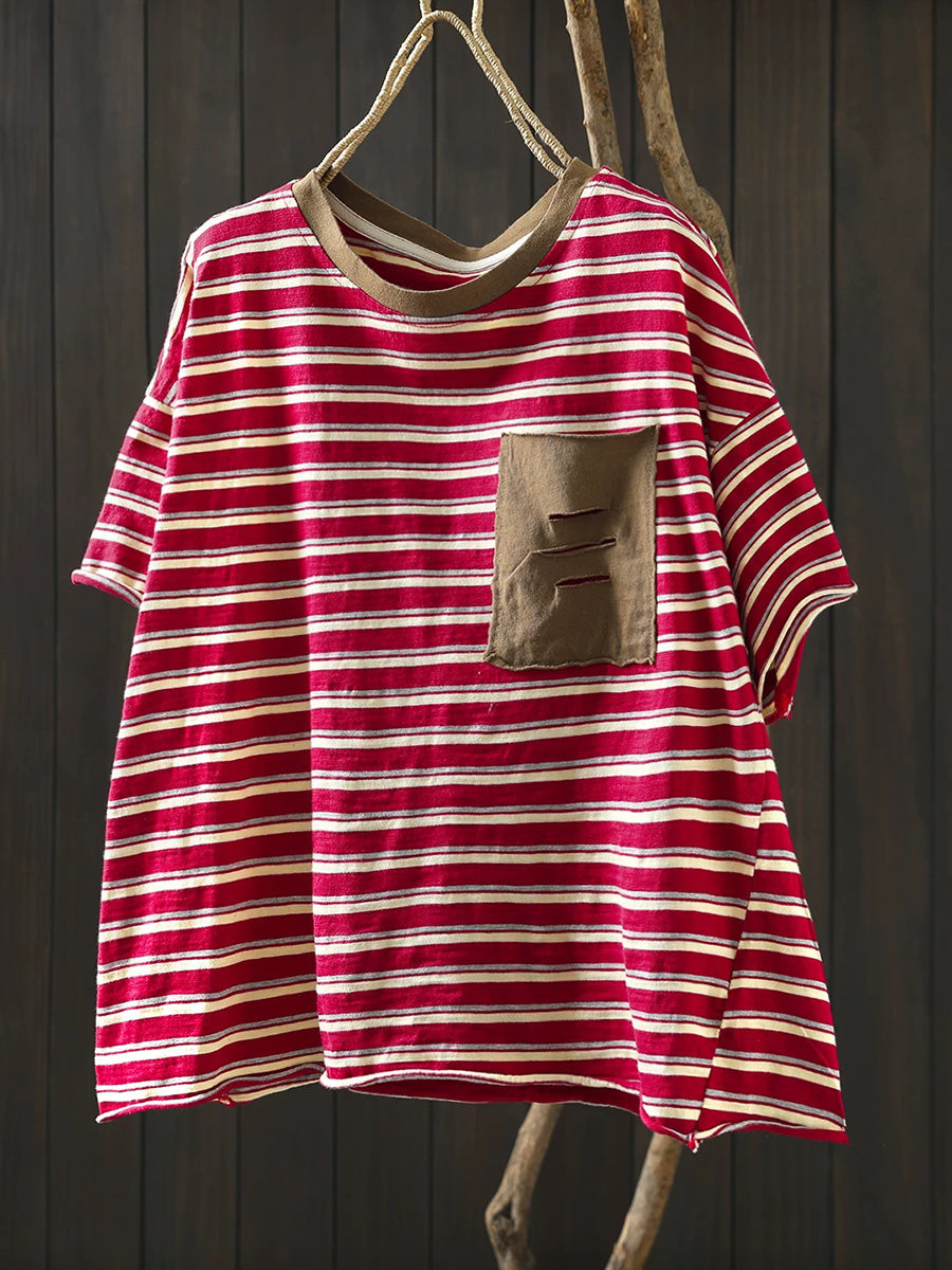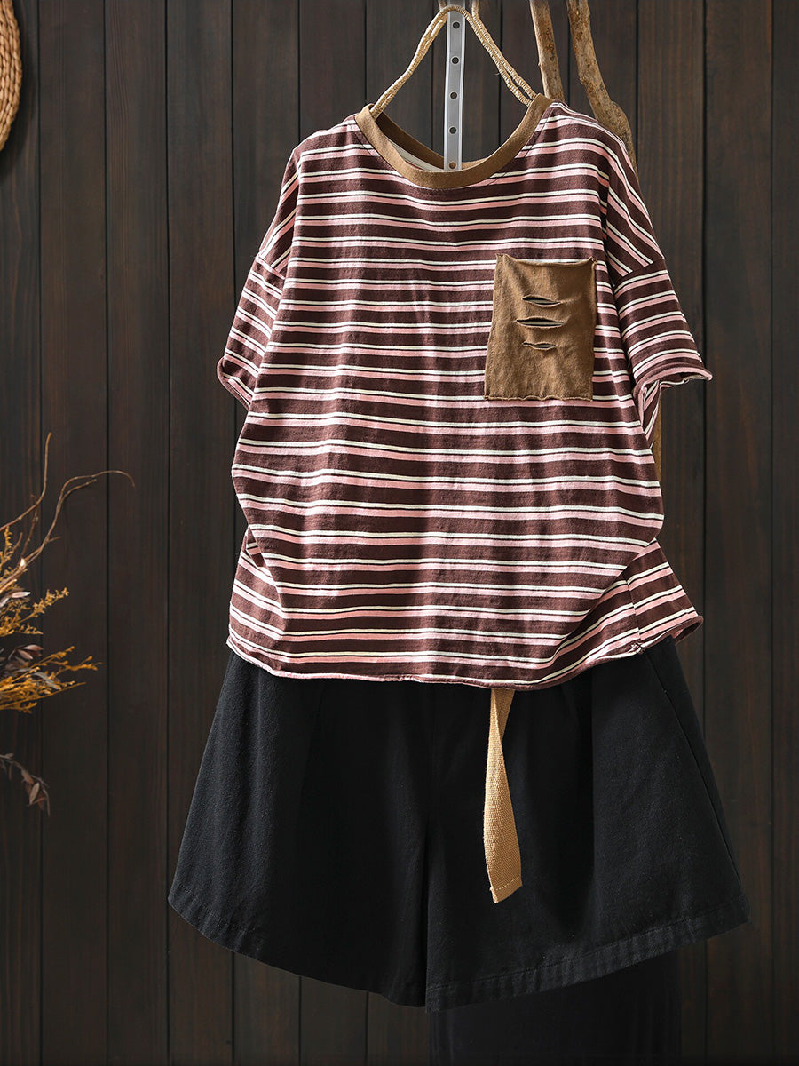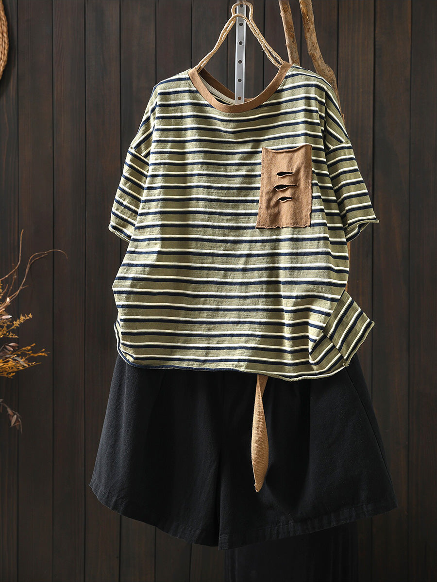 Women Summer Casual Stripe Cotton O-Neck Shirt