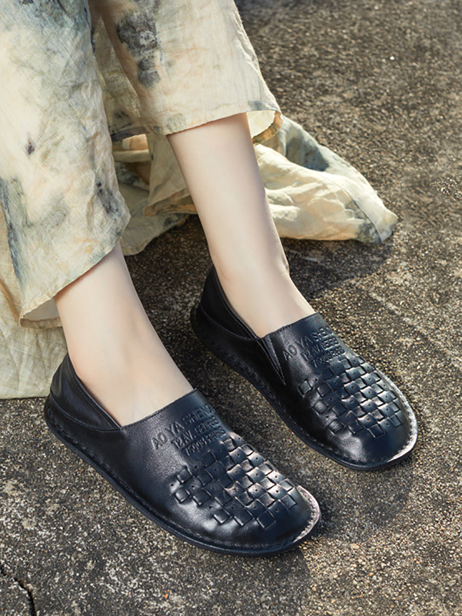 Women Summer Genuine Leather Weave Flat Shoes