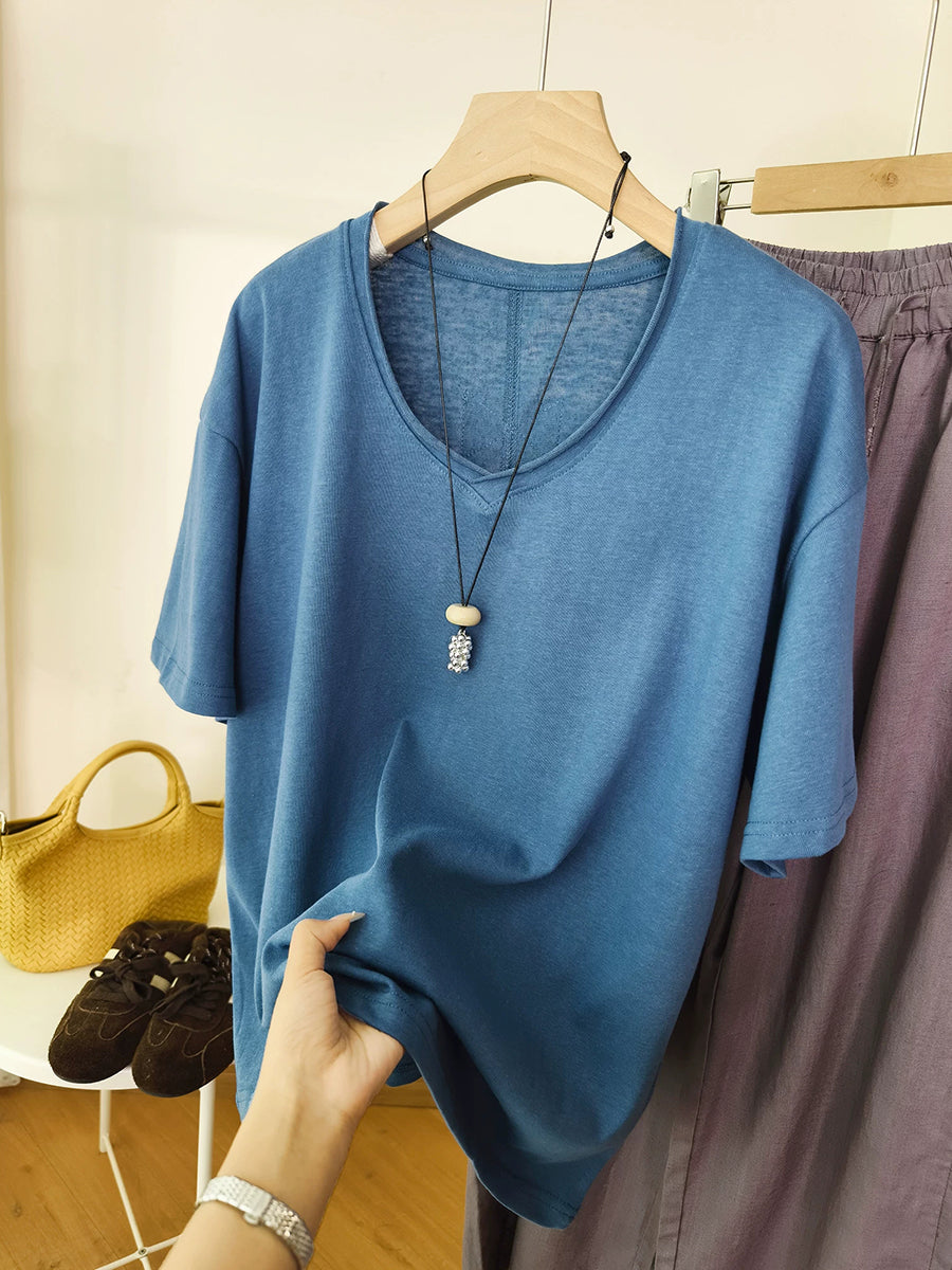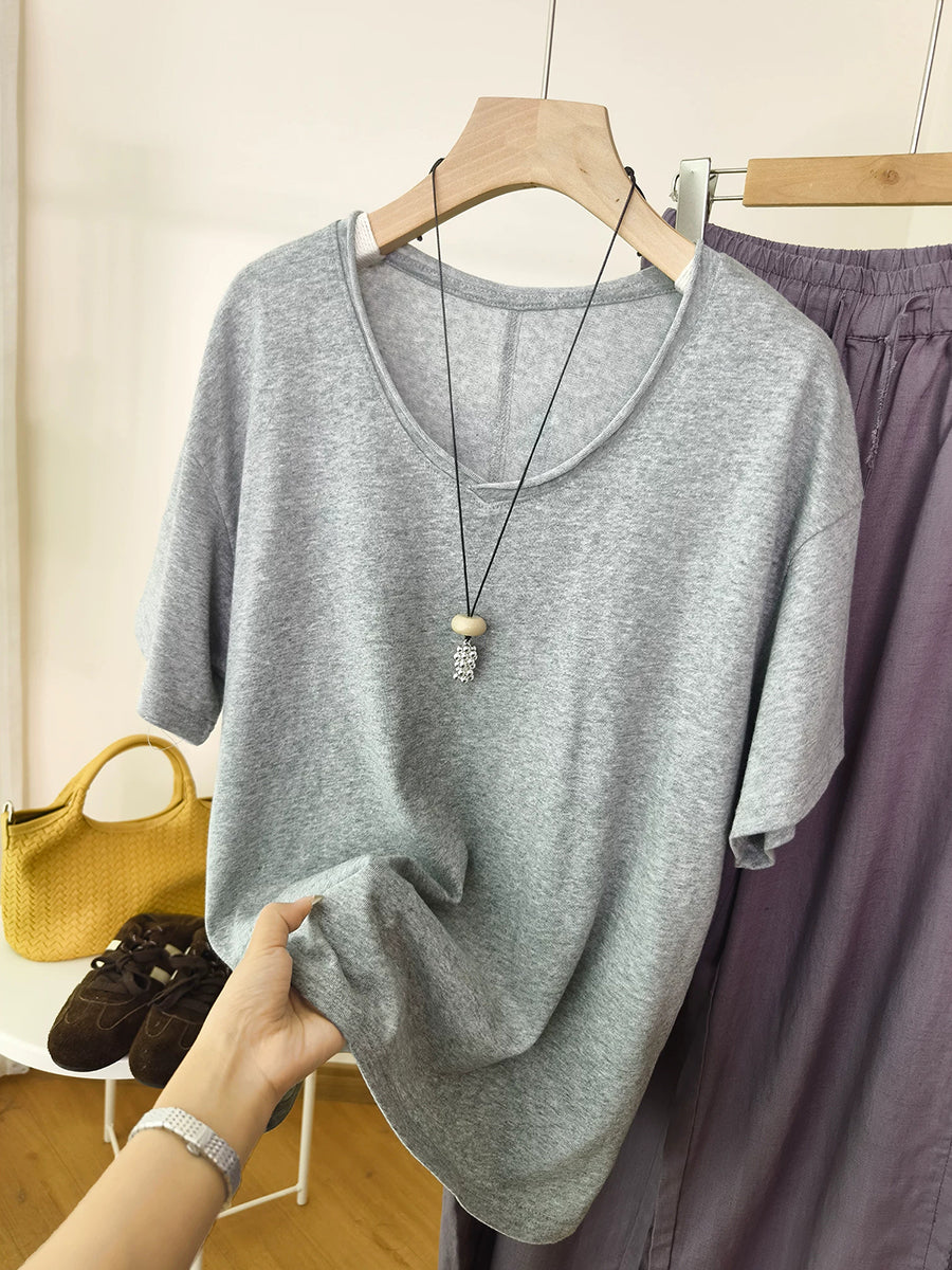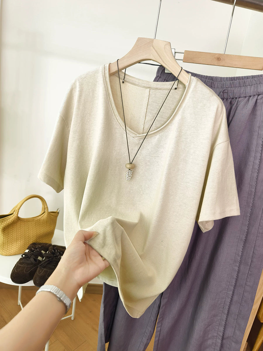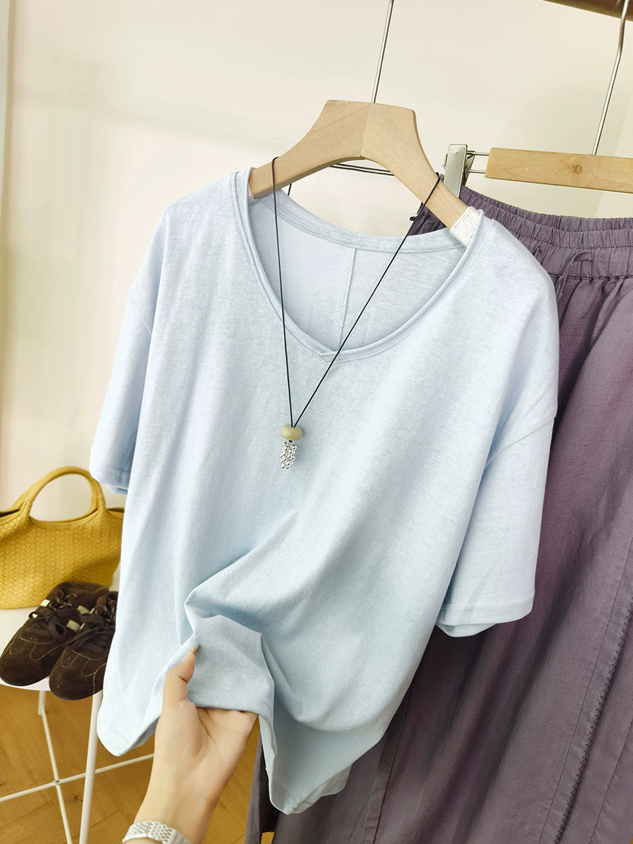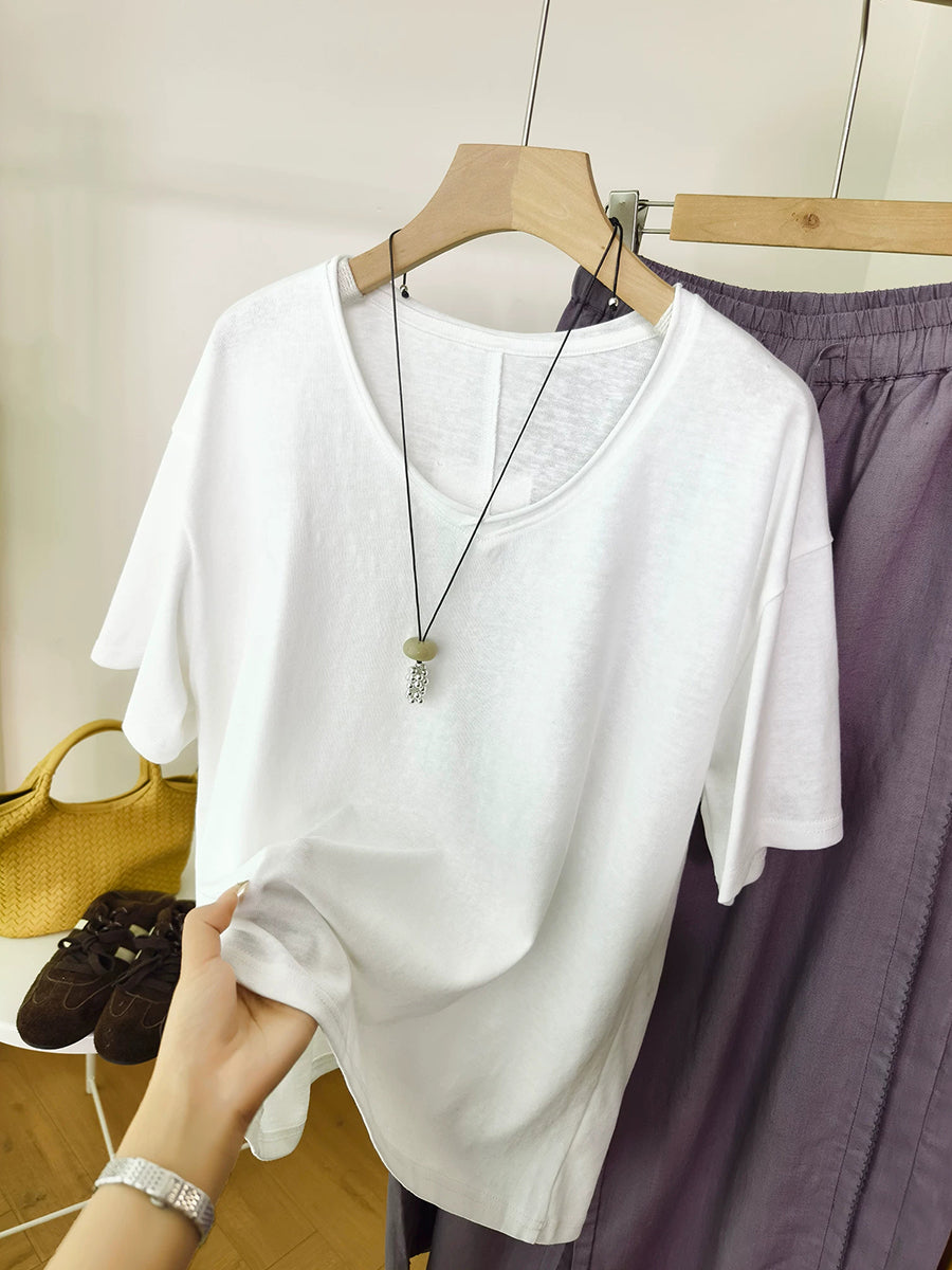 Women Summer O-Neck Pure Color Cotton Shirt