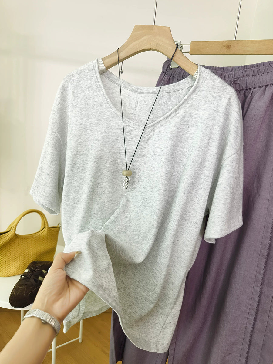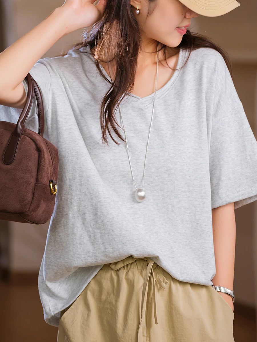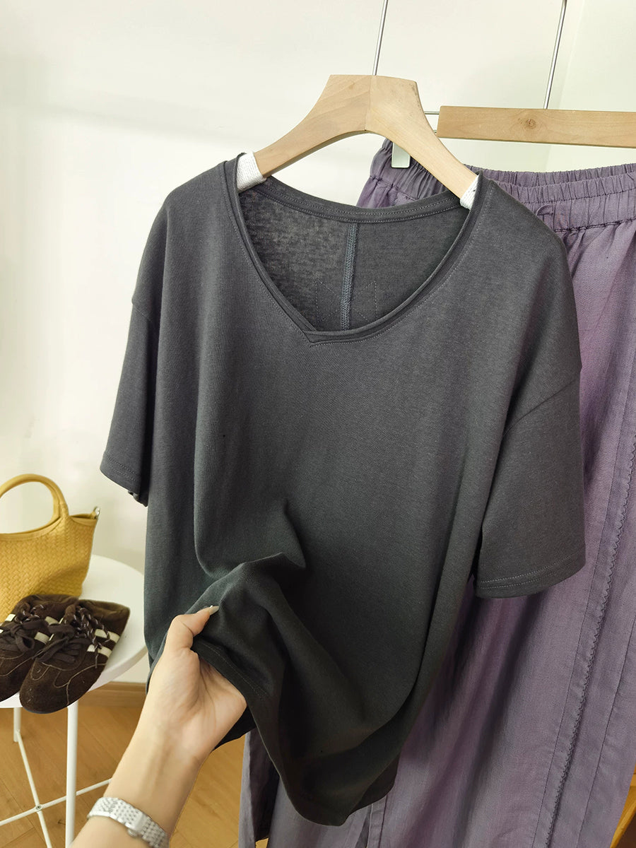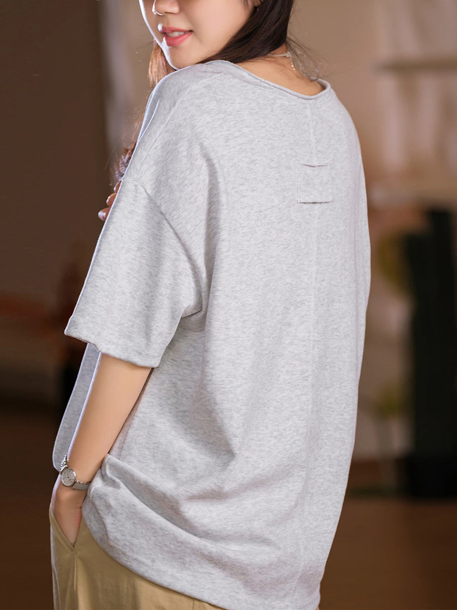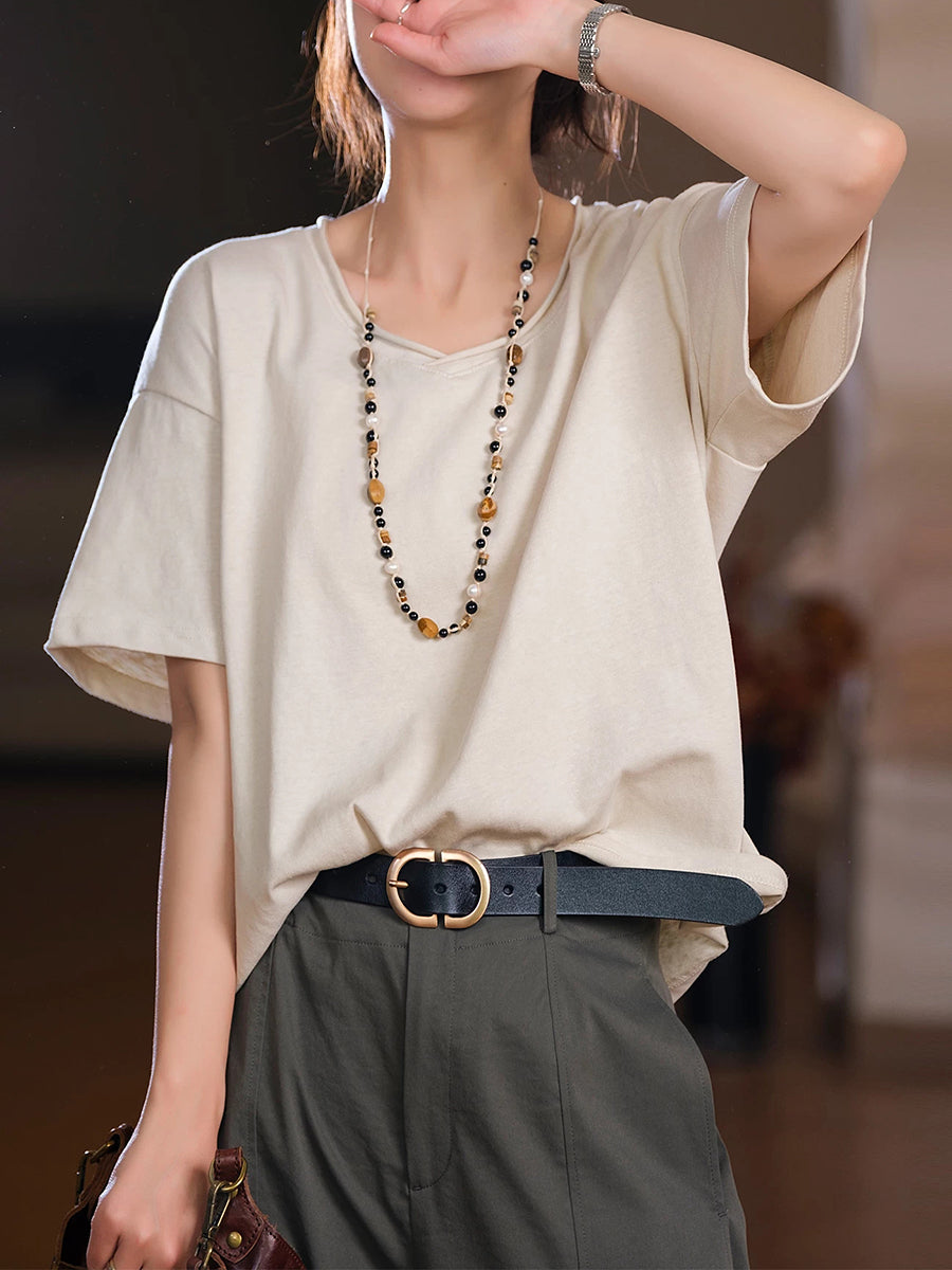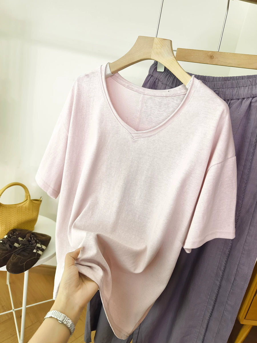 Women Summer O-Neck Pure Color Cotton Shirt