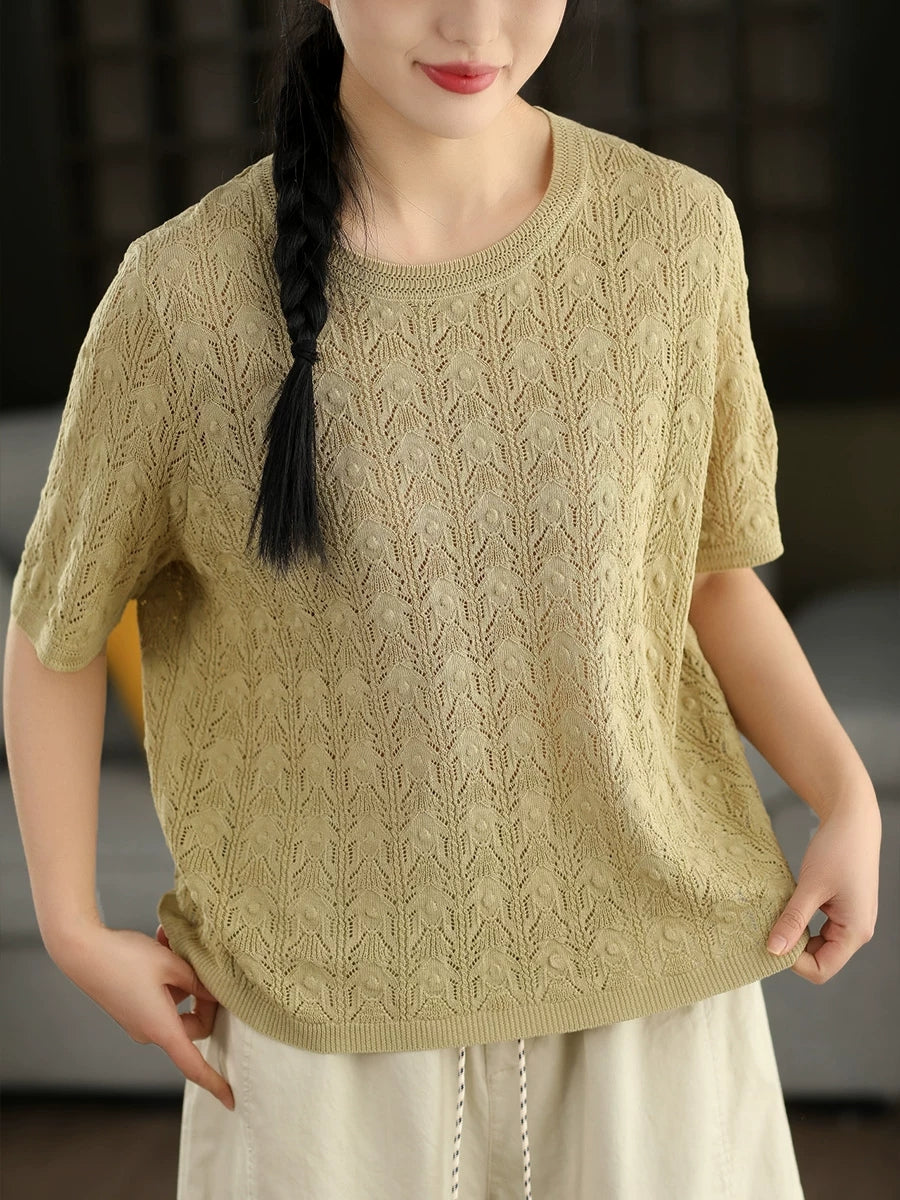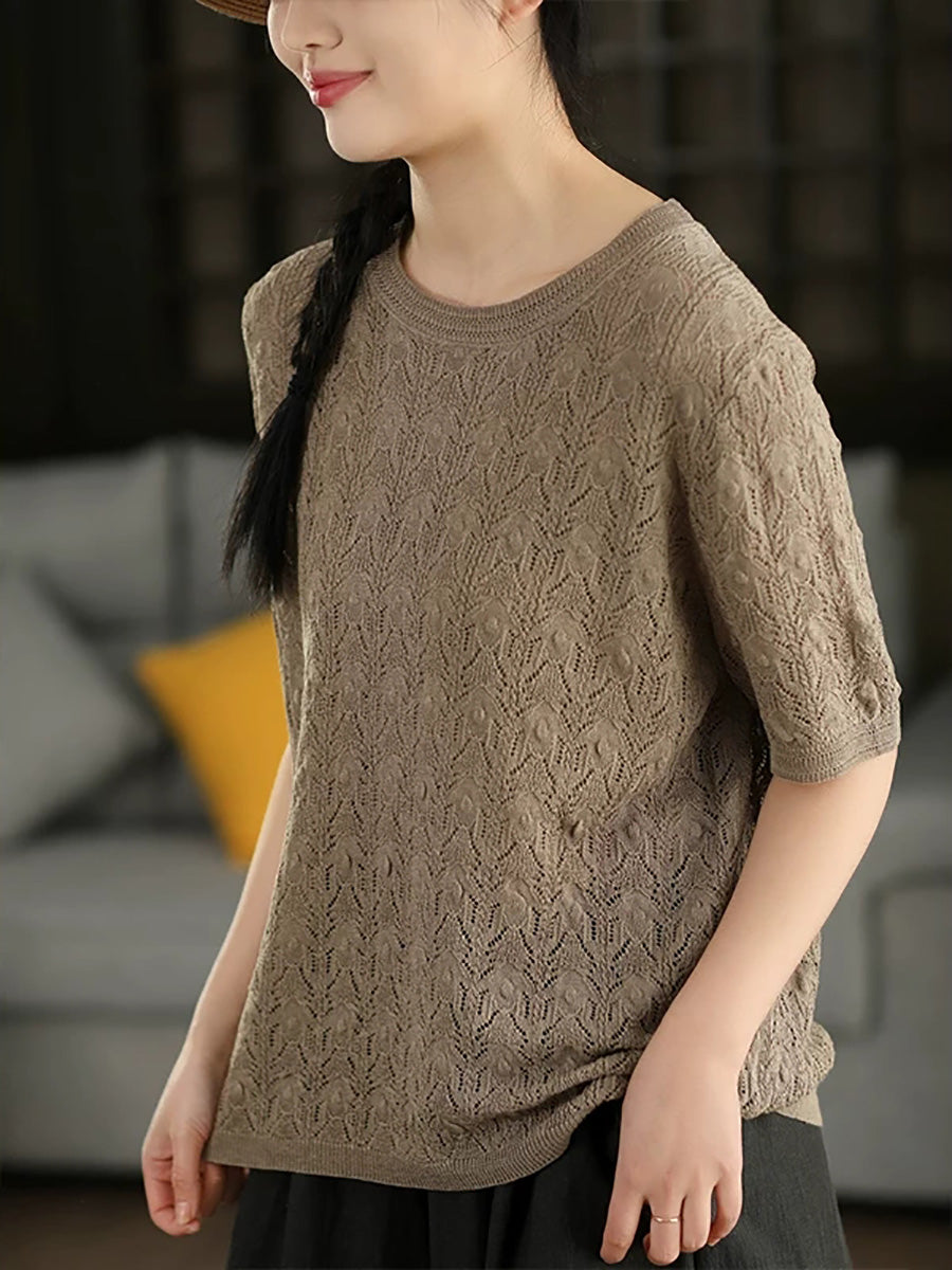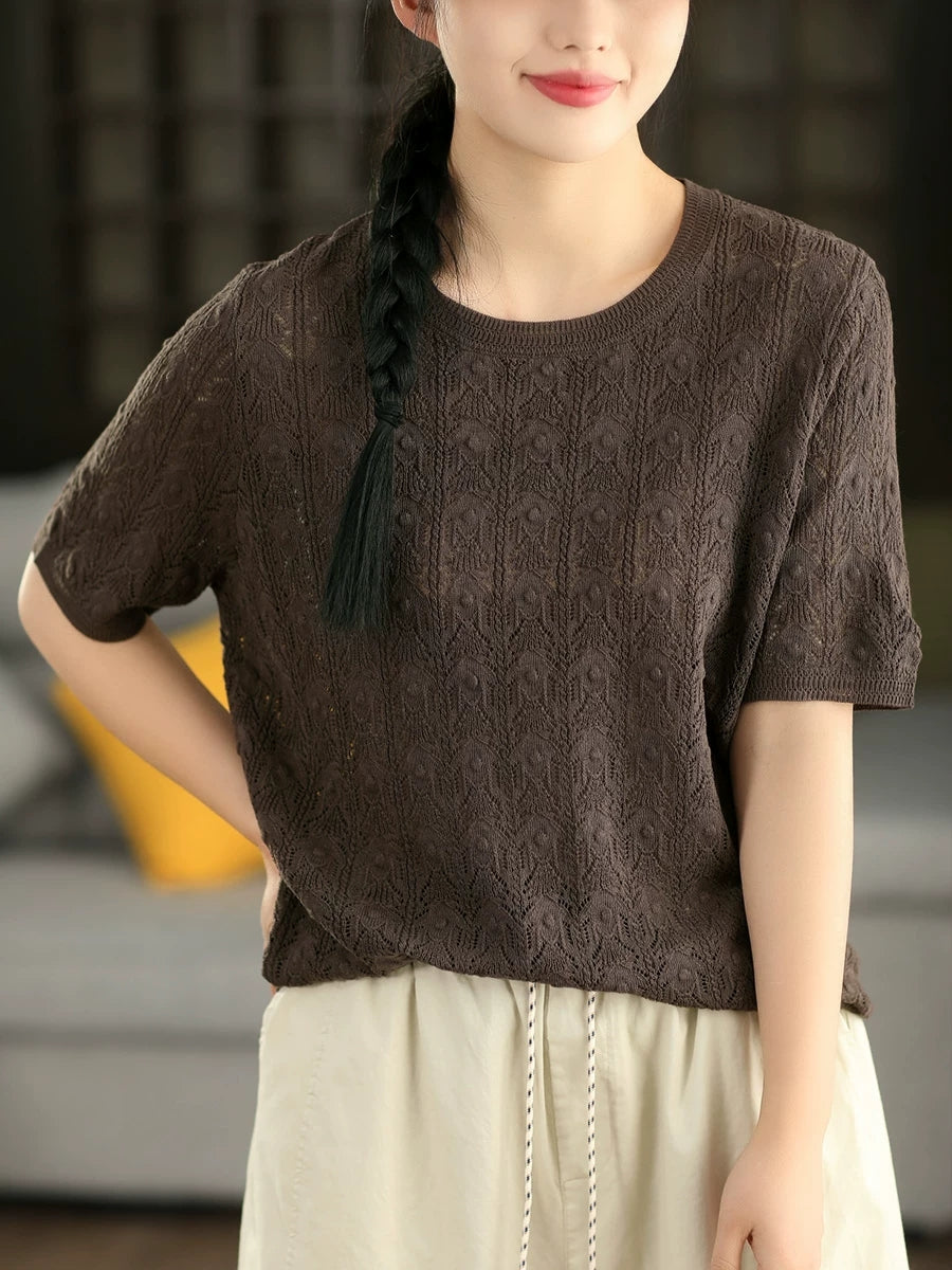 Women Summer Pure Color Linen Knitted Blouse