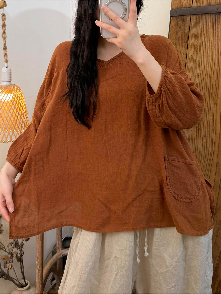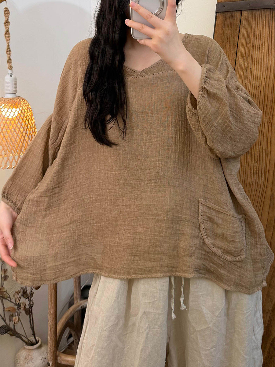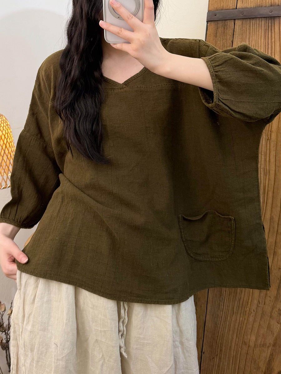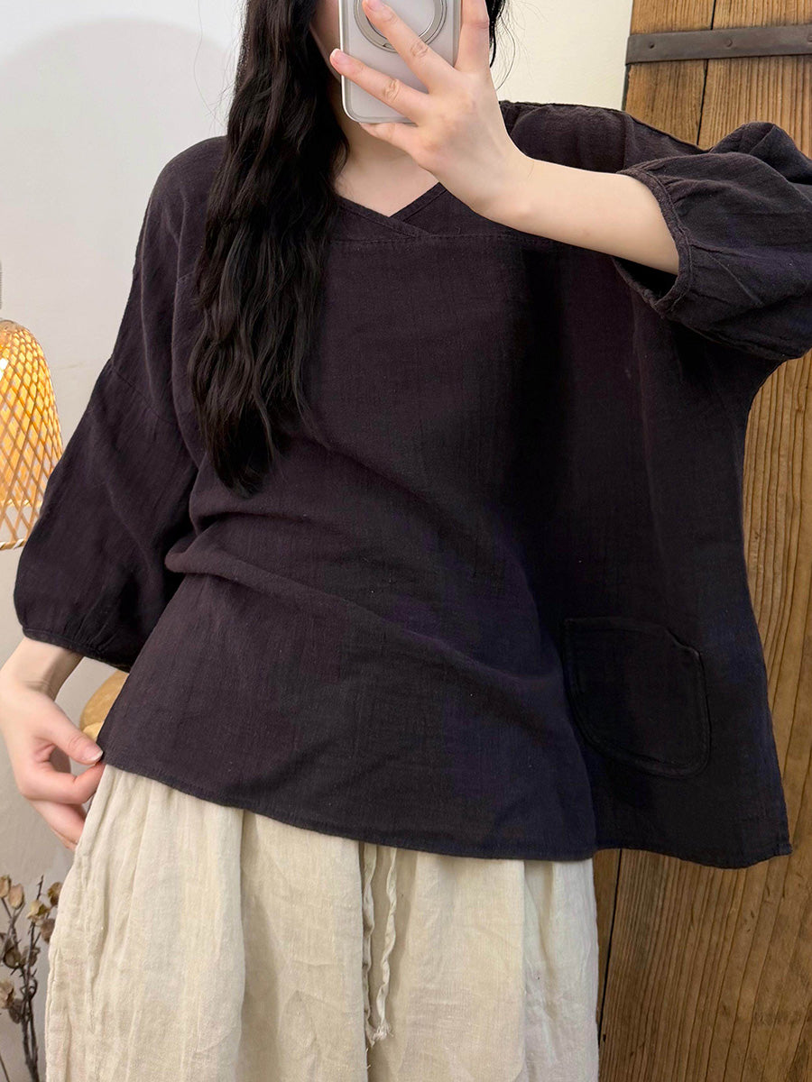 Women Summer Pure Color Linen V-Neck Blouse