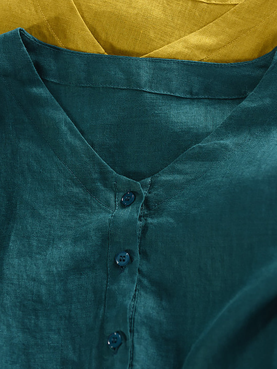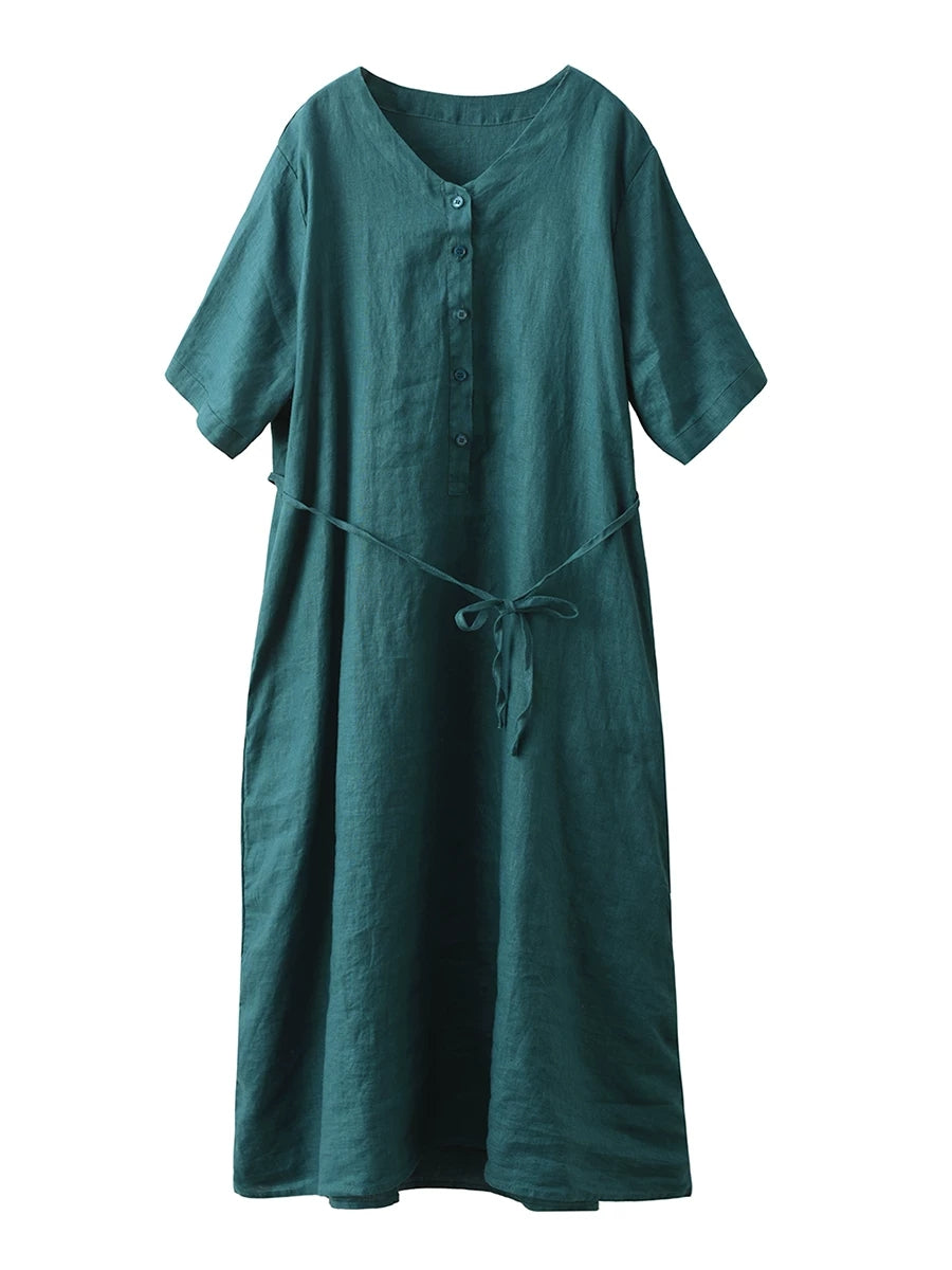 Women Summer Pure Color V-Neck 100%Linen Dress