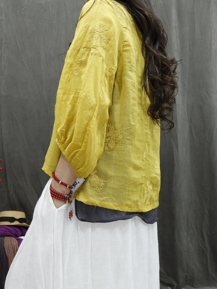 Women Summer Retro Embroidery Ramie Blouse