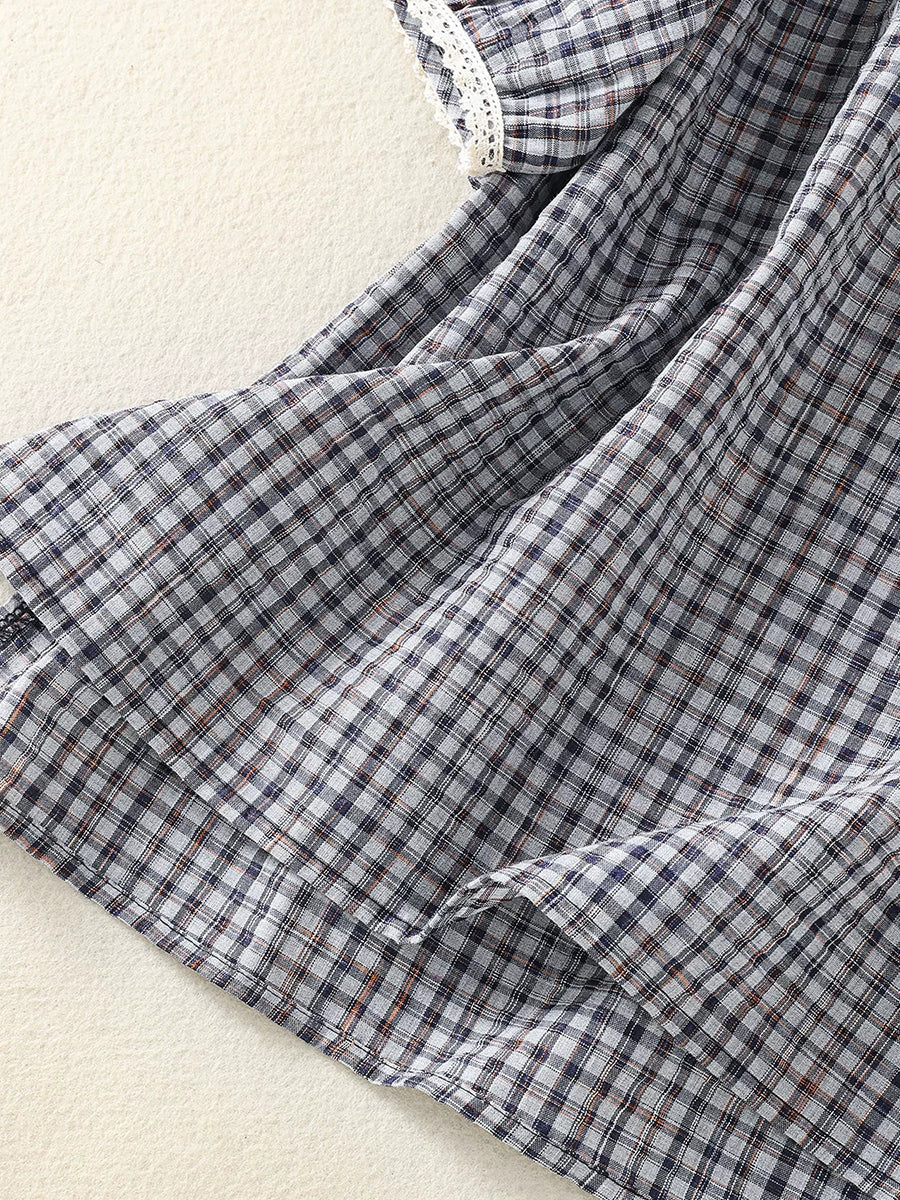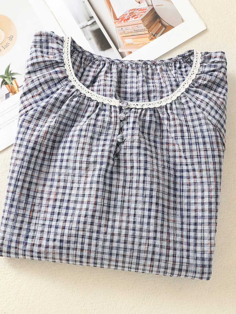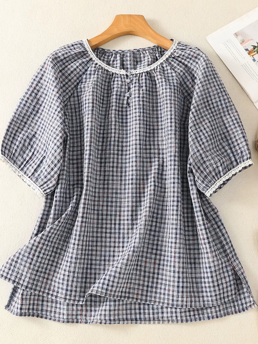 Women Summer Retro Plaid O-Neck Blouse