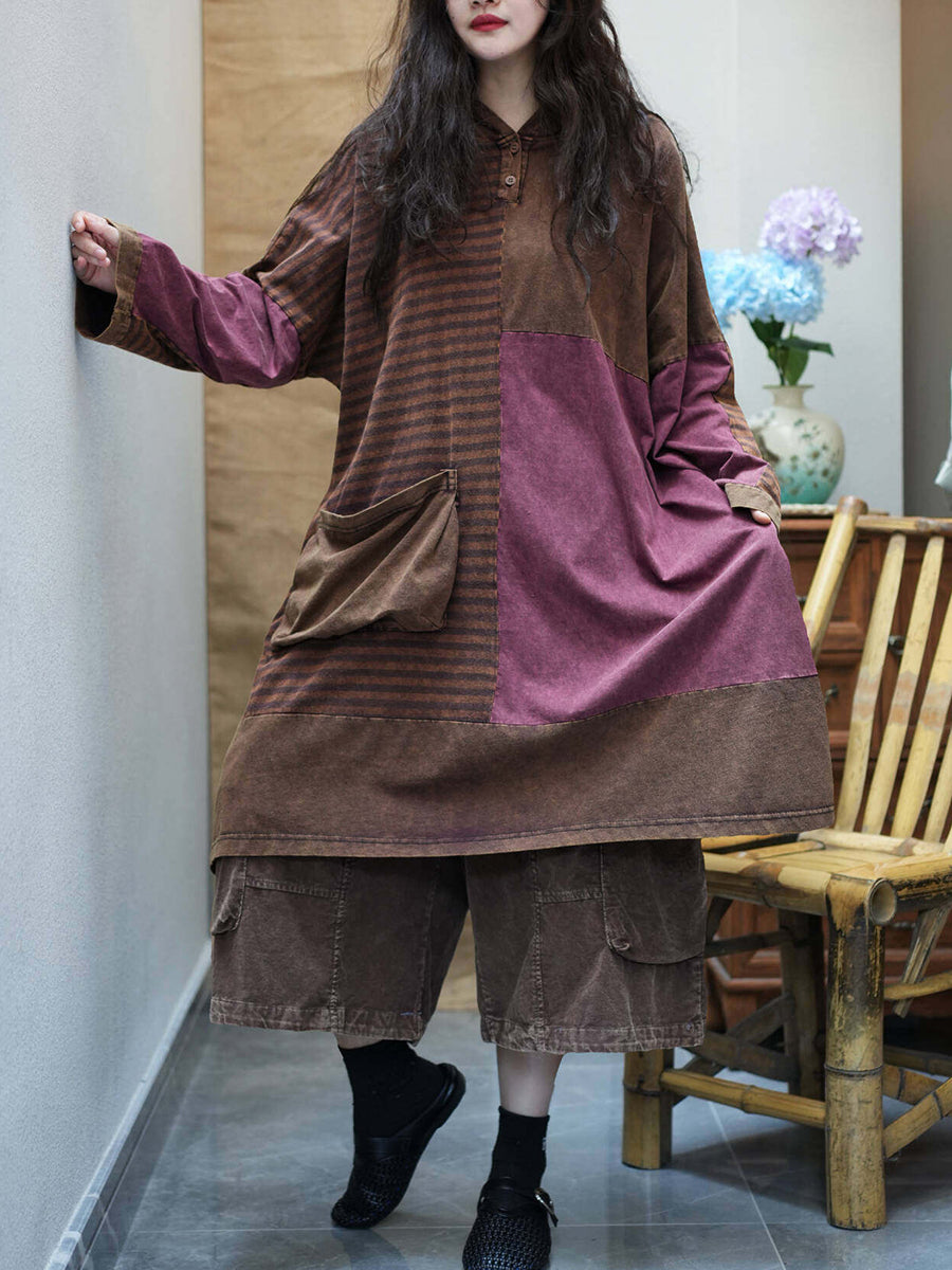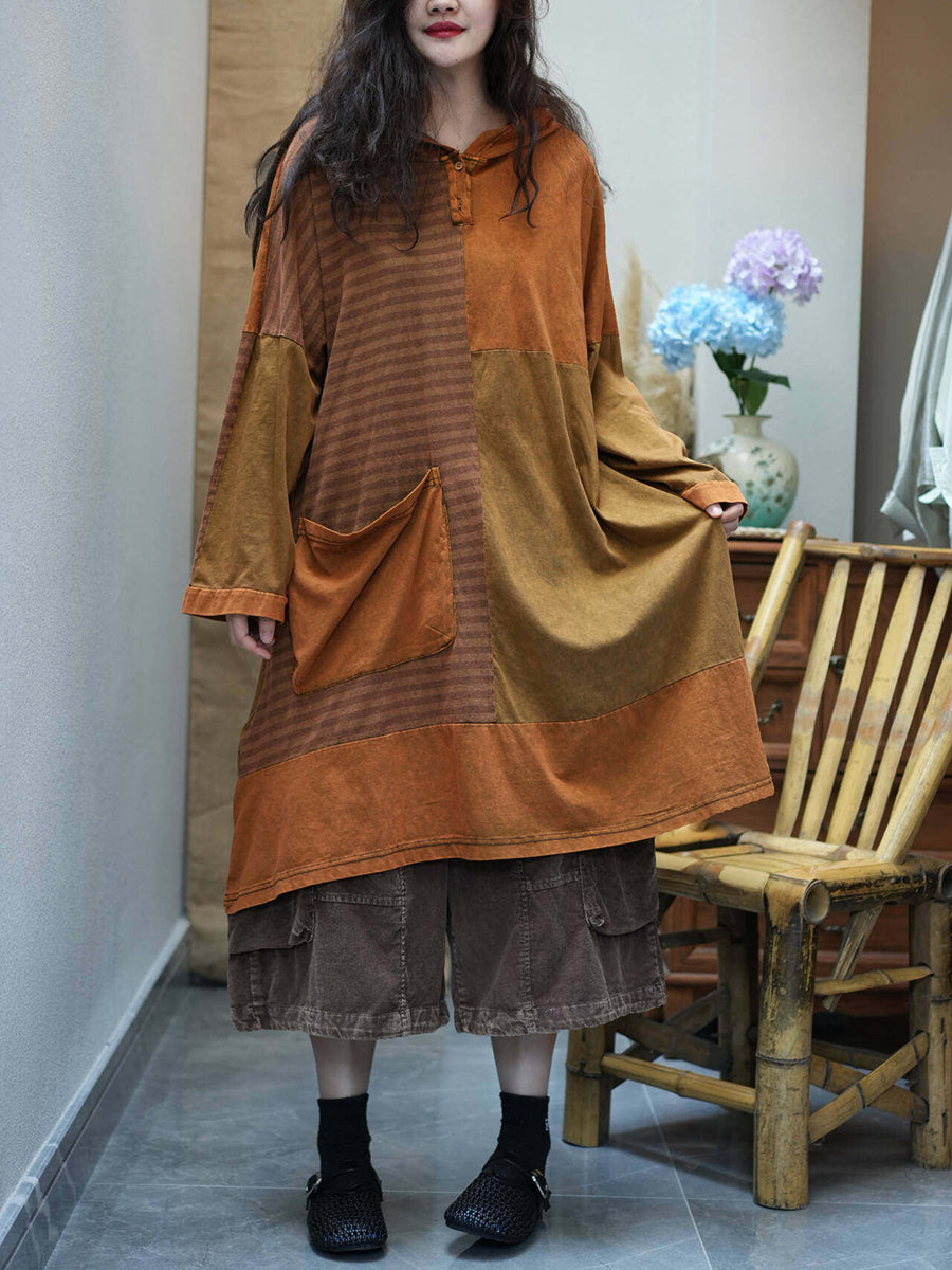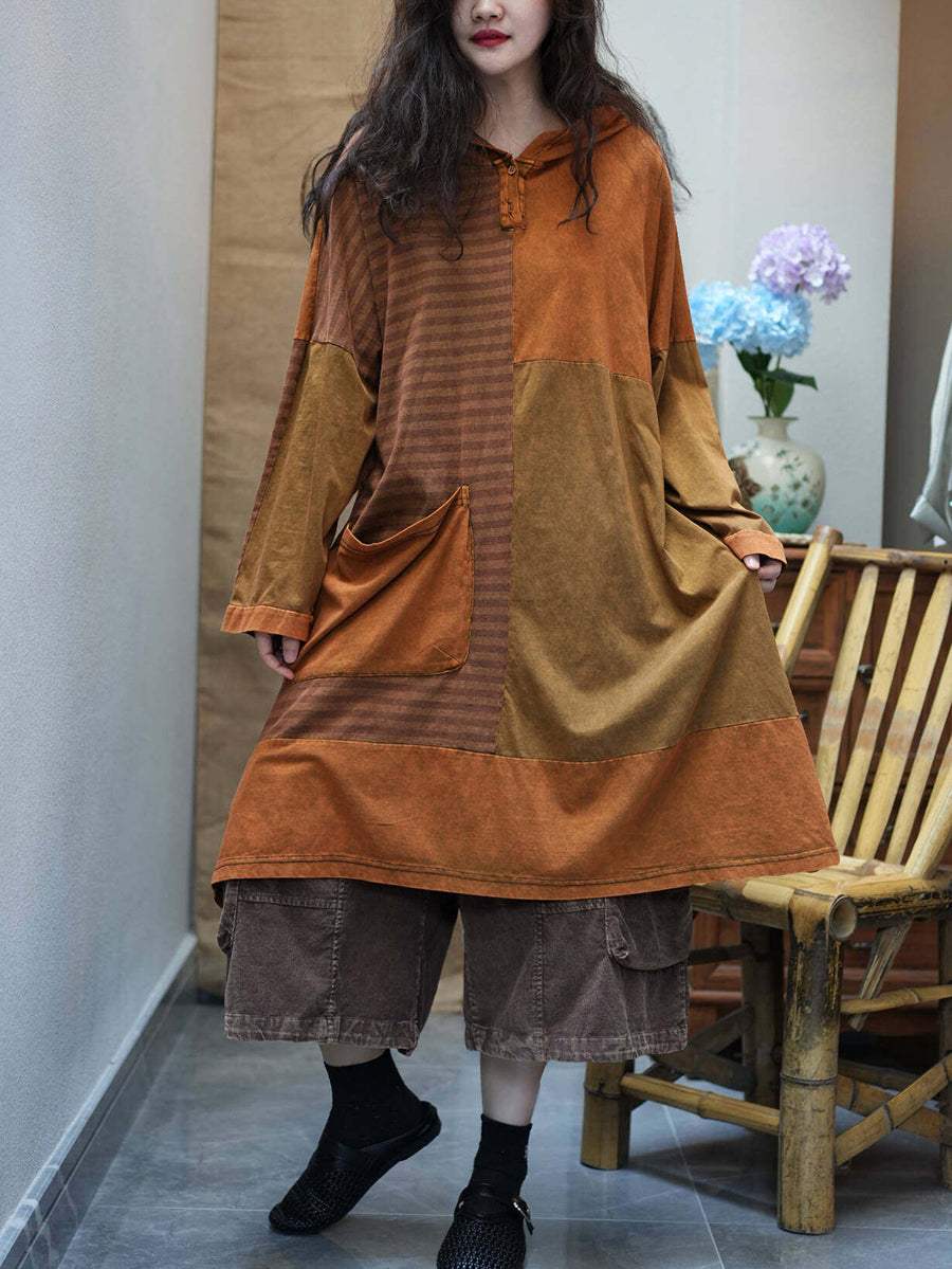 Women Summer Retro Stripe Spliced Hooded Dress