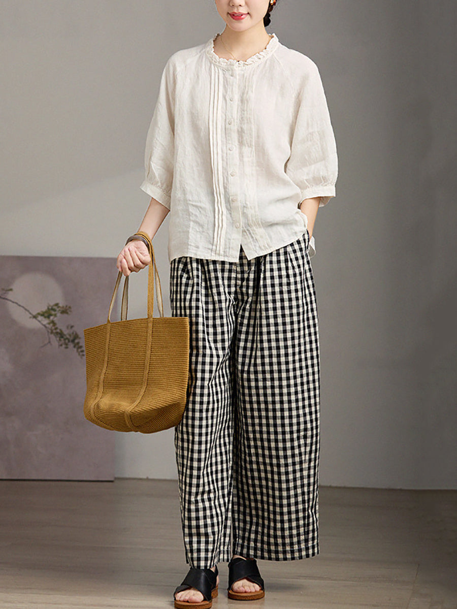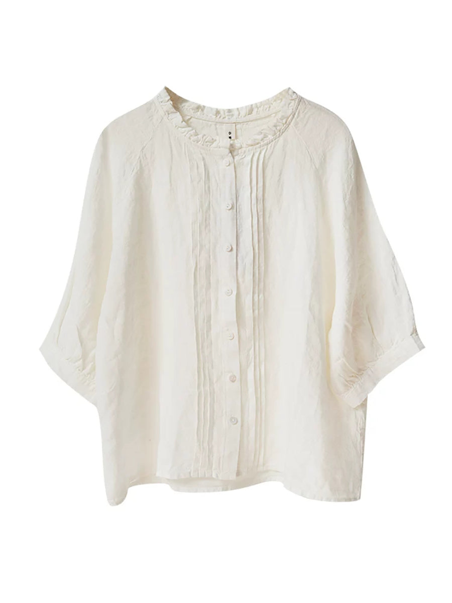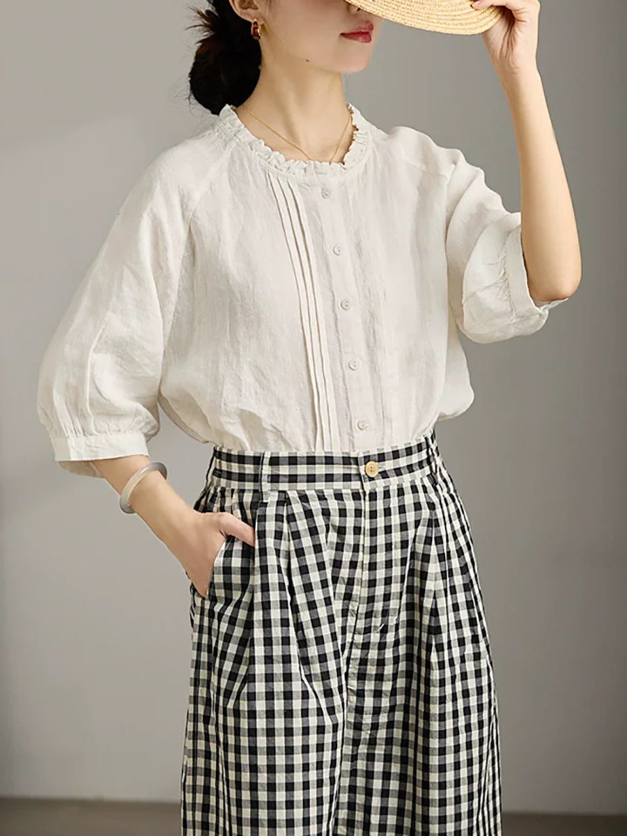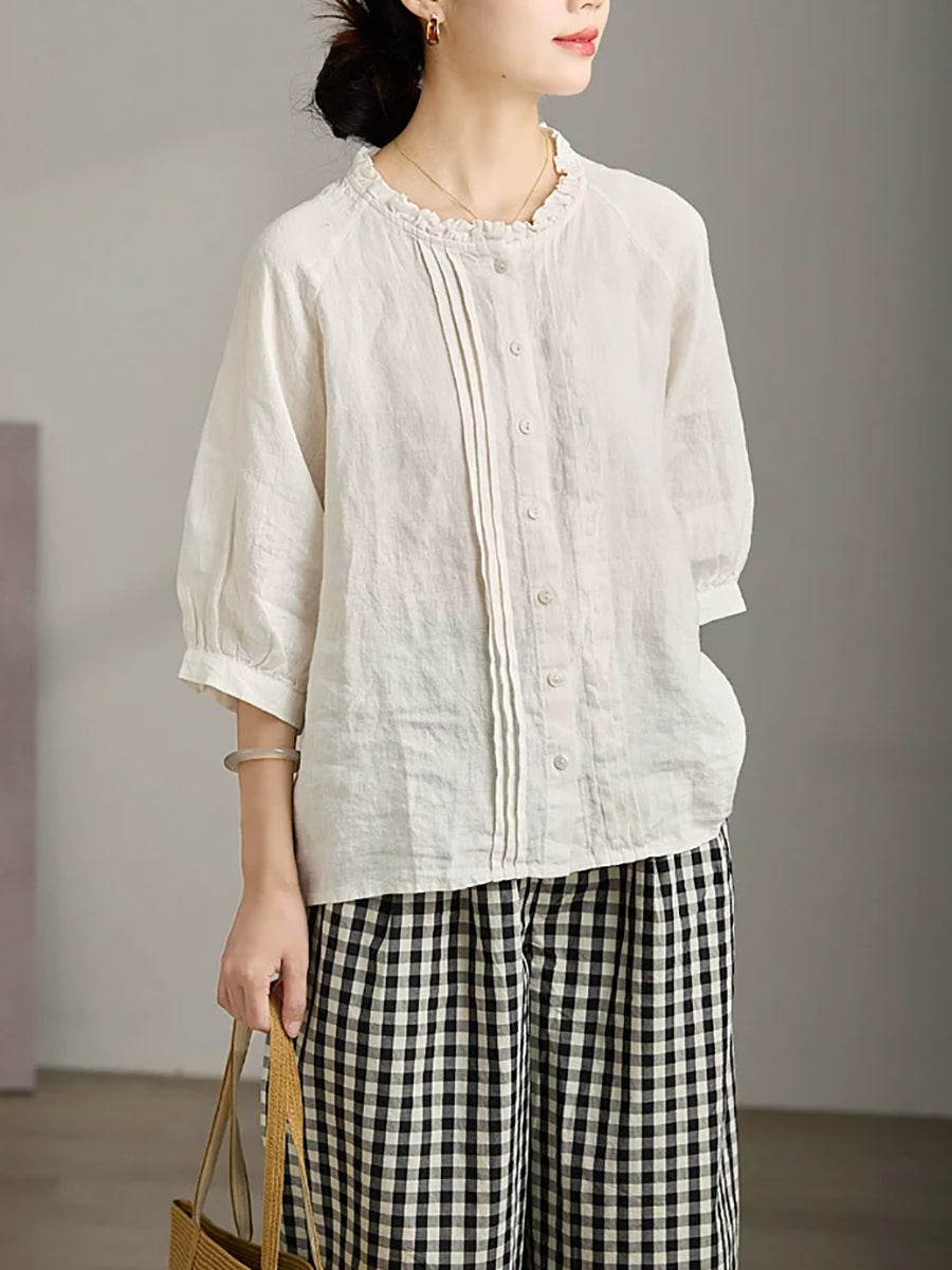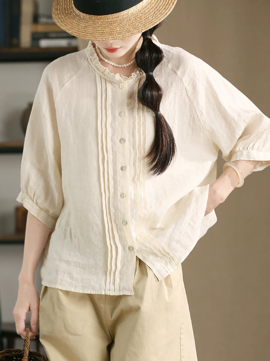 Women Summer Shirred Stand Collar 100%Linen Blouse