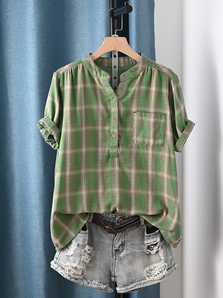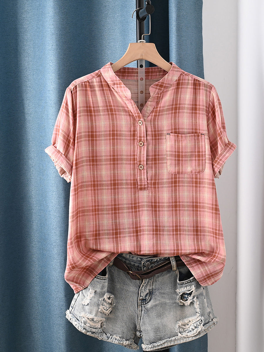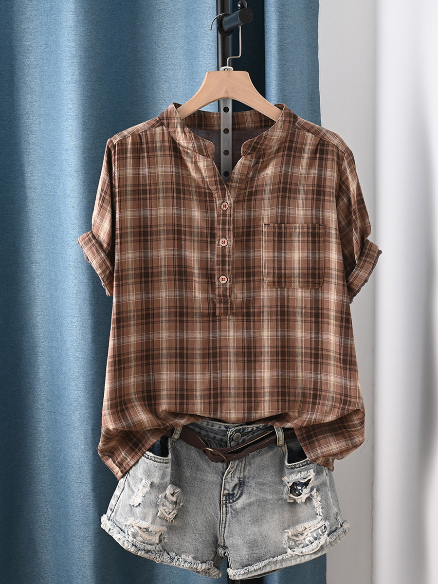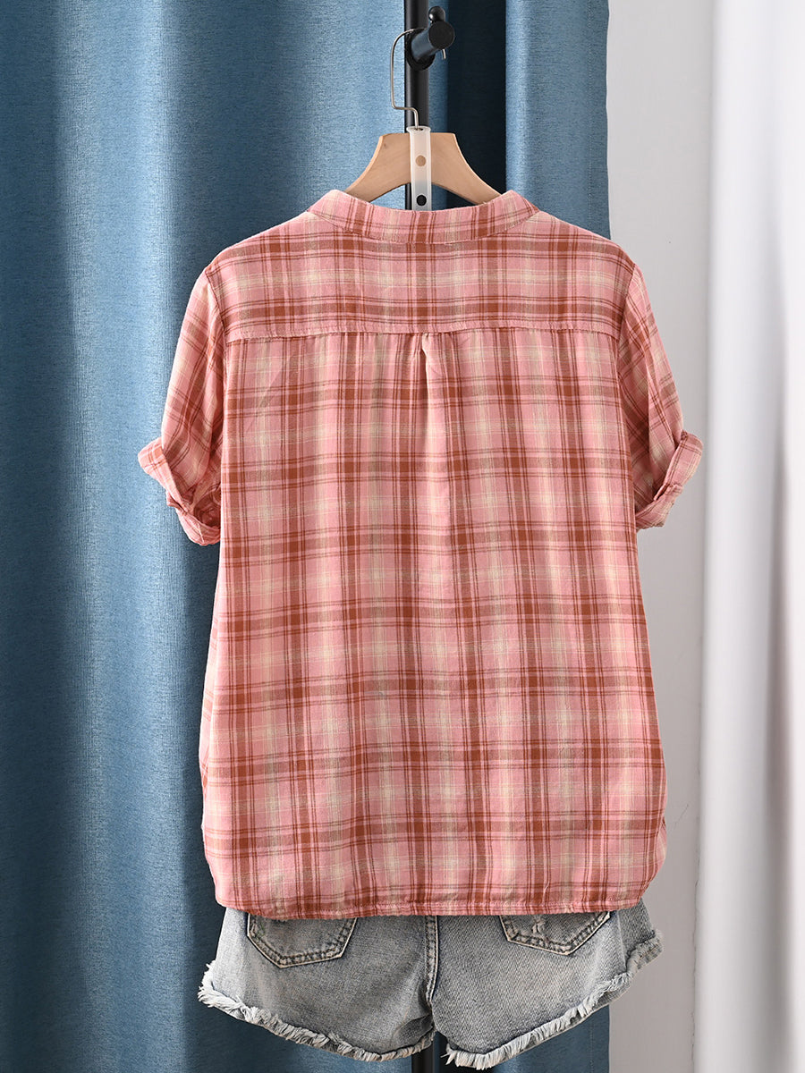 Women Summer Vintage Plaid O-Neck 100%Cotton Shirt