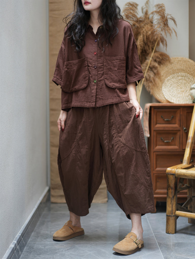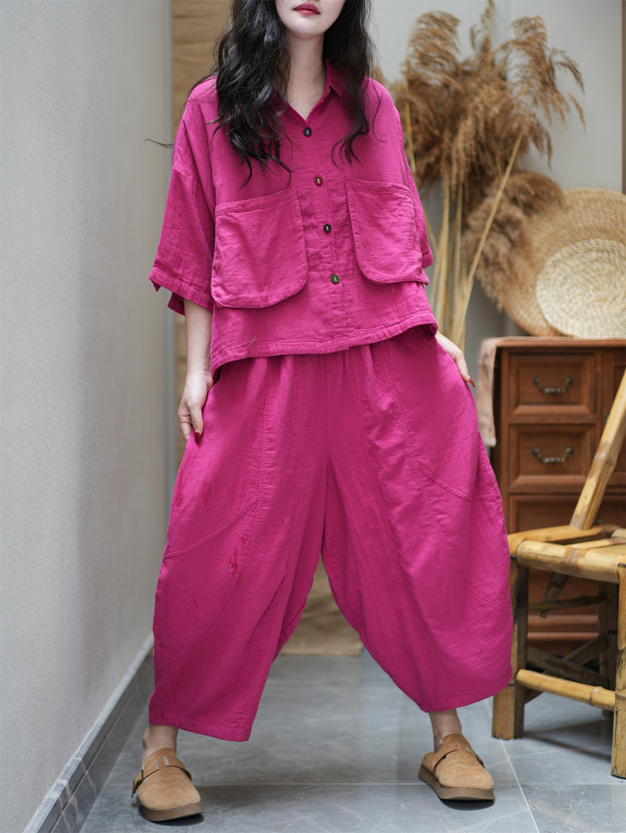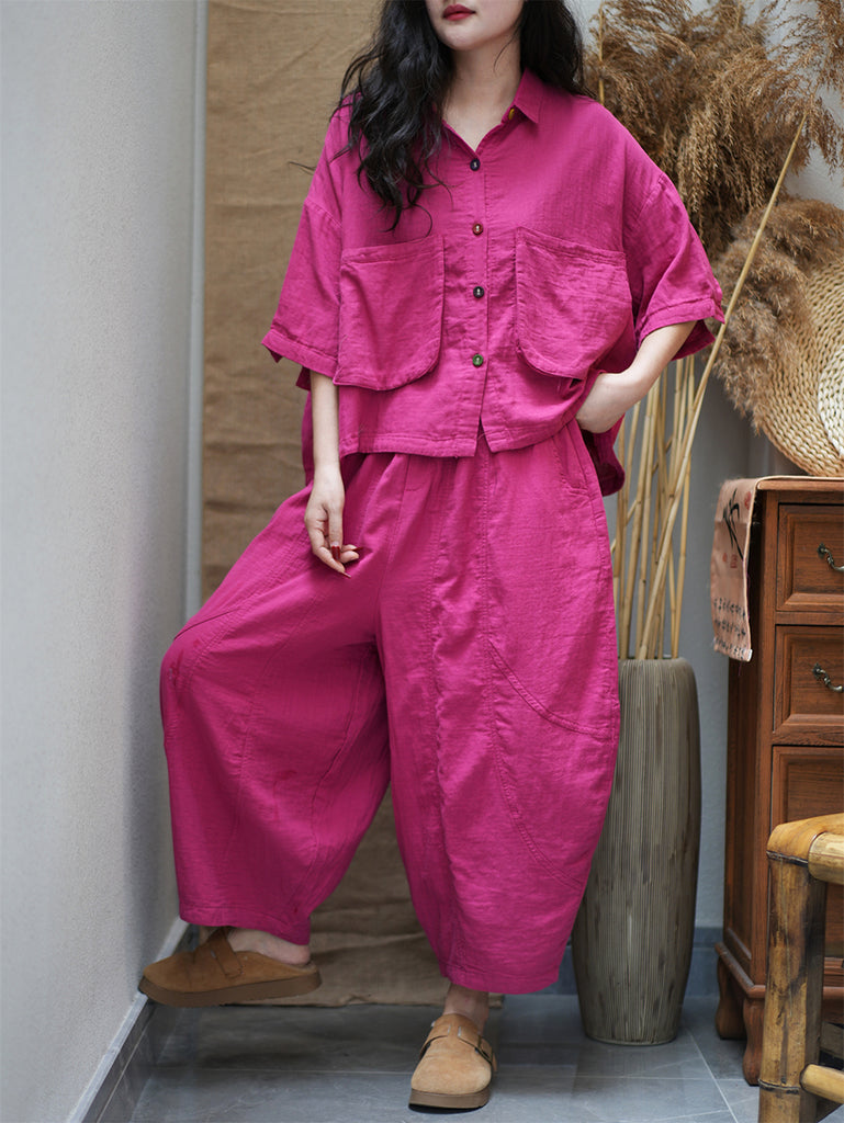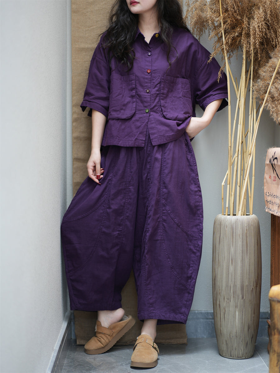 Plus Size Women Summer Vintage Pure Color Loose Suits