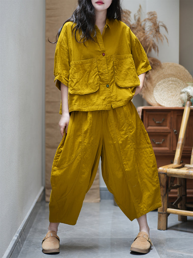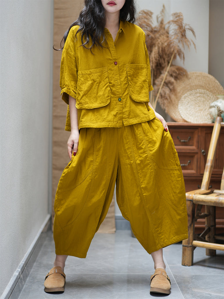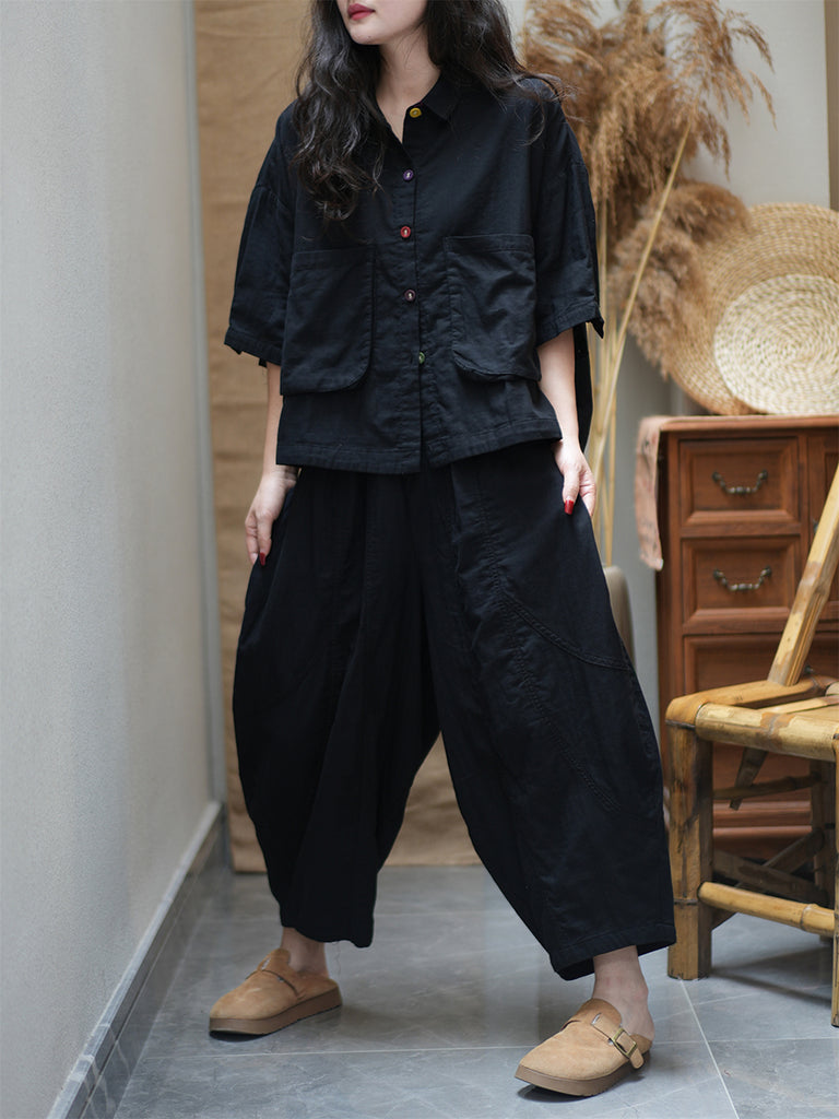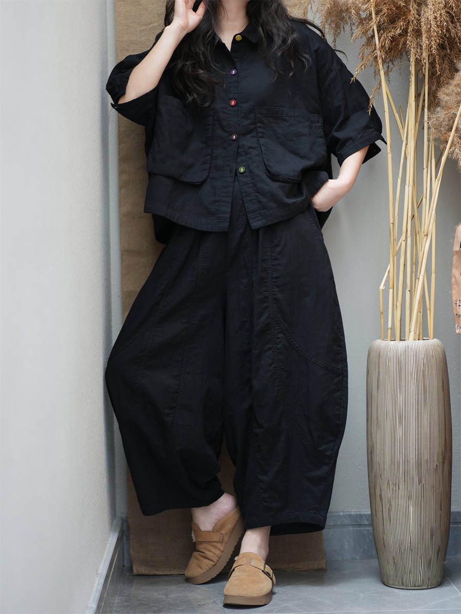Plus Size Women Summer Vintage Pure Color Loose Suits