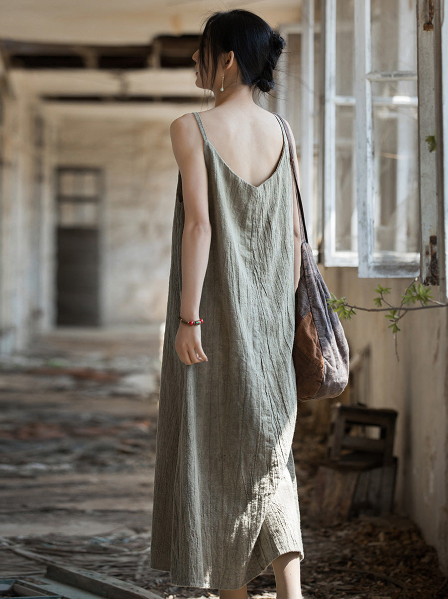 Women Summer Vintage Solid Loose Linen Cotton Vest Dress
