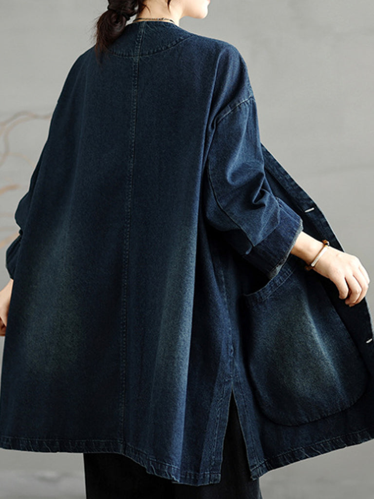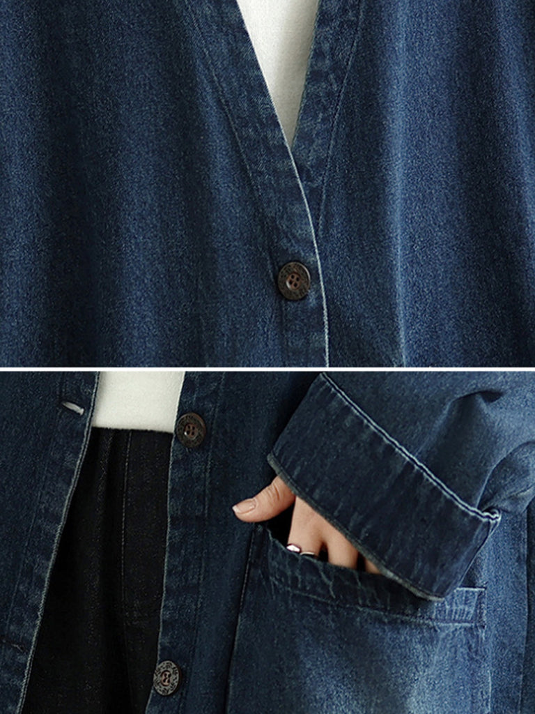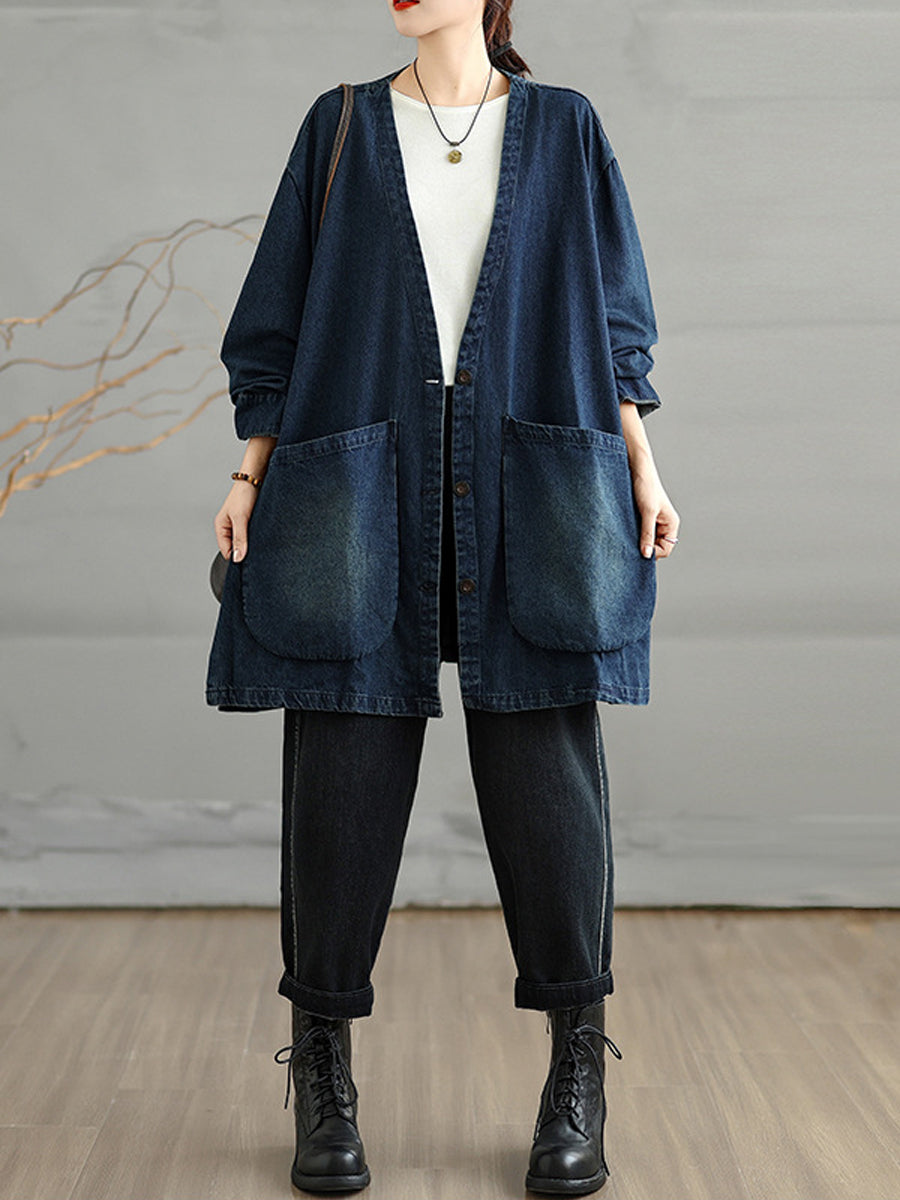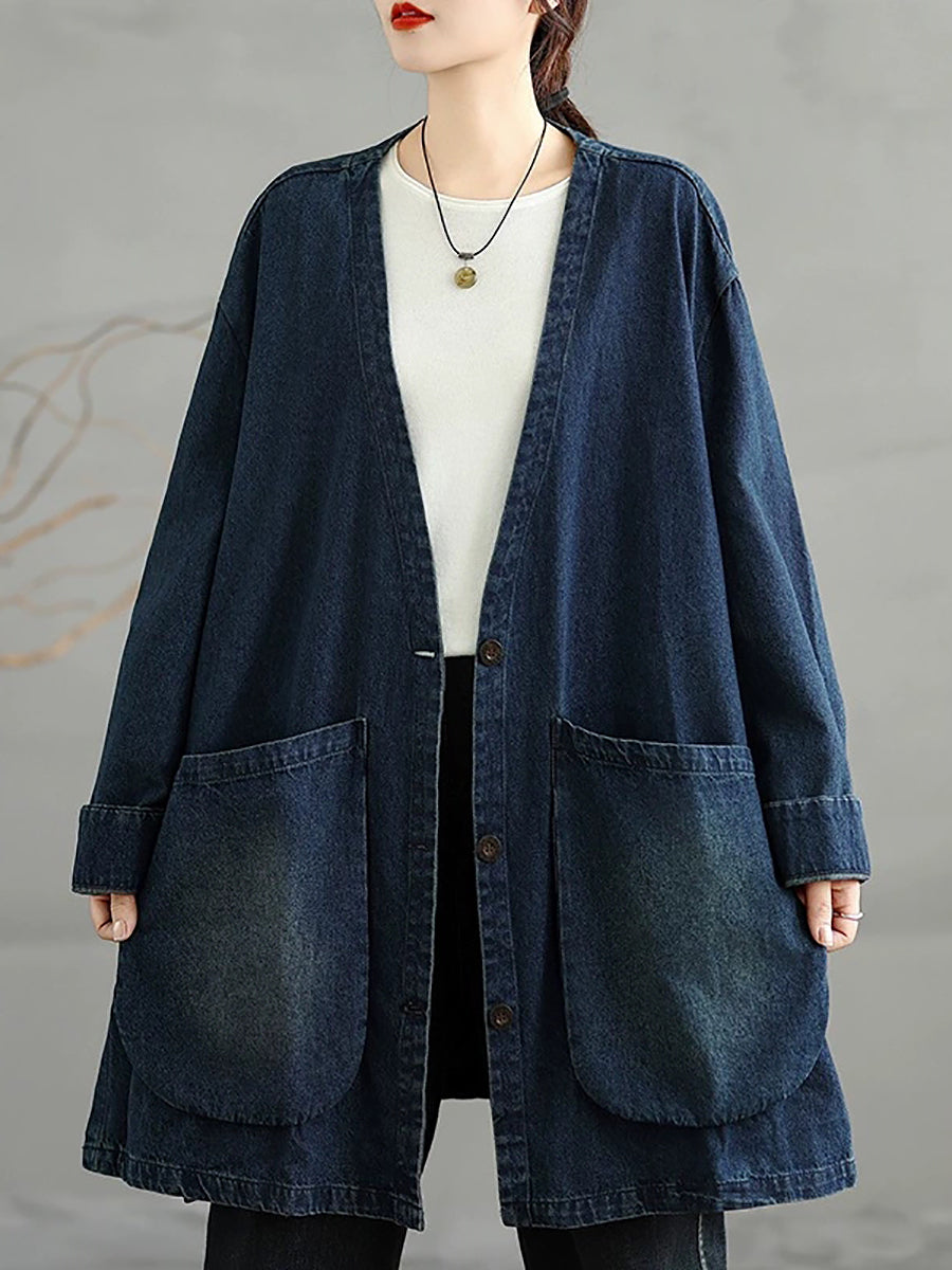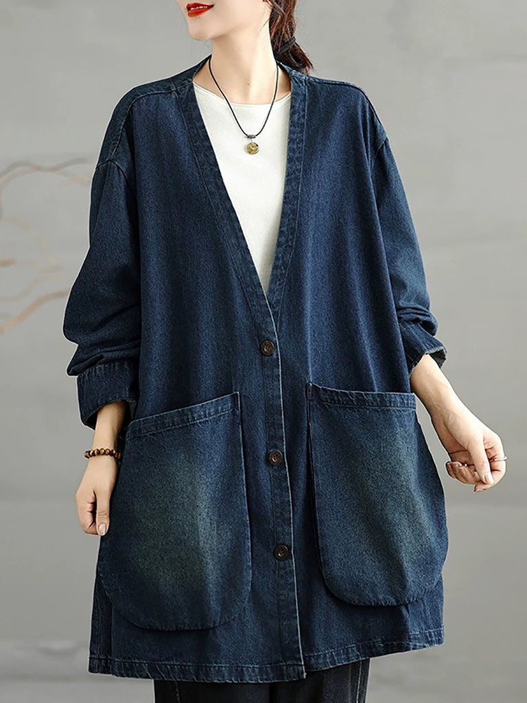 Women Vintage Autumn Pure Color Denim V-Neck Coat
