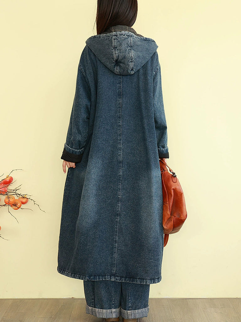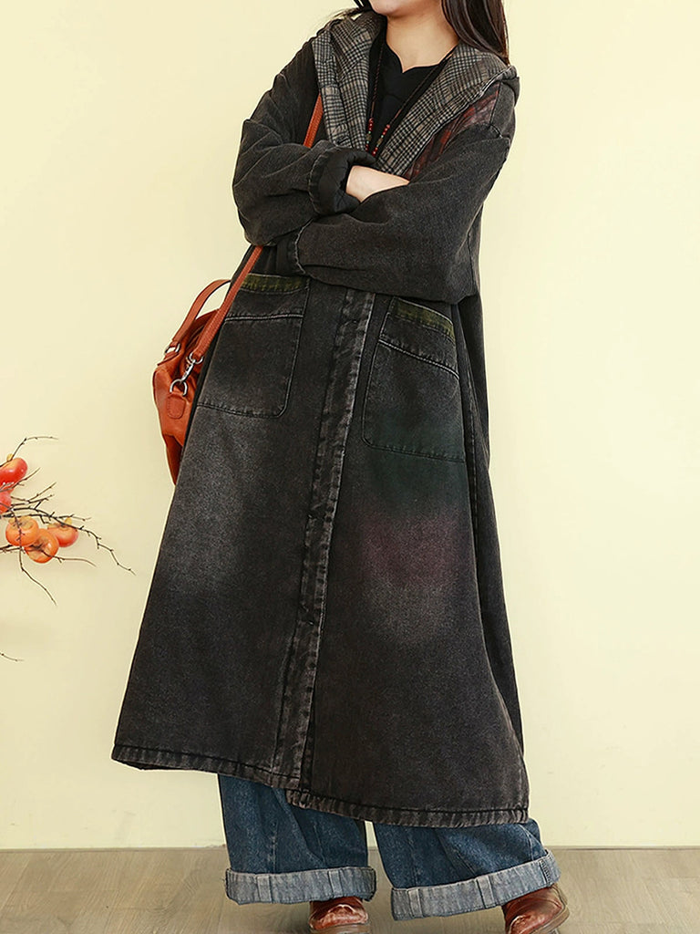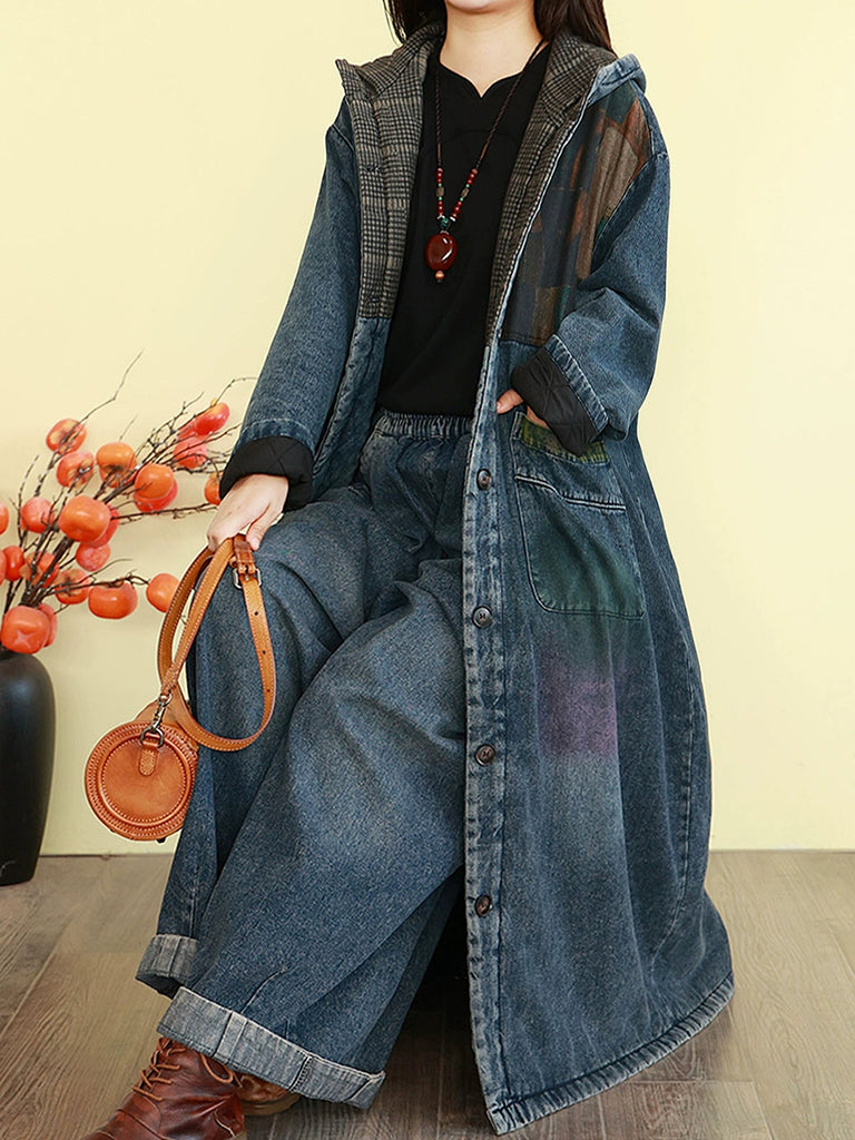 Women Vintage Denim Spliced Padded Hooded Long Coat