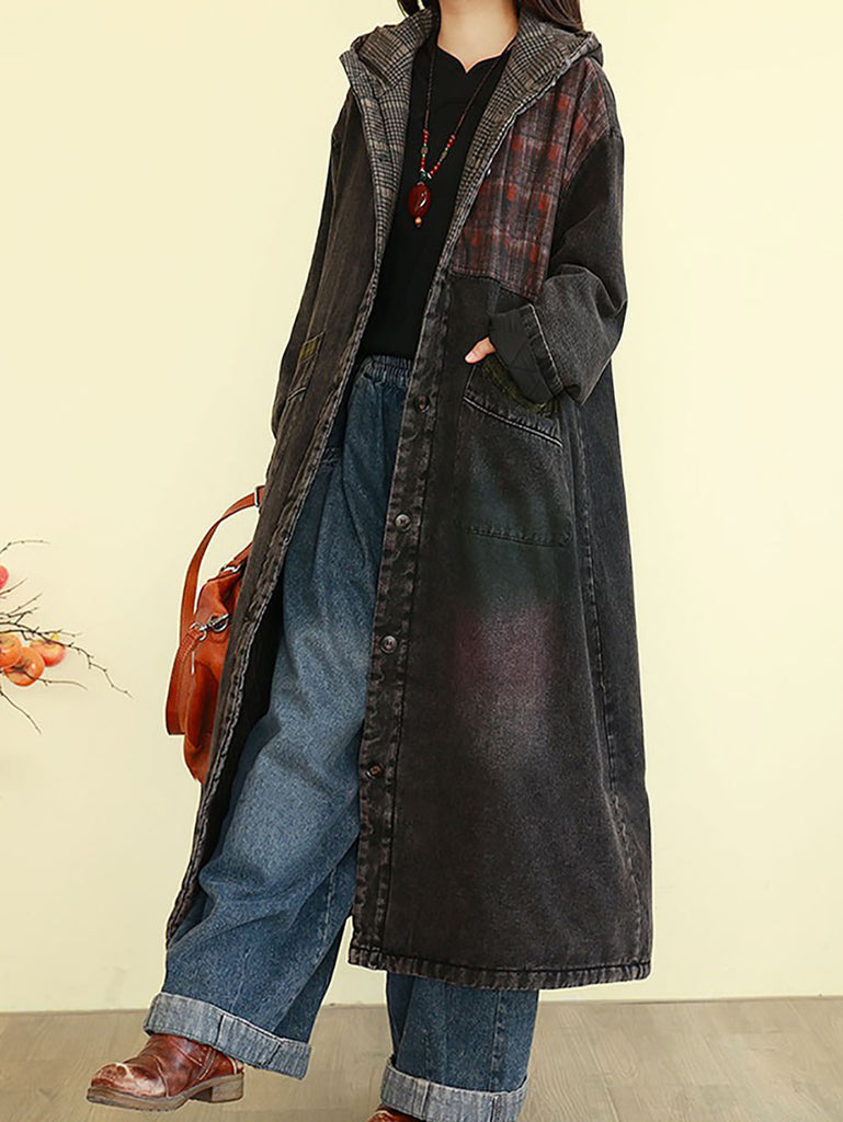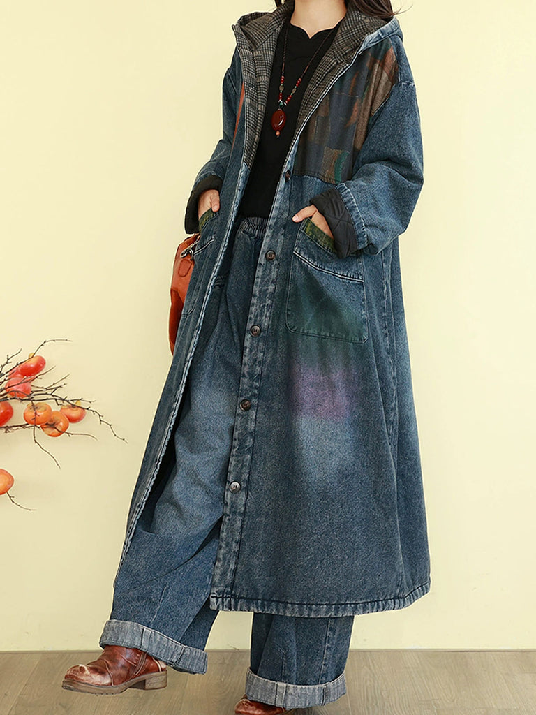 Crafted from denim, this vintage-inspired long coat features a spliced design and padded construction for warmth. It includes a hooded collar and full raglan sleeves with a retro flair, making it an ideal choice for autumn and winter seasons.