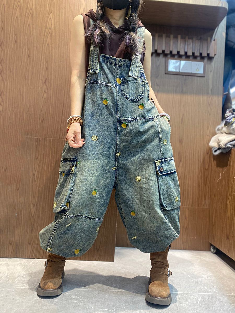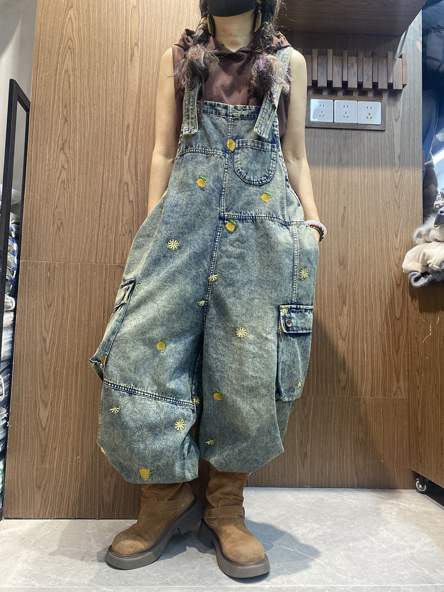 Women Vintage Embroidery Loose Denim Jumpsuits