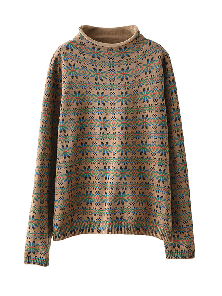 Plus Size Women Vintage Floral Turtleneck Warm Pullover Sweater