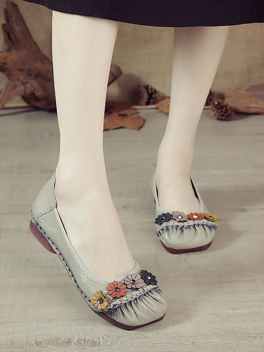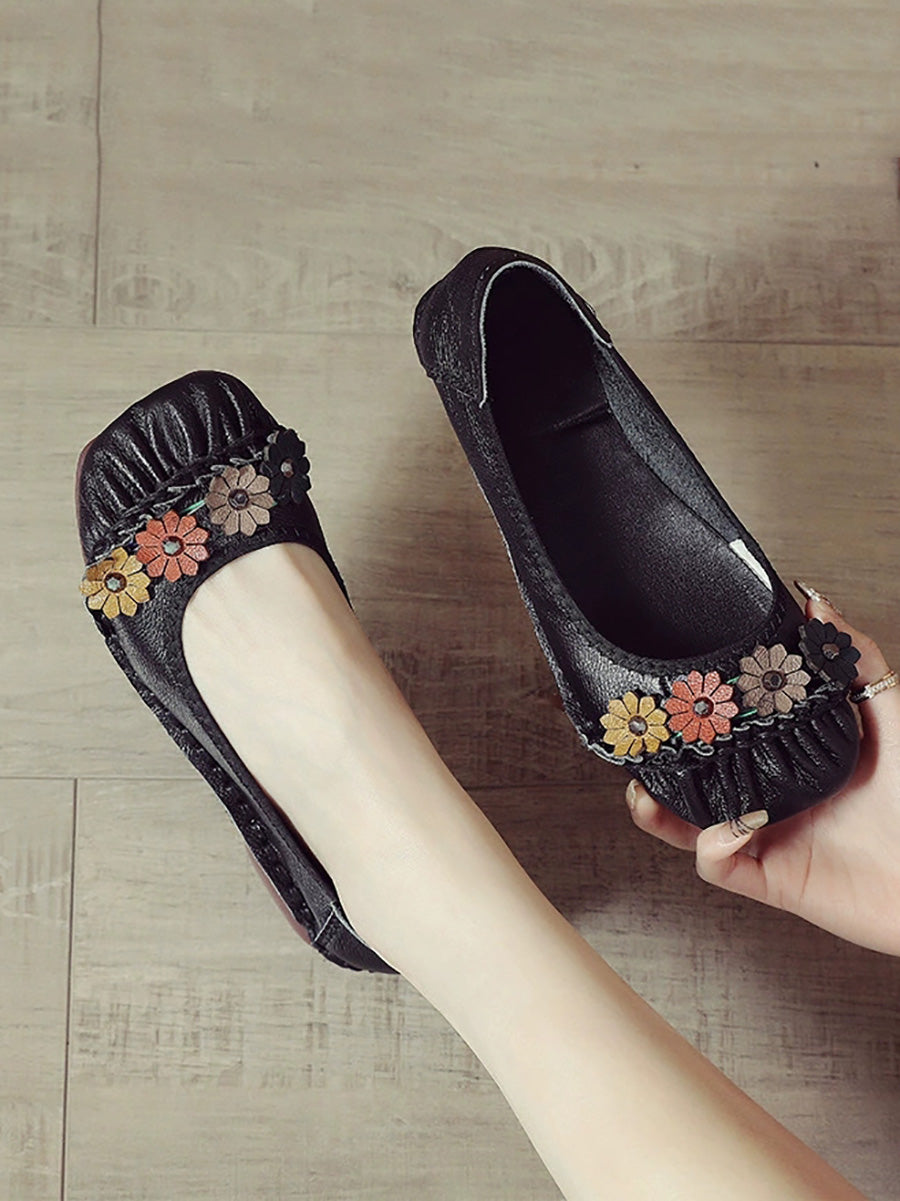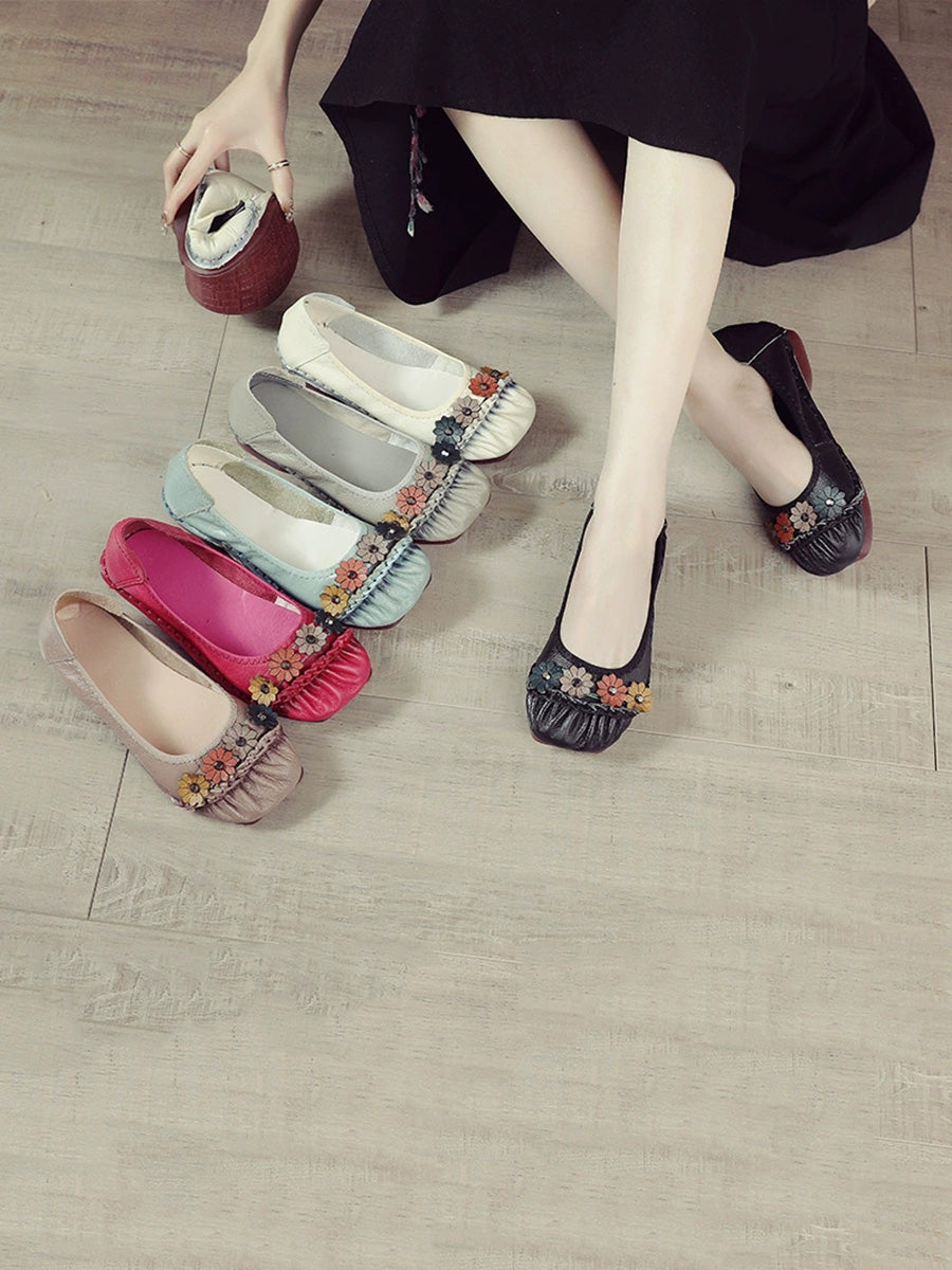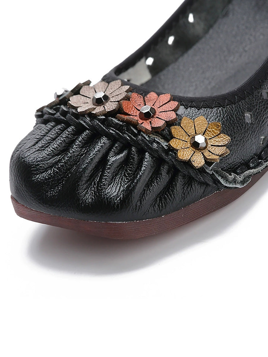 Women Vintage Flower Genuine Leather Low Heel Shoes