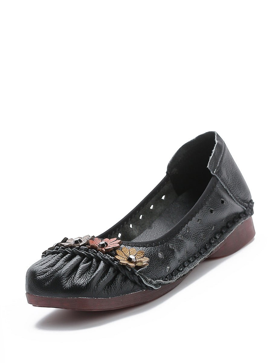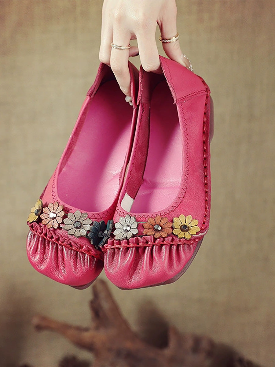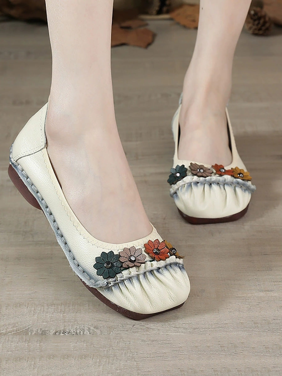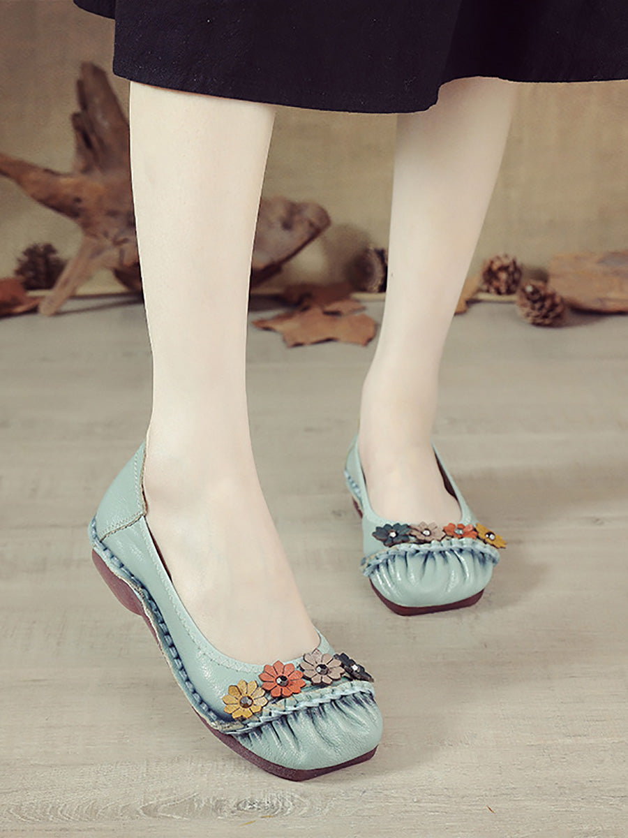 Women Vintage Flower Genuine Leather Low Heel Shoes