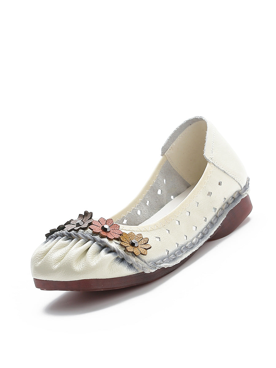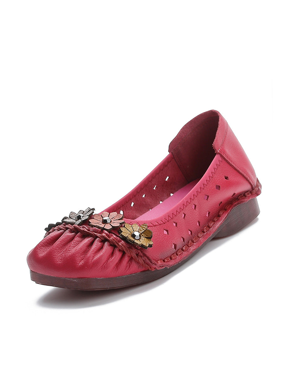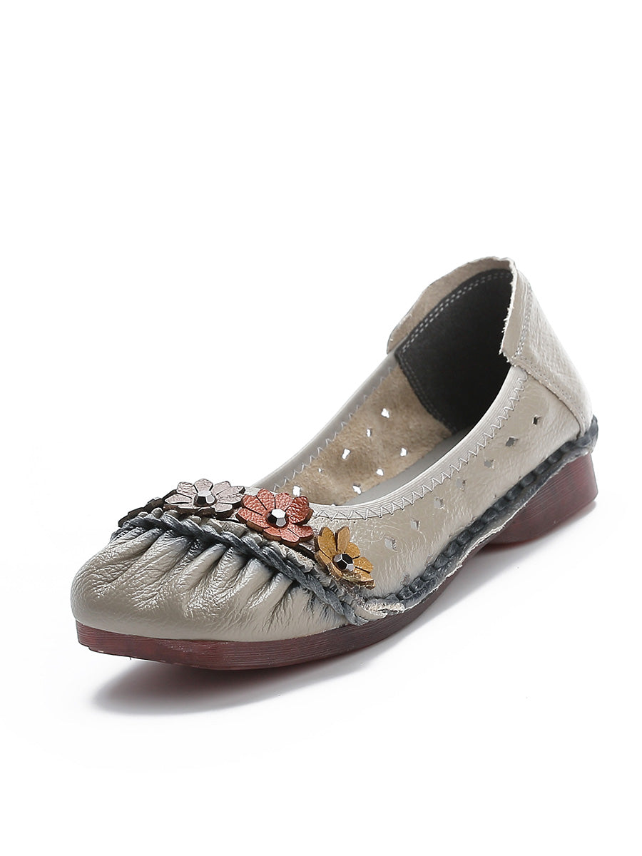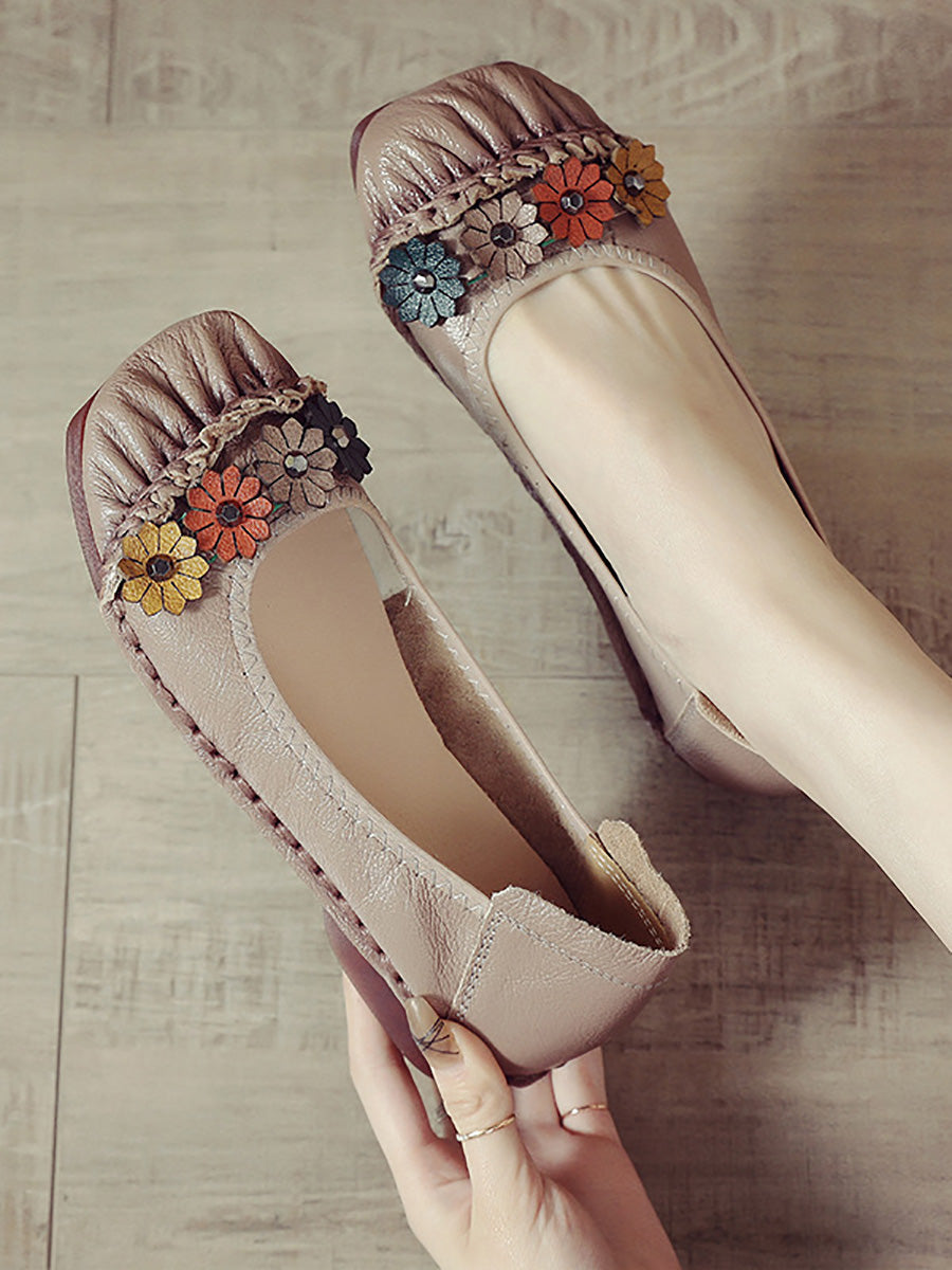 Women Vintage Flower Genuine Leather Low Heel Shoes