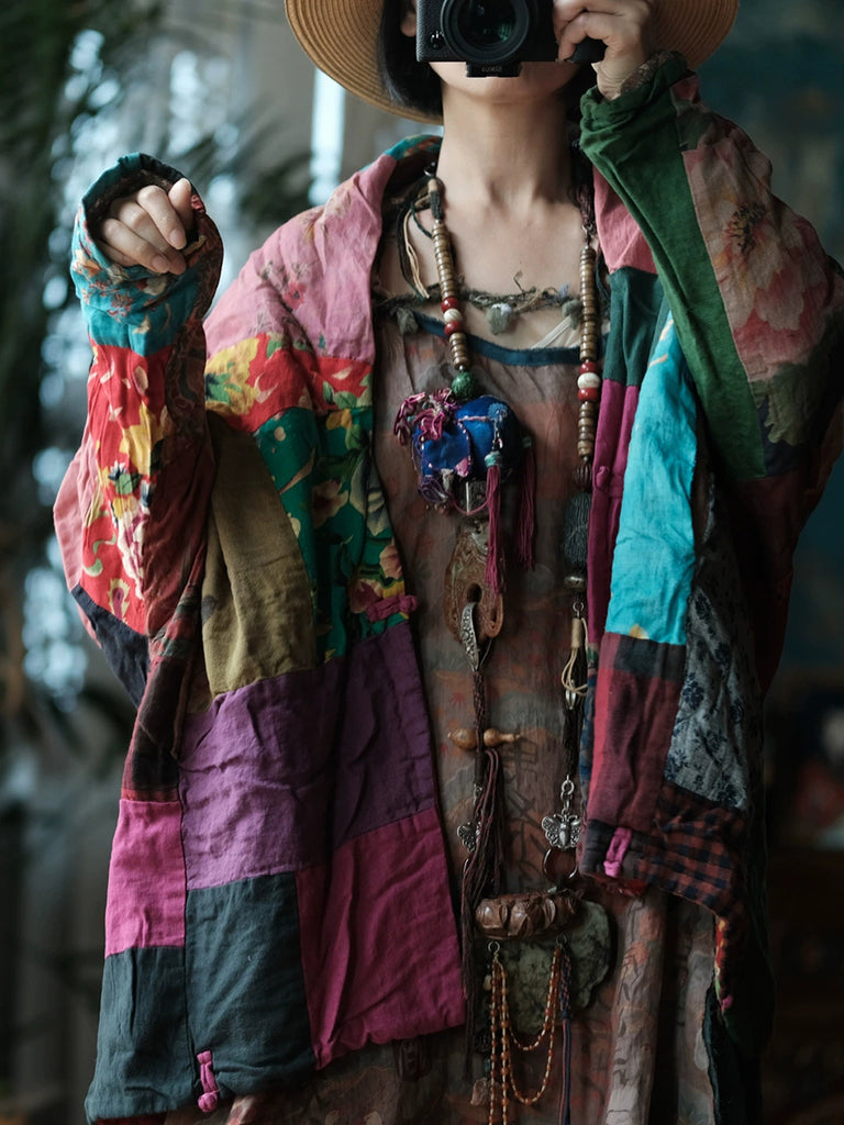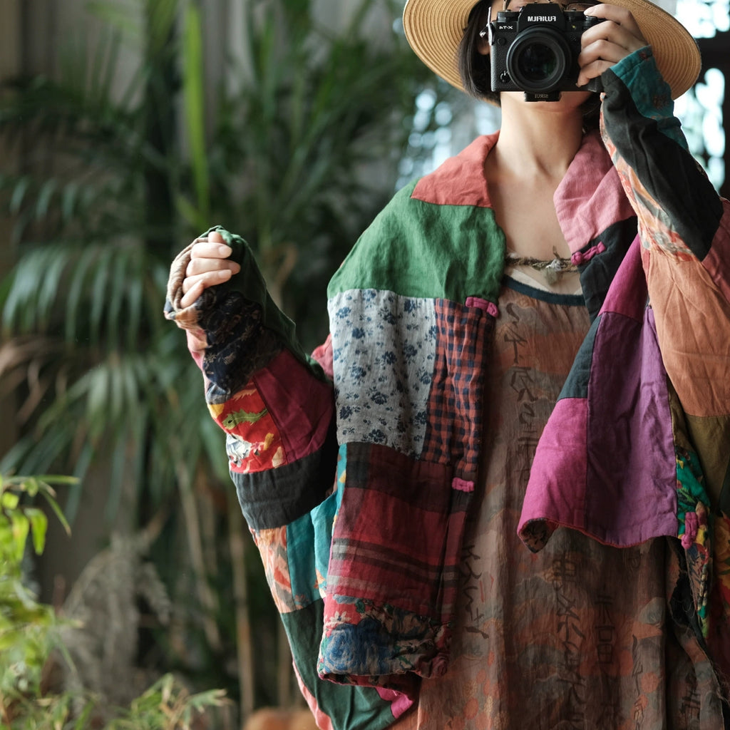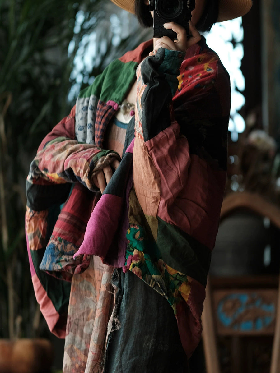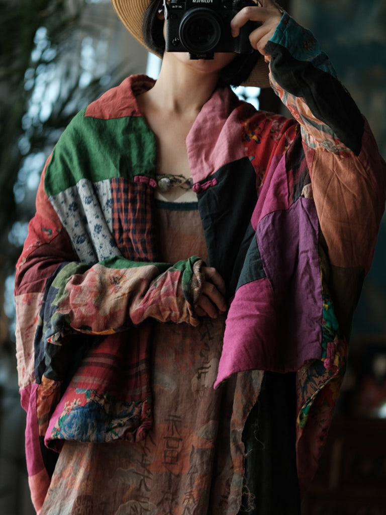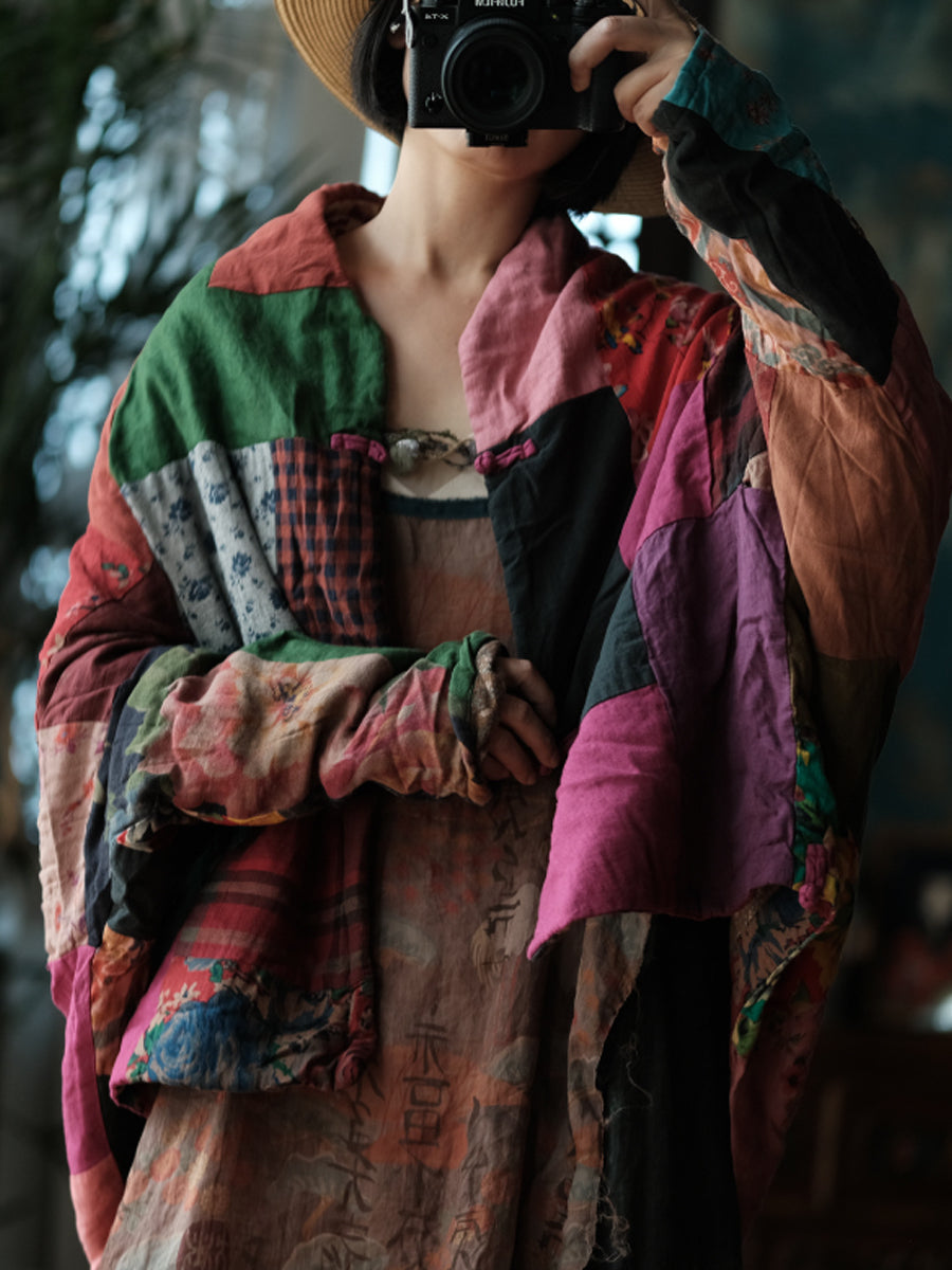 Women Vintage Patchwork Batwing Sleeve Cotton Padded Coat