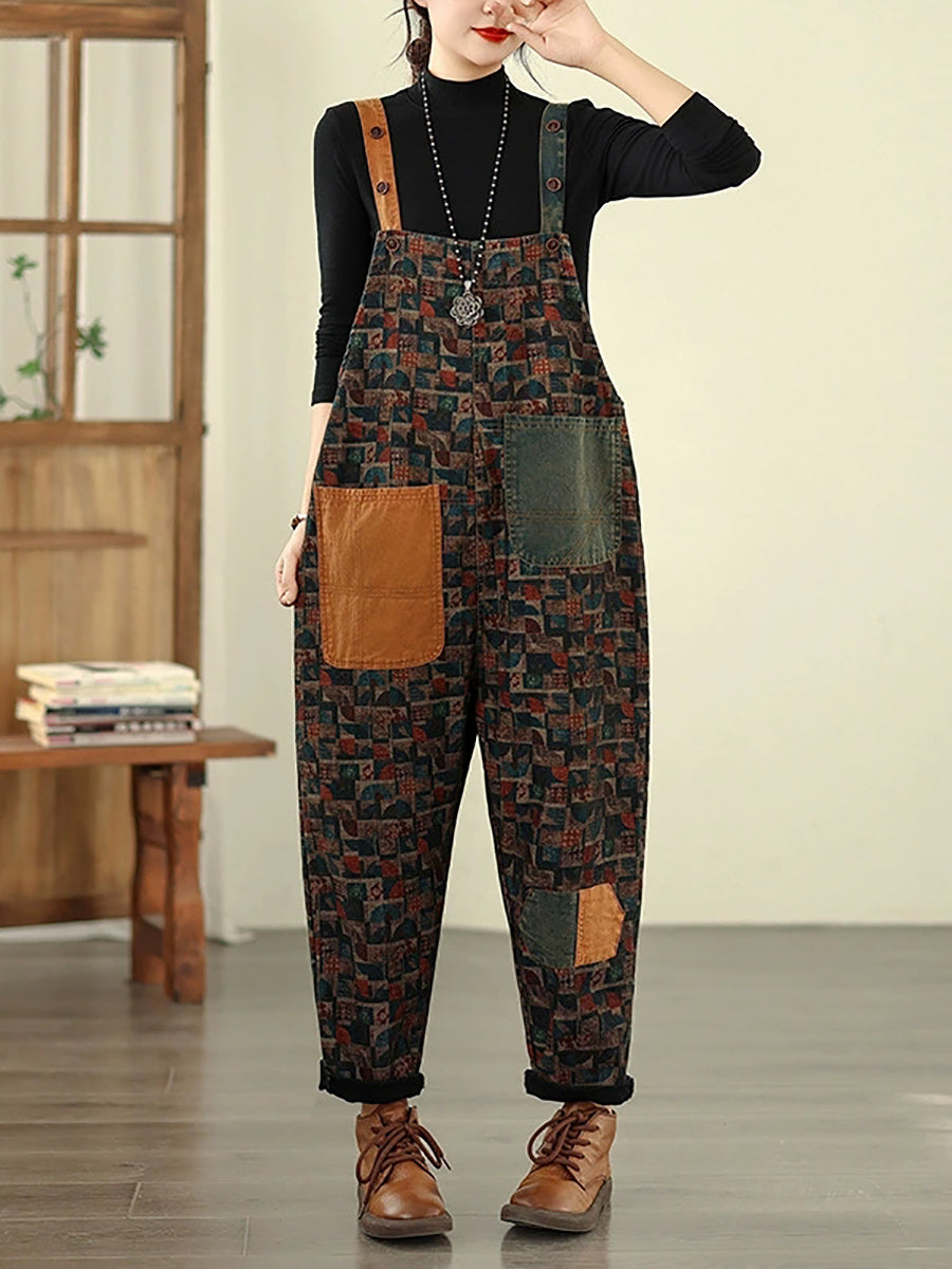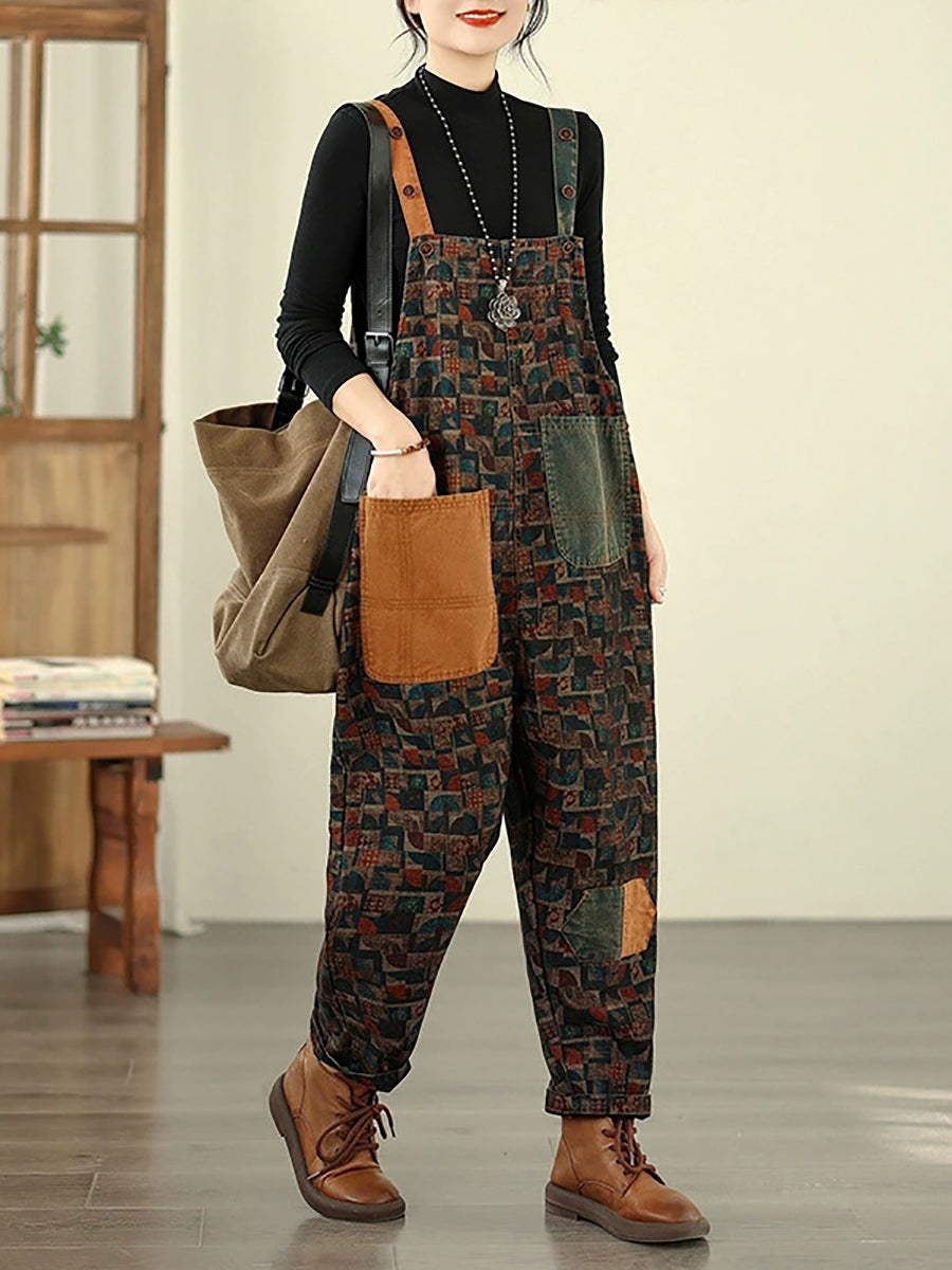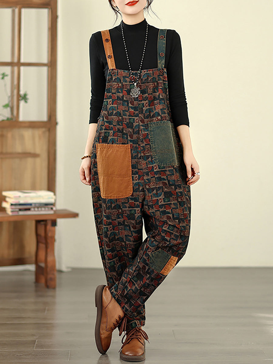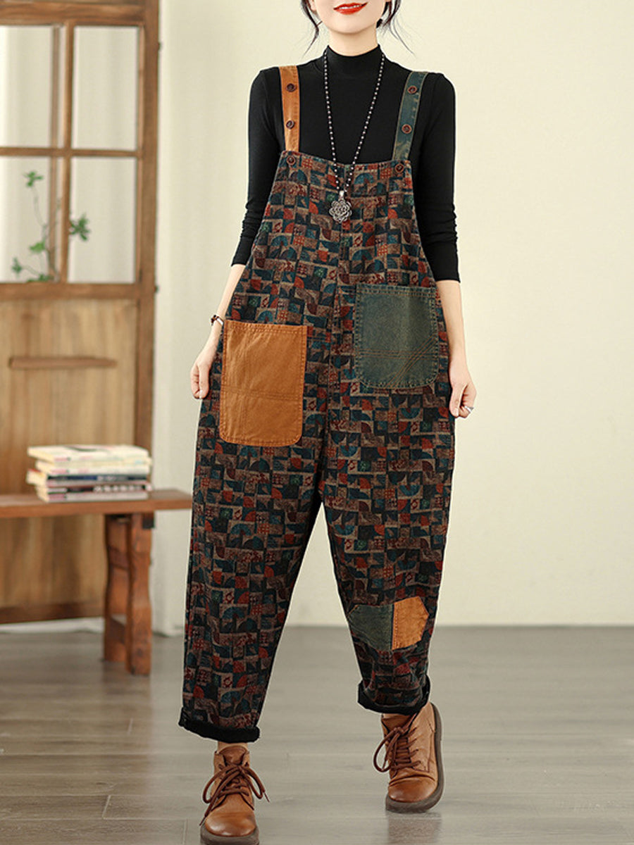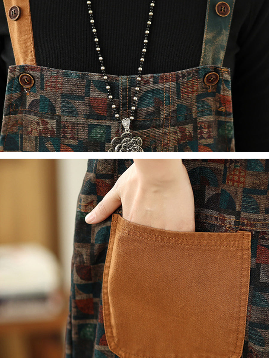 Women Vintage Patchwork Cotton Loose Denim Jumpsuits