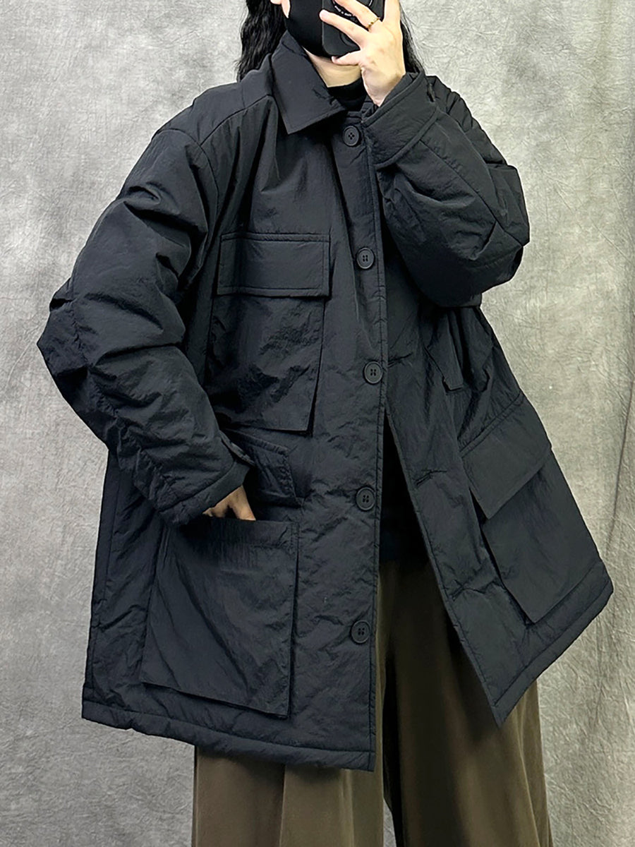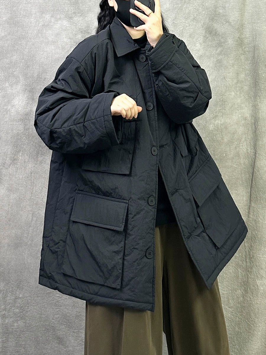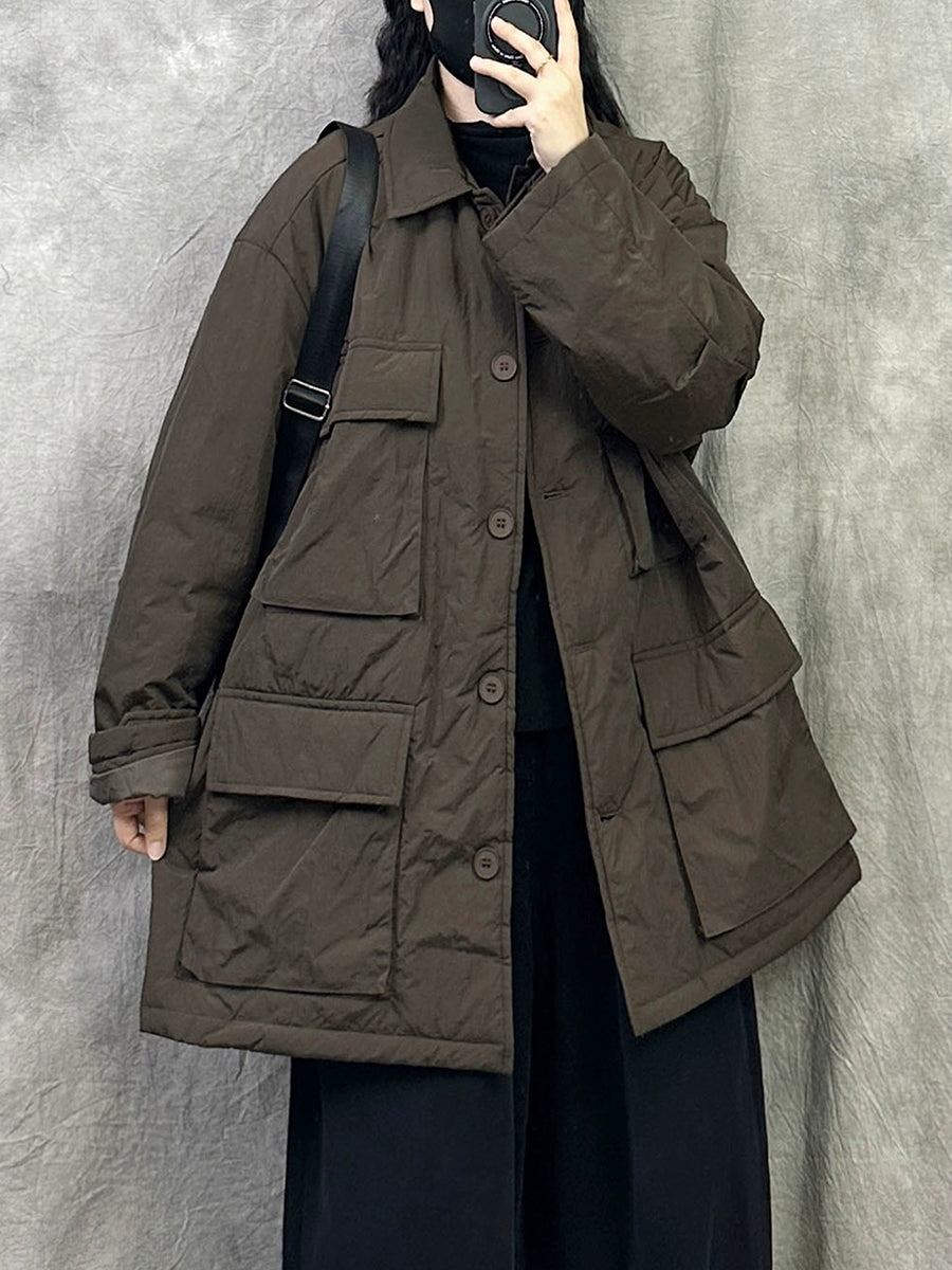 Women Vintage Pure Color Turn-down Collar Padded Coat