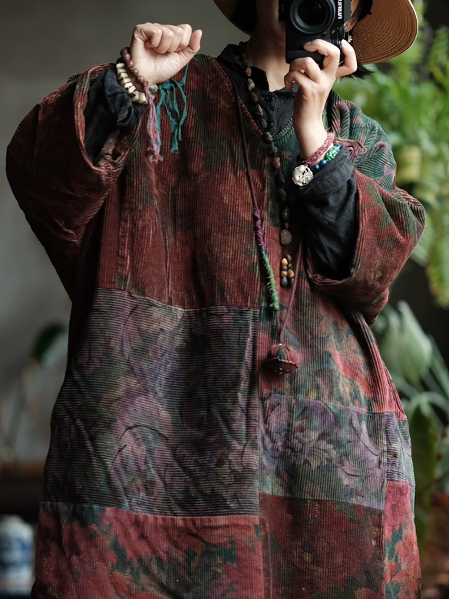 Women Vintage Winter Flower Cotton V-Neck Padded Coat