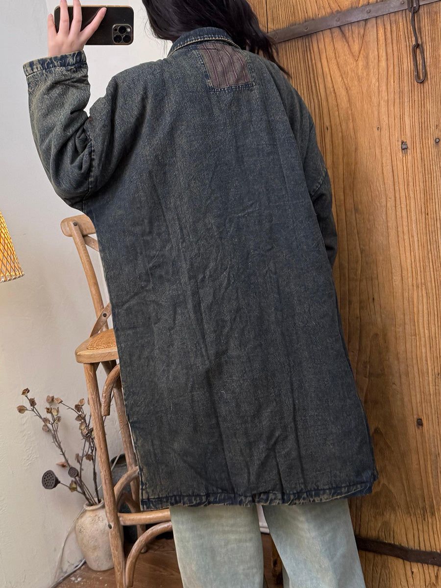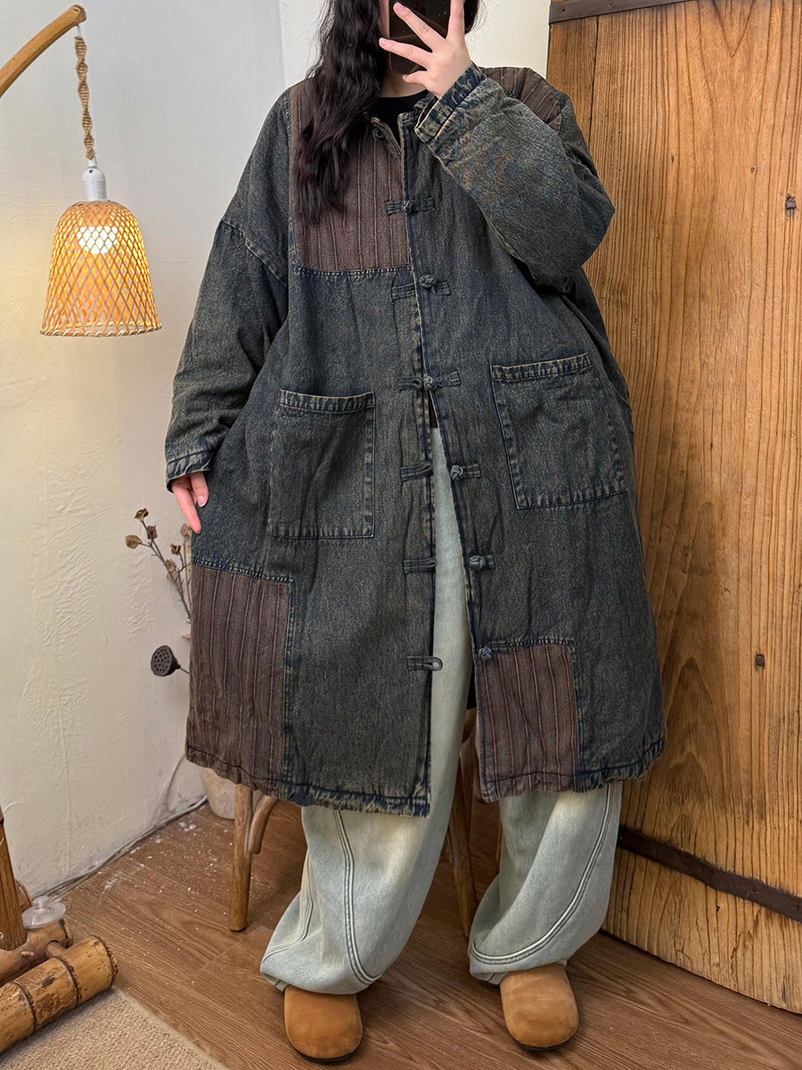 Women Vintage Winter Patchwork O-Neck Denim Coat
