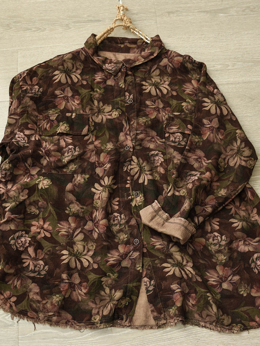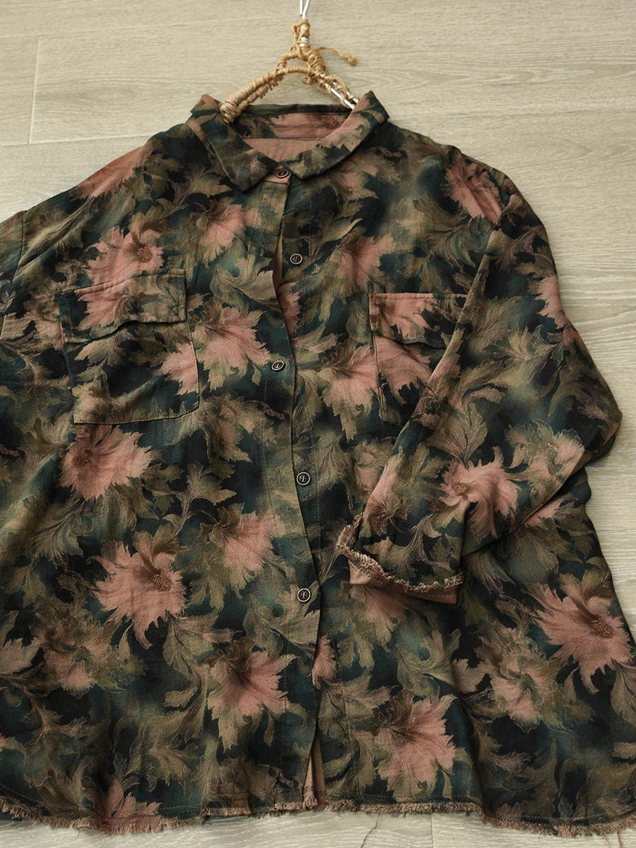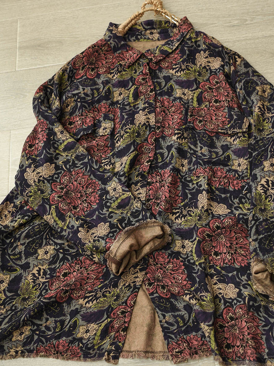 Women Winter Artsy Floral Turn-down Collar Cotton Shirt